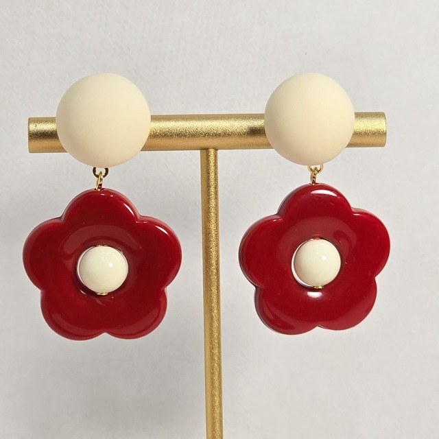 No.258レトロフラワー(マットホワイト×ダークレッド)ピアス&イヤリングピアス&イヤリング