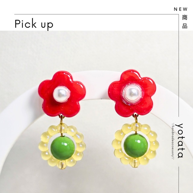 ⟬ バブルリングとポップなガラスフラワー(レッド)ピアス&イヤリング ⟭ ガラスで出来たレトロポップなフラワーパーツに、 アクリルのバブルリングと樹脂パールのグリーンローズを 合わせたピアス&イヤリング! 小ぶりだけど揺れる感じも欲しいという方におすすめ★ ̖́- カラーは4色展開!ぜひご覧ください♡ ▶同じカラーのガラスフラワー/一粒タイプもあります! ☞https://yotata.base.shop/items/110666413  ̄ ̄ ̄ ̄ ̄ ̄ ̄ ̄ ̄ ̄ ̄ ̄ ̄ ̄ ̄ ̄ ̄ ̄ ̄ ̄ ̄ ̄ ▶ピアス/イヤリングに変更可能です! (各購入オプションよりご選択下さい) 【ピアス】金具変更:丸皿 【イヤリング】金具変更:丸皿  ̄ ̄ ̄ ̄ ̄ ̄ ̄ ̄ ̄ ̄ ̄ ̄ ̄ ̄ ̄ ̄ ̄ ̄ ̄ ̄ ̄ ̄ ▶金属アレルギーの方でも安心してご使用いただけるように、チタン・サージカルステンレス・ニッケルフリーのピアス/イヤリング金具をご用意しています! ▶イヤリング金具には 無料でシリコンカバーをお付けいたします。 ▶数量限定となります (他サイトでも販売しておりますのでsold out次第、 こちらも販売終了いたします。予めご了承ください。) ◯サイズ:3cm ◯素材:ガラス/アクリル/樹脂/真鍮/レジン ご不明点がありましたらお気軽にお問い合わせください❁ ■配送方法 ・発送はクリックポストとなります。 ・追跡がついておりますので安心です。 ・ご自宅のポストに届きます。 ・土日も配送可能です。 ・概ね発送日の翌日から翌々日にお届けします。 ■4000円以上で送料無料!⸜♡⸝ ■5500円以上でノベルティプレゼント!❁ ぜひ、お迎えください♡ ☞レトロかわいい×レトロポップ ♡┈┈┈┈┈┈┈┈┈┈┈┈┈┈┈┈┈┈┈┈┈┈♡ ■その他の作品はこちらからご覧いただけます ☞https://yotata.base.shop/ ■新作情報はInstagram/Threadsにて発信しています ☞https://www.instagram.com/yotata._.63 ♡┈┈┈┈┈┈┈┈┈┈┈┈┈┈┈┈┈┈┈┈┈┈♡