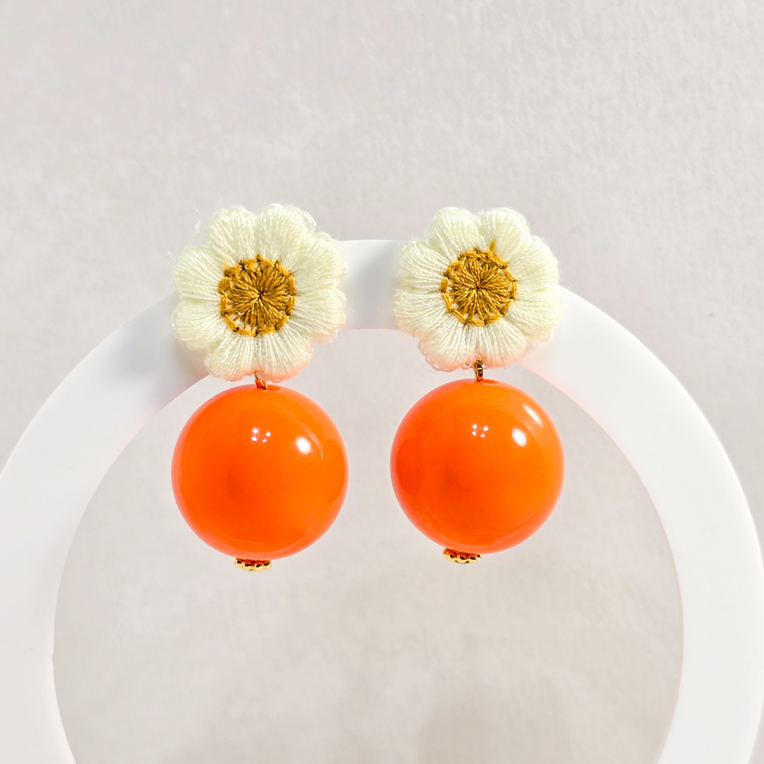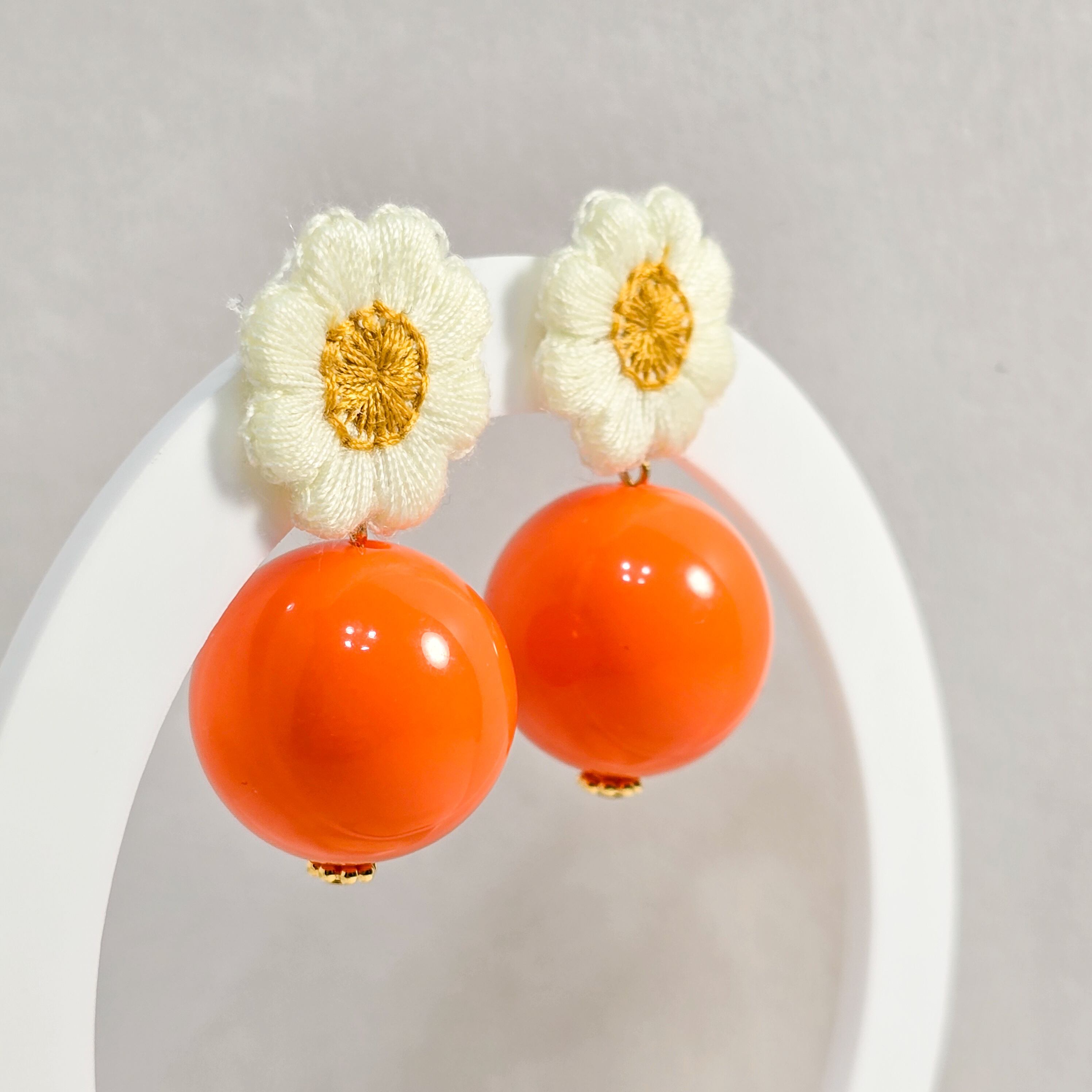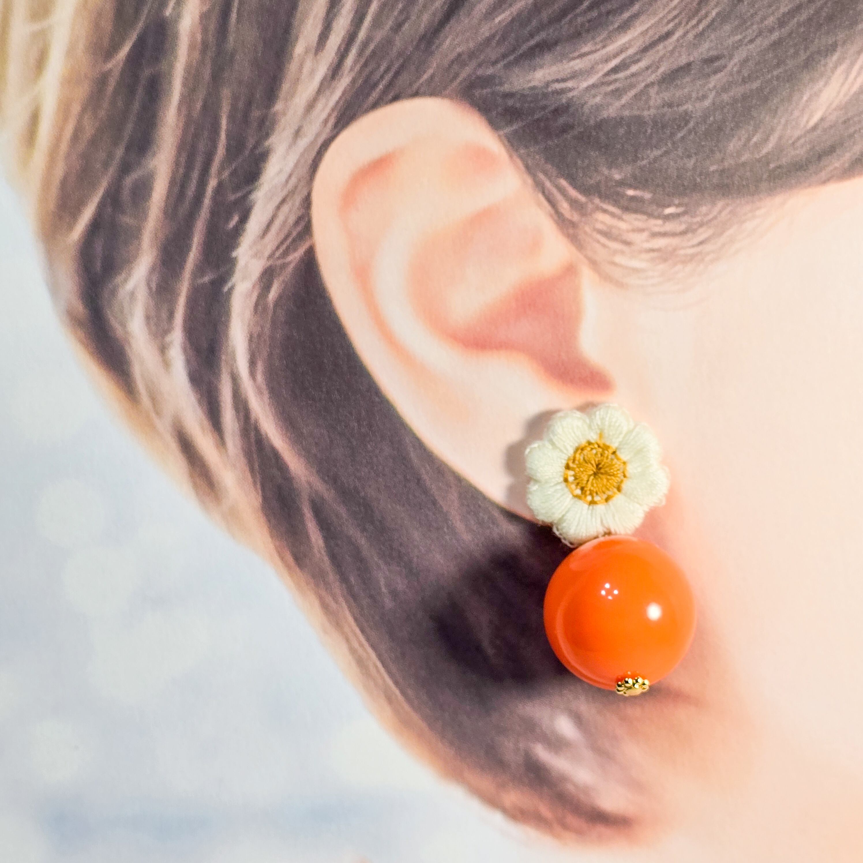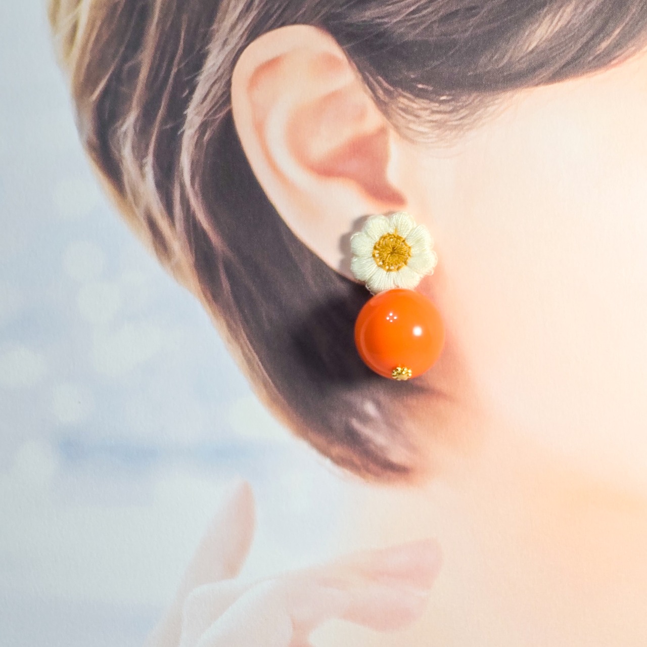 ⟬ 白いお花とオレンジの大ぶりピアス&イヤリング ⟭