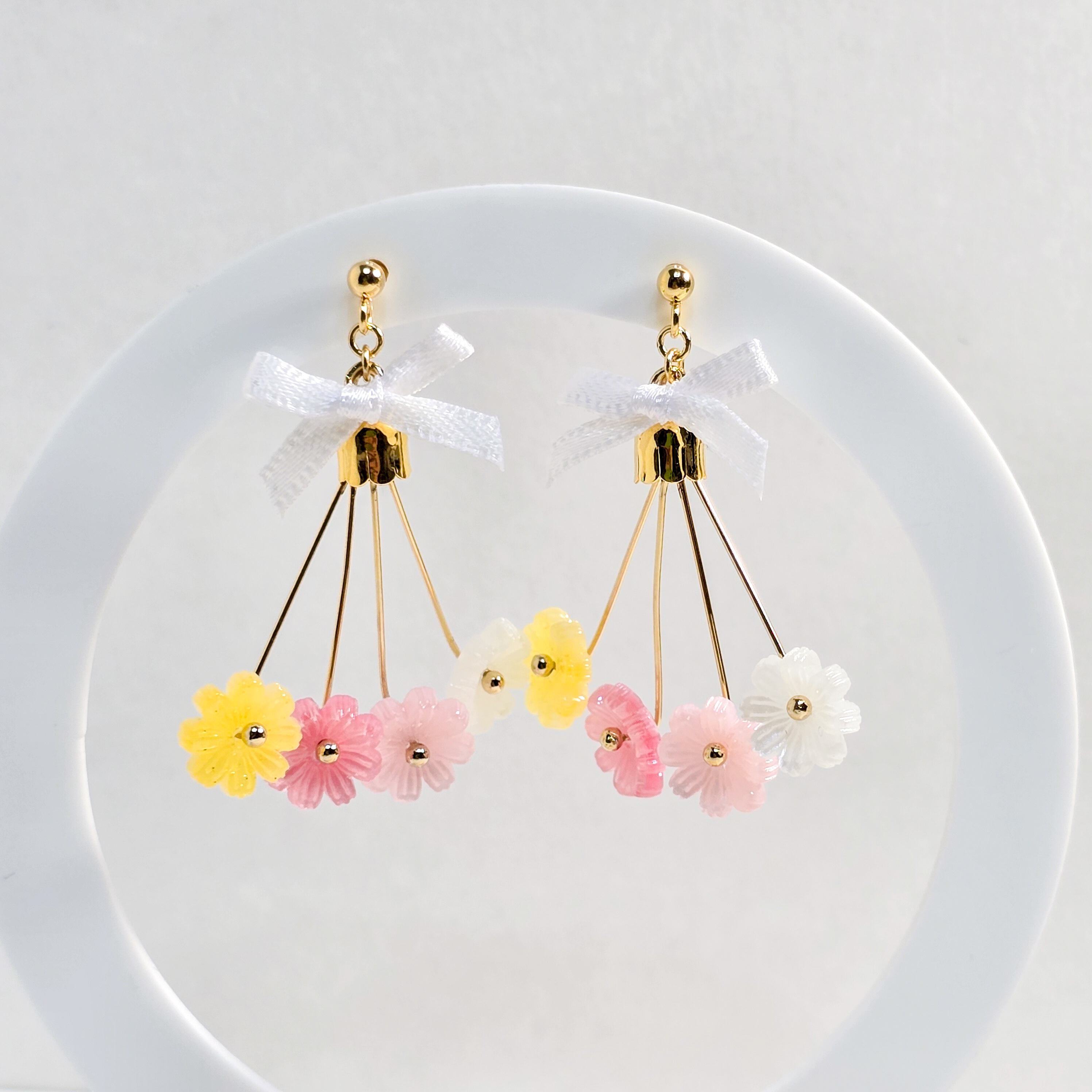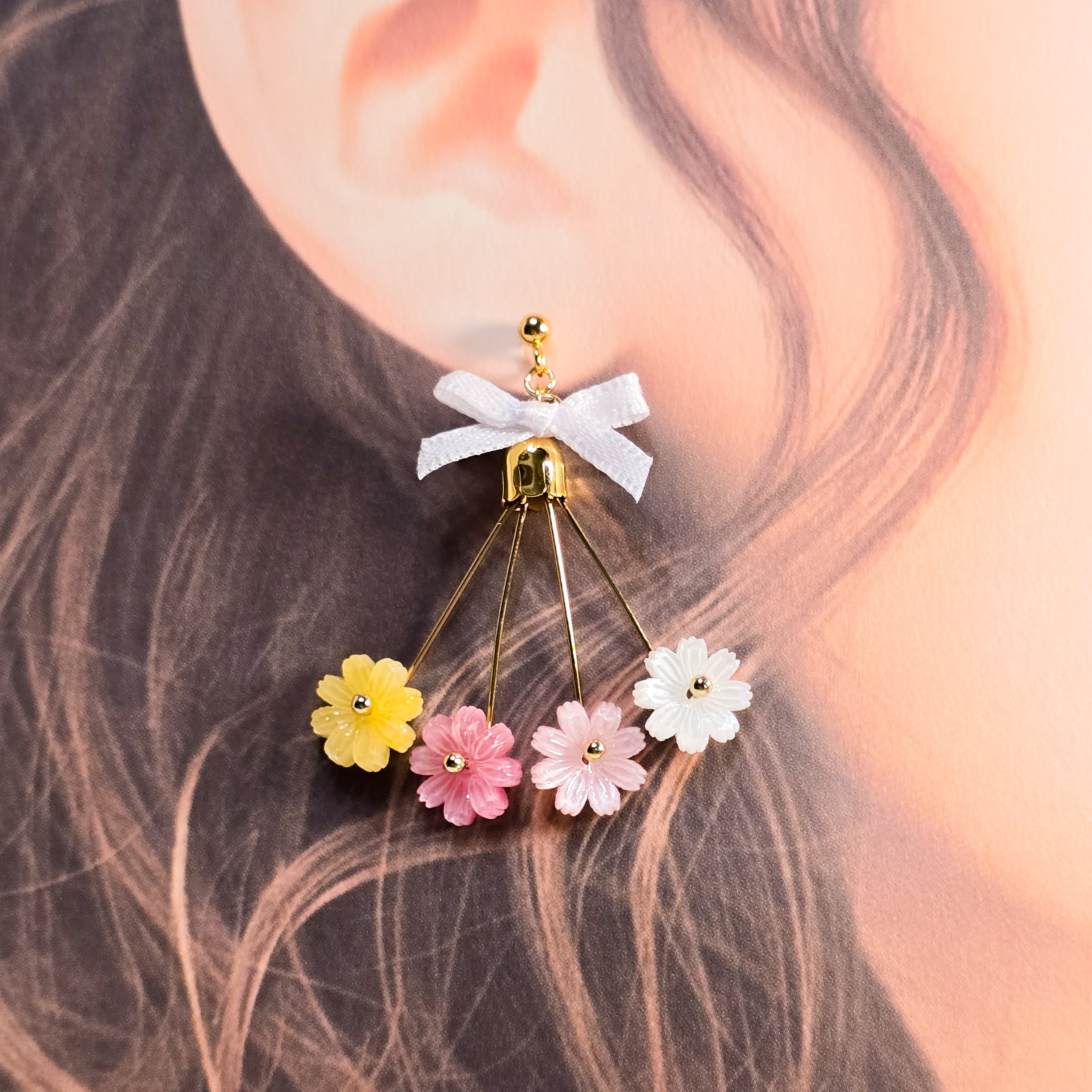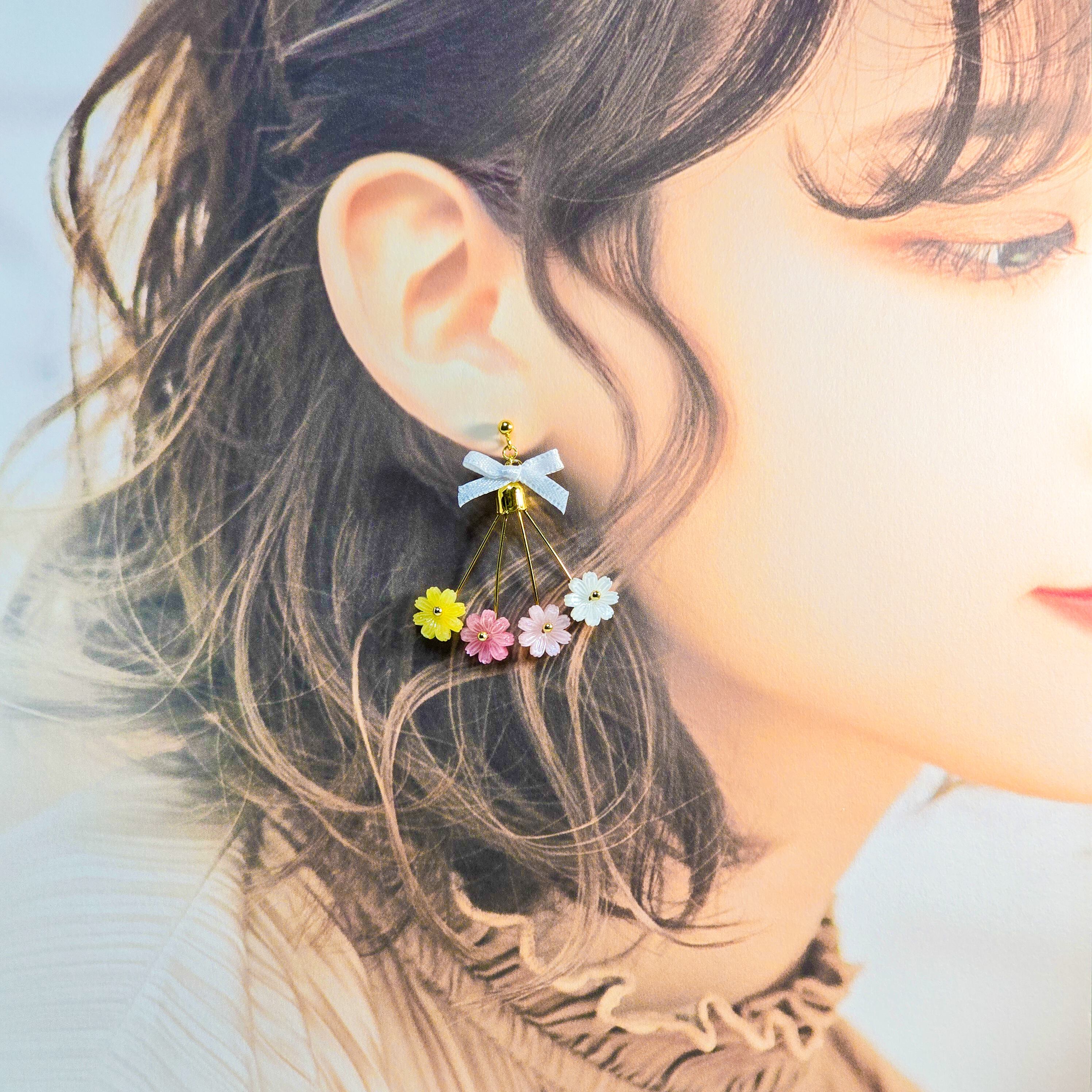 耳元で揺れる花束のモチーフが、シンプルなスタイルにも華やかさを添え、リボンの上品なデザインと合わせて女性らしさを一層際立たせます。