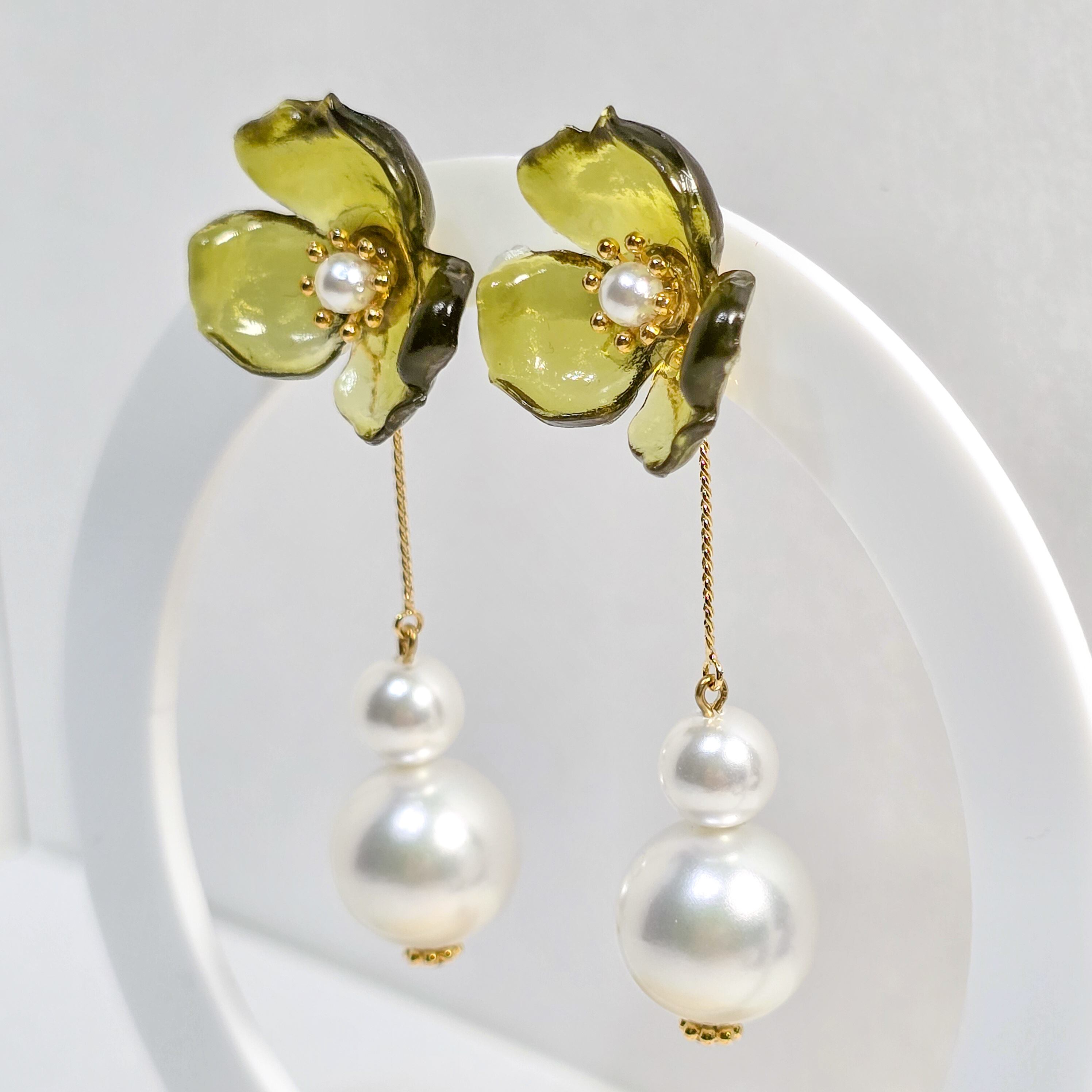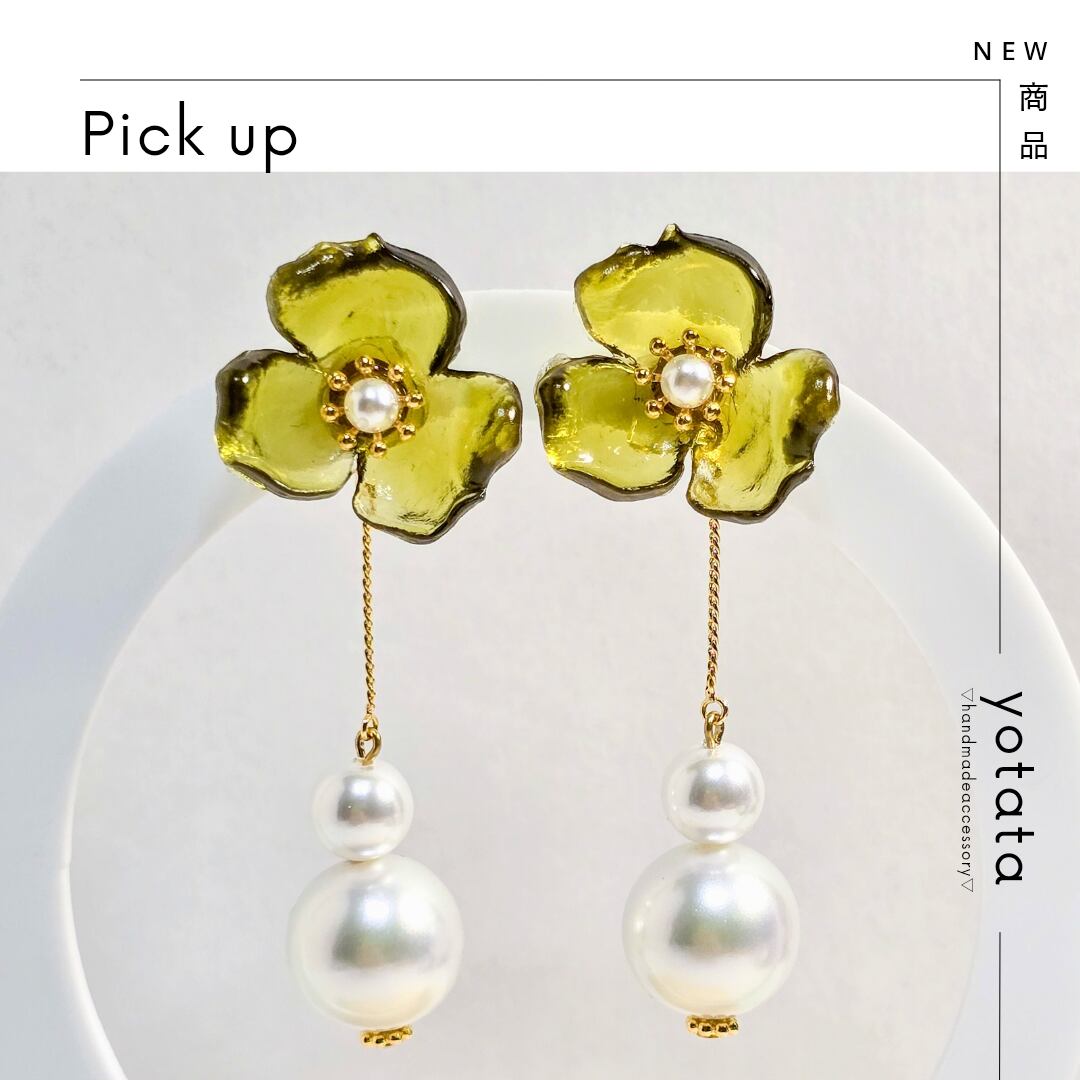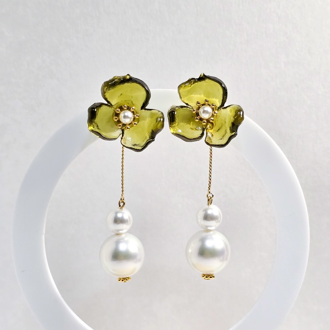 エレガントなライトオリーブのカラーを基調に、2連のパールが華やかさを演出するロングチェーンのピアス&イヤリングです❁︎