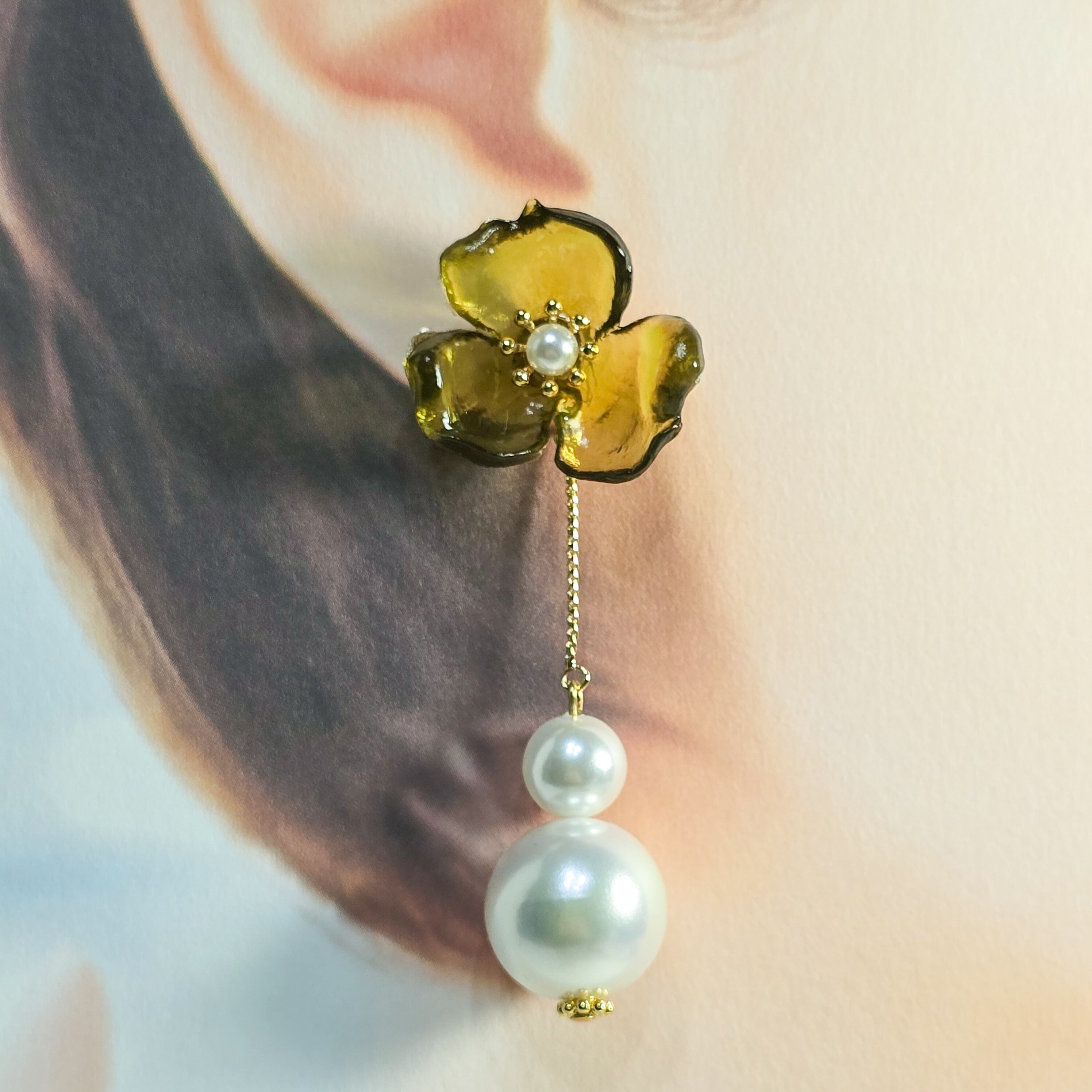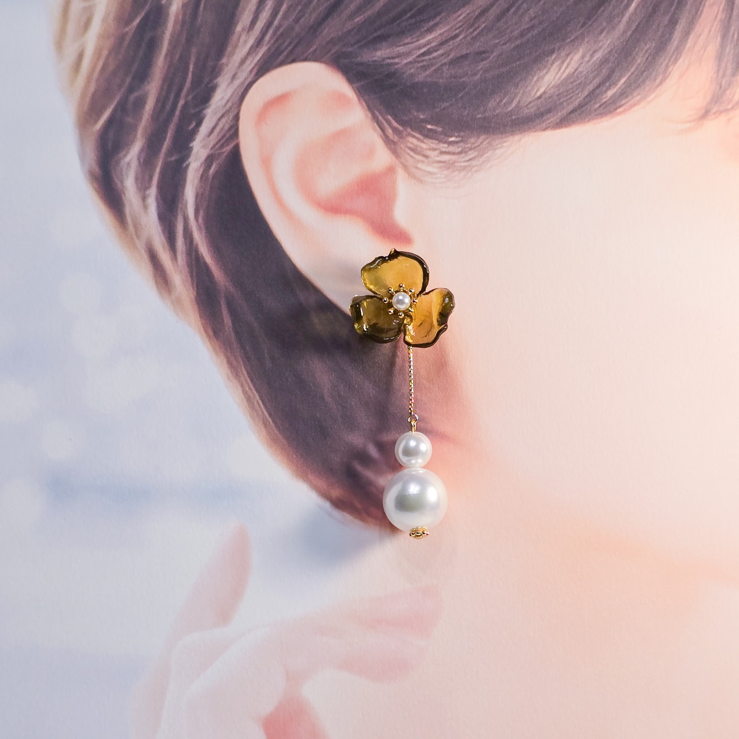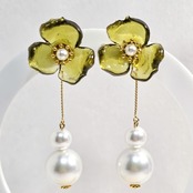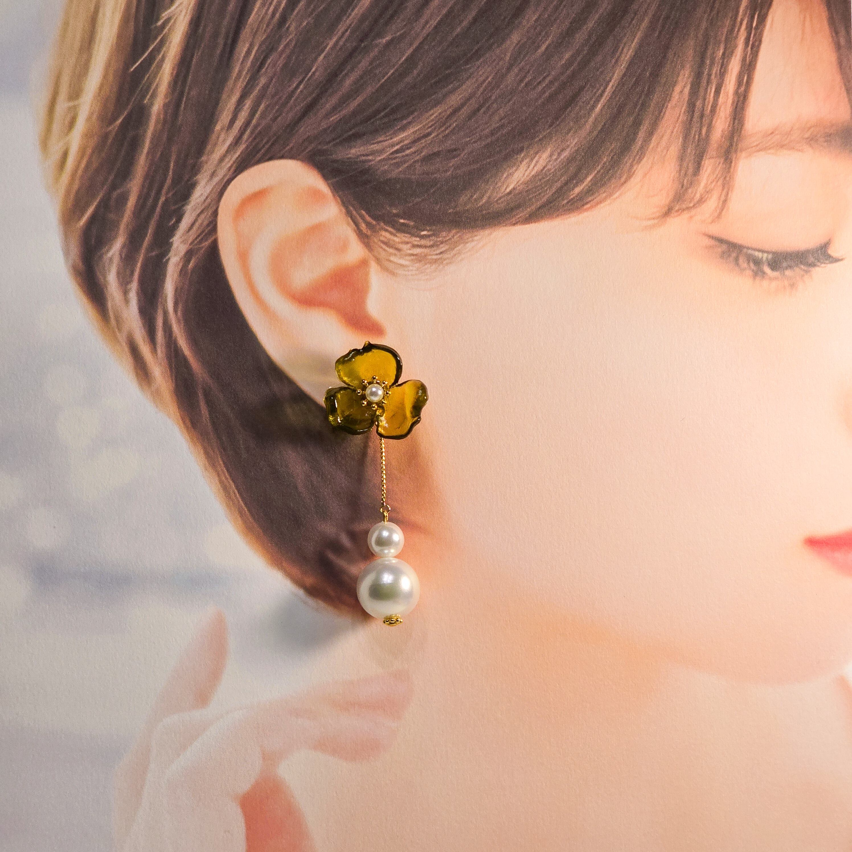 エレガントなライトオリーブのカラーを基調に、2連のパールが華やかさを演出するロングチェーンのピアス&イヤリングです❁︎
