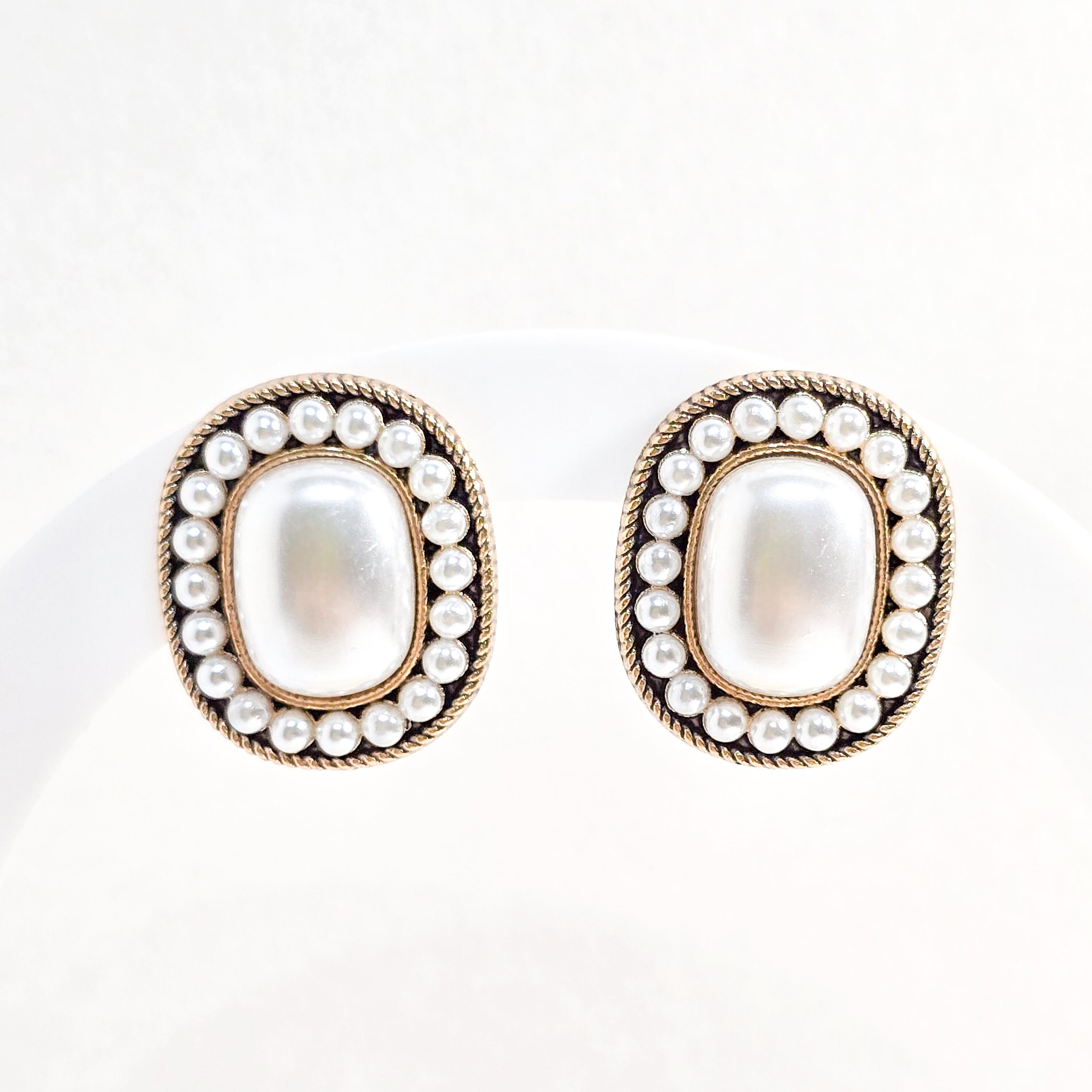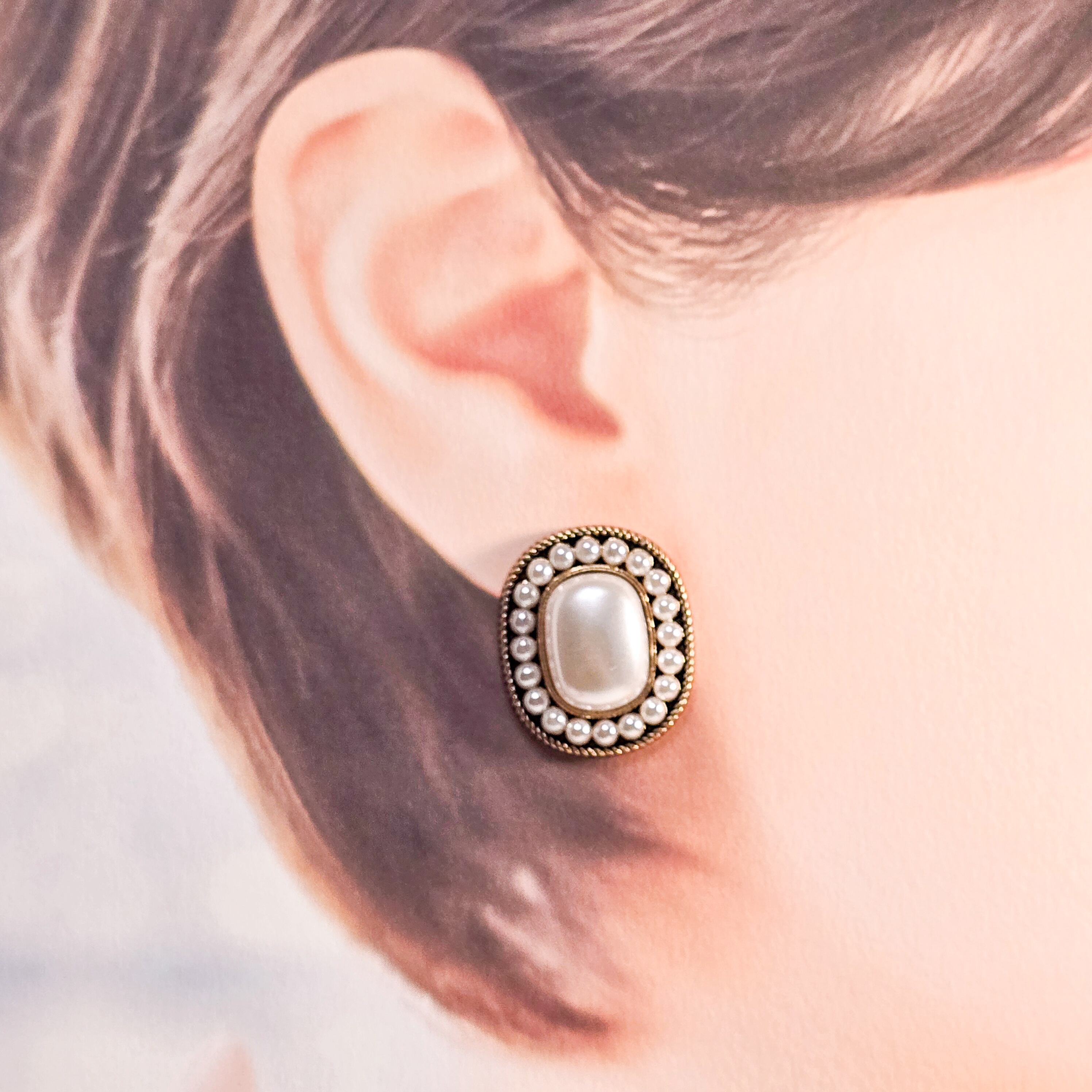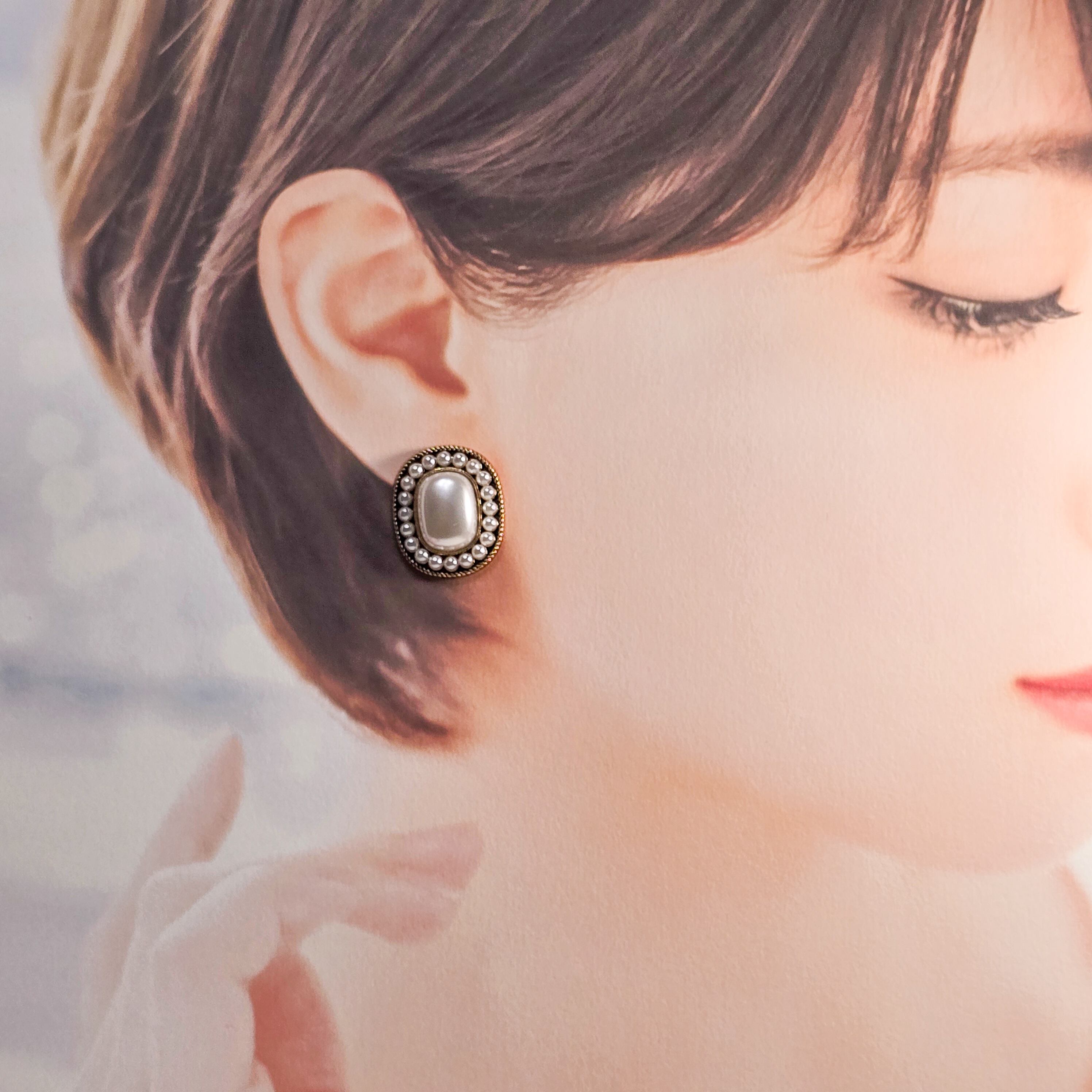 ⟬ アンティークなパール付きスクエアカボションボタンピアス&イヤリング ⟭
