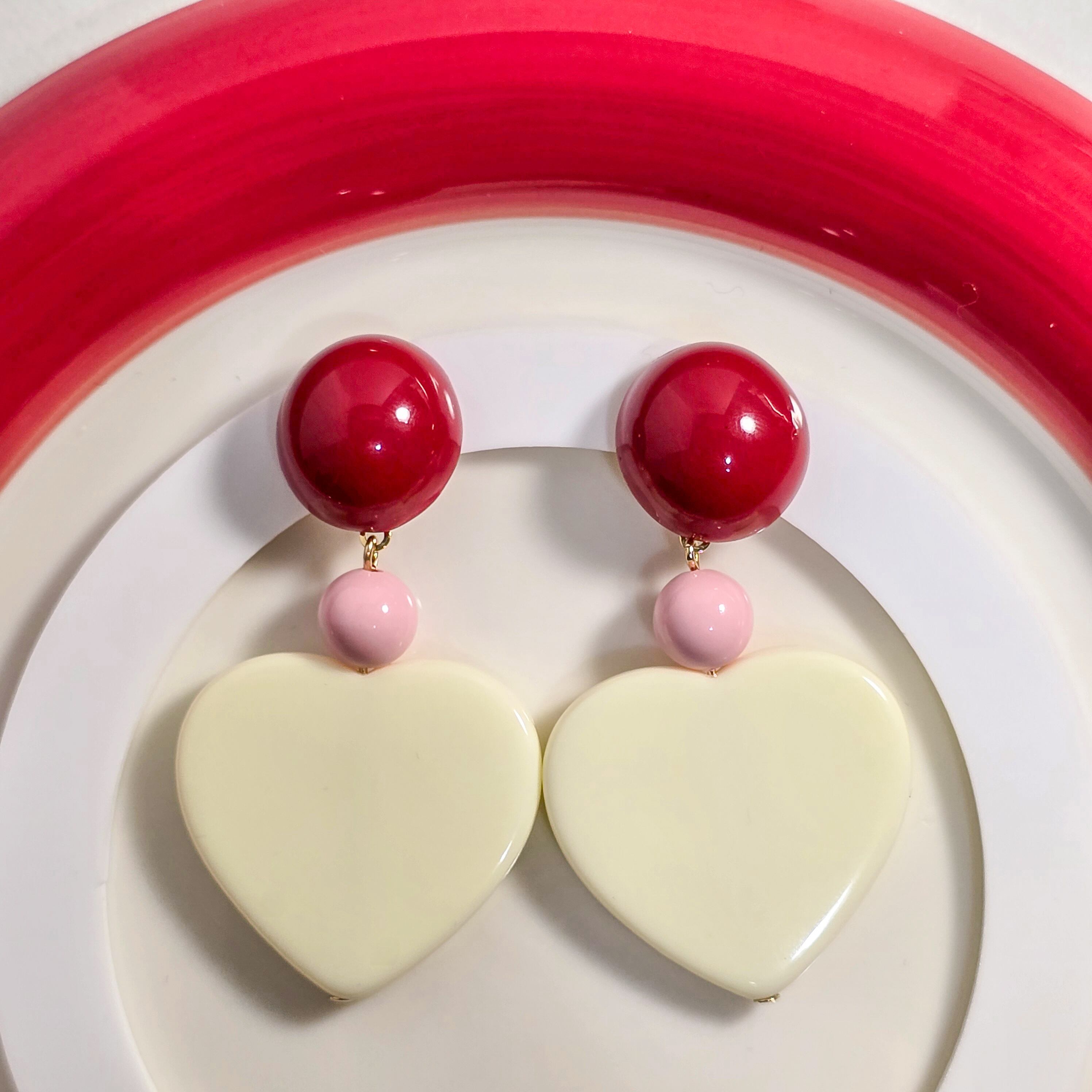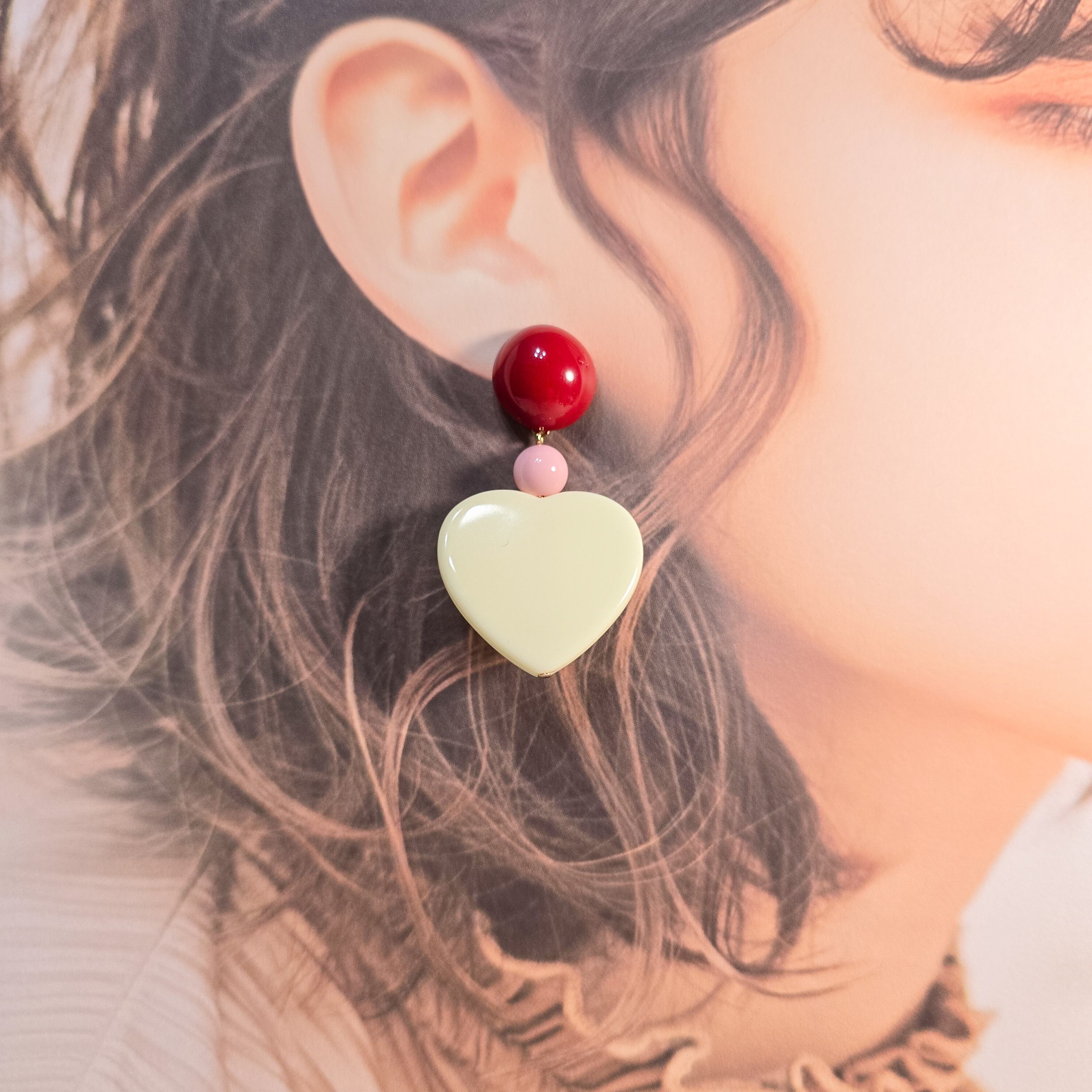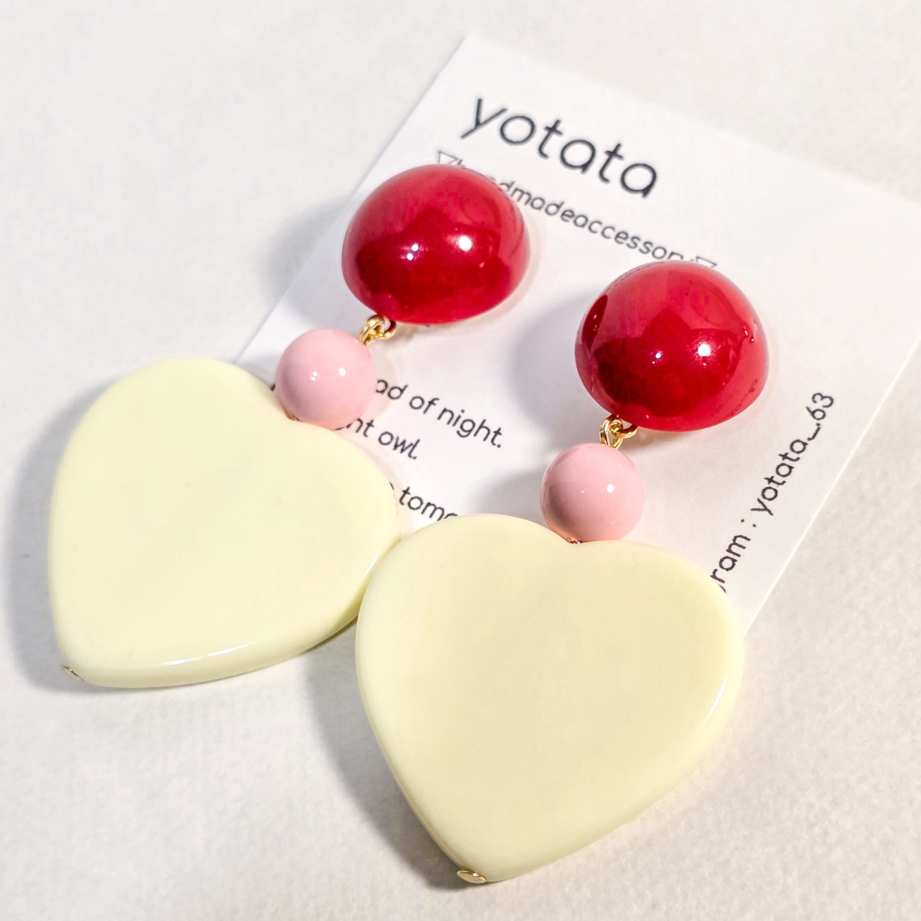 ⟬ レッド×ミルキーホワイトの大ぶりハートピアス&イヤリング ⟭