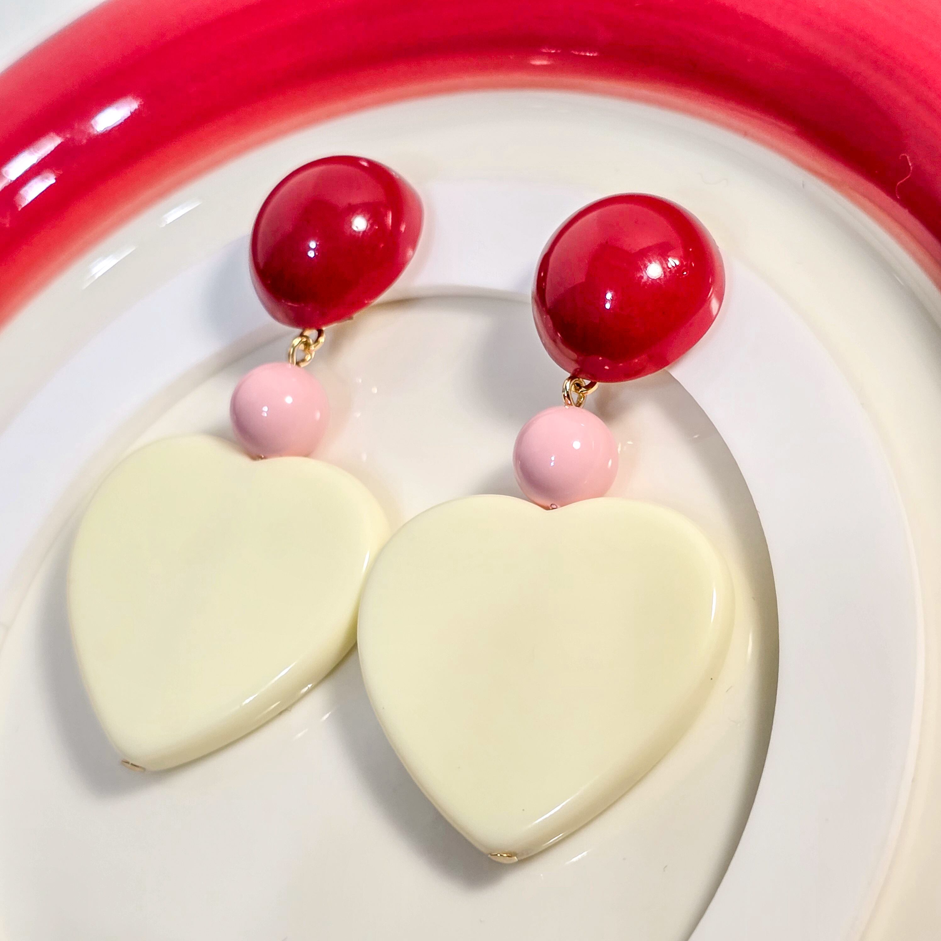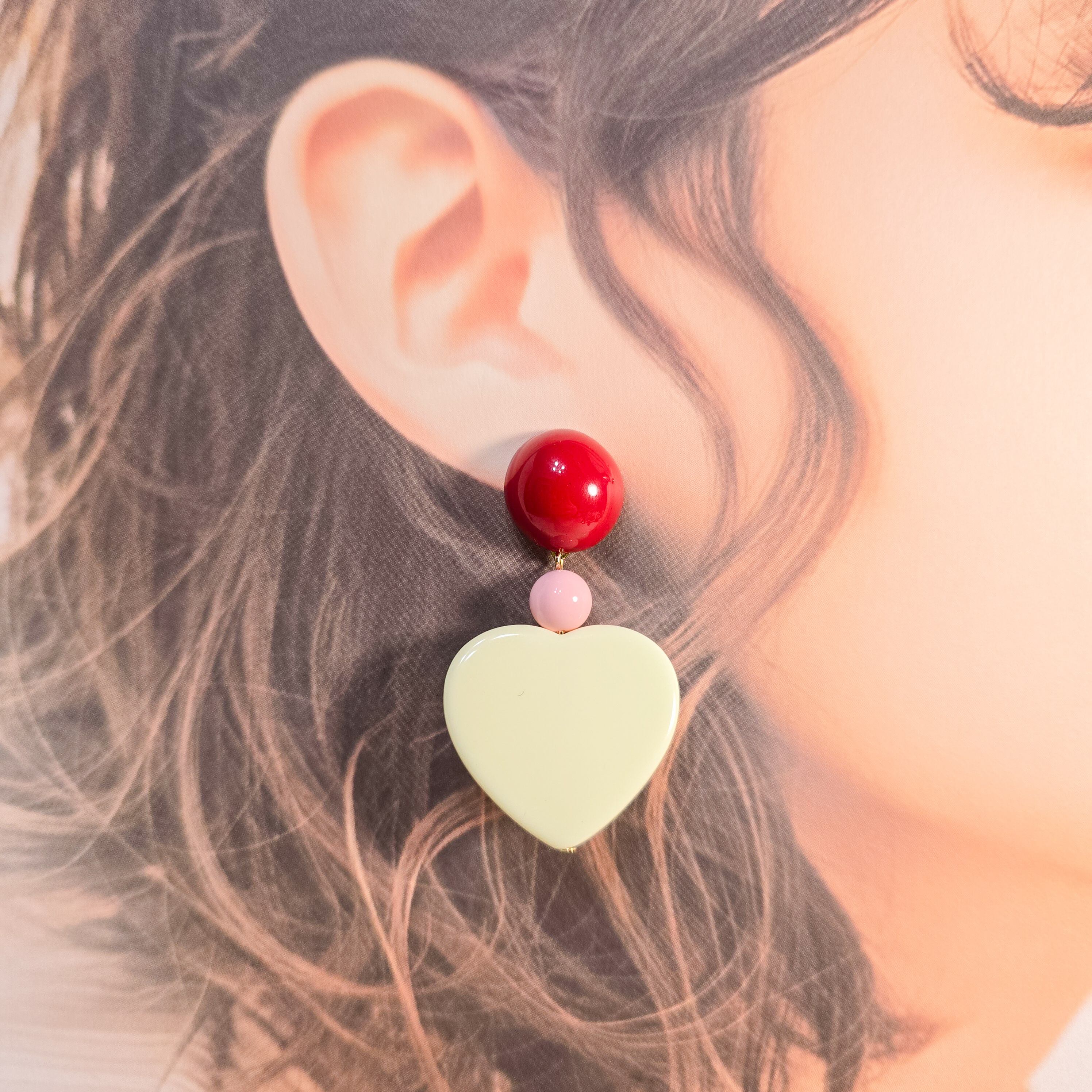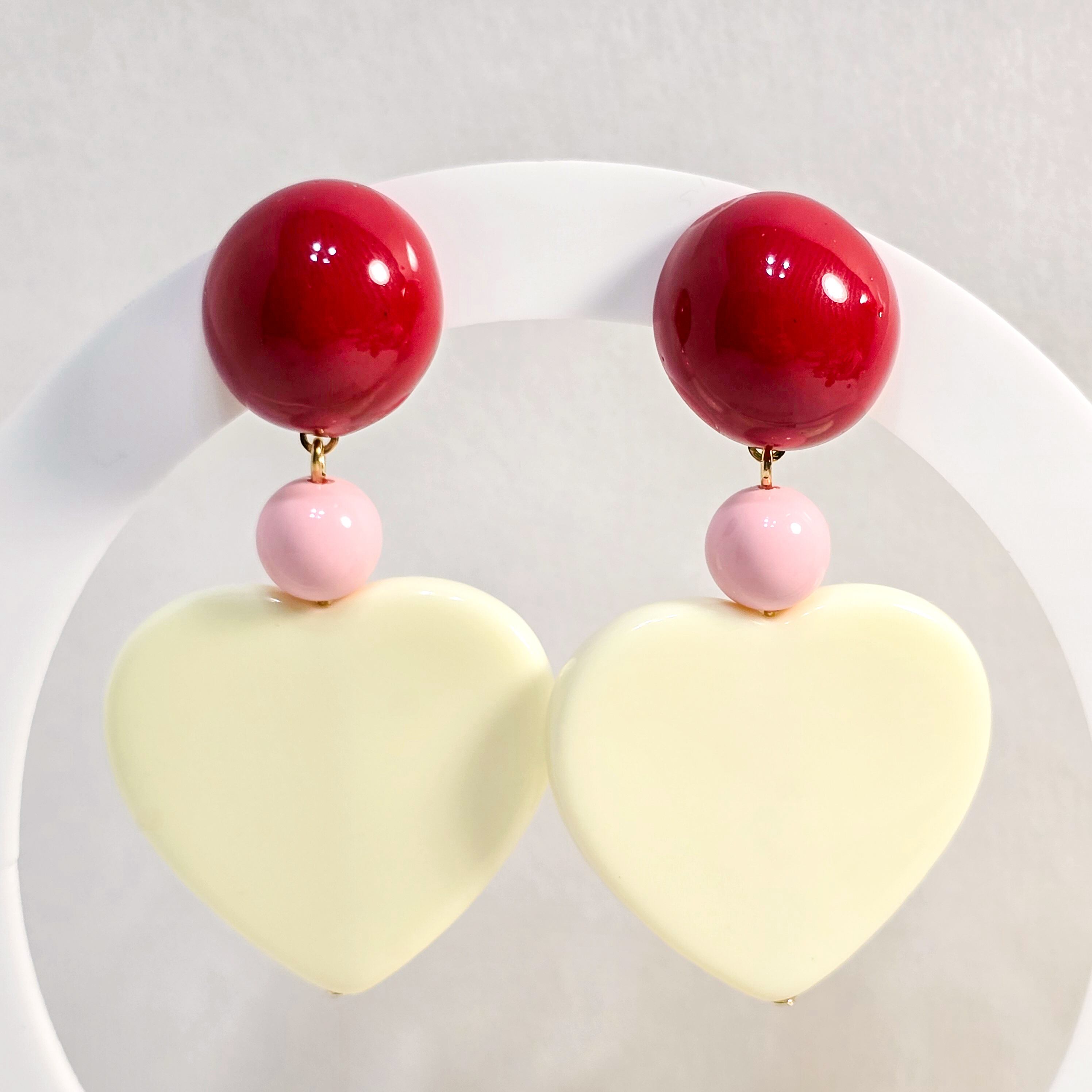 ⟬ レッド×ミルキーホワイトの大ぶりハートピアス&イヤリング ⟭