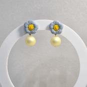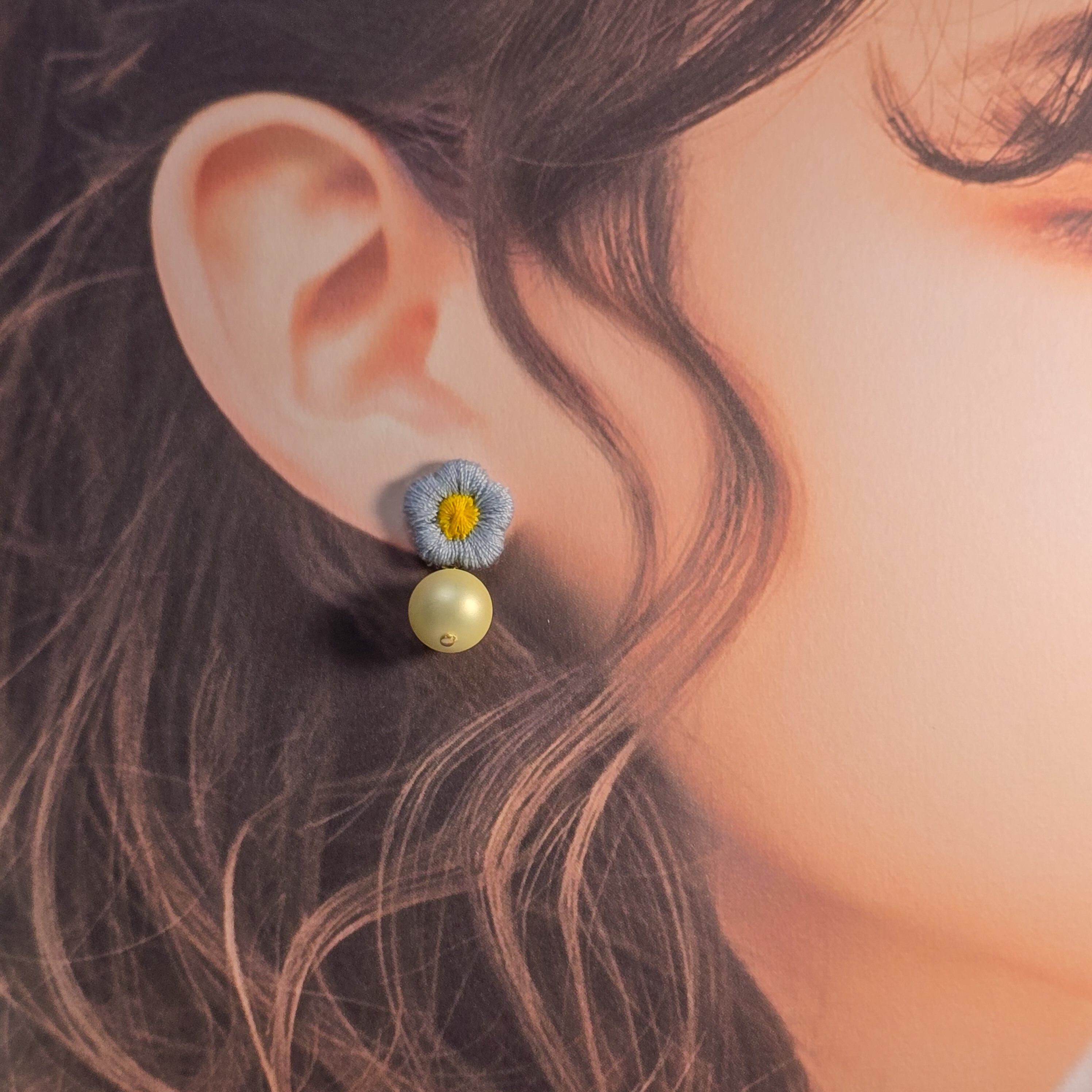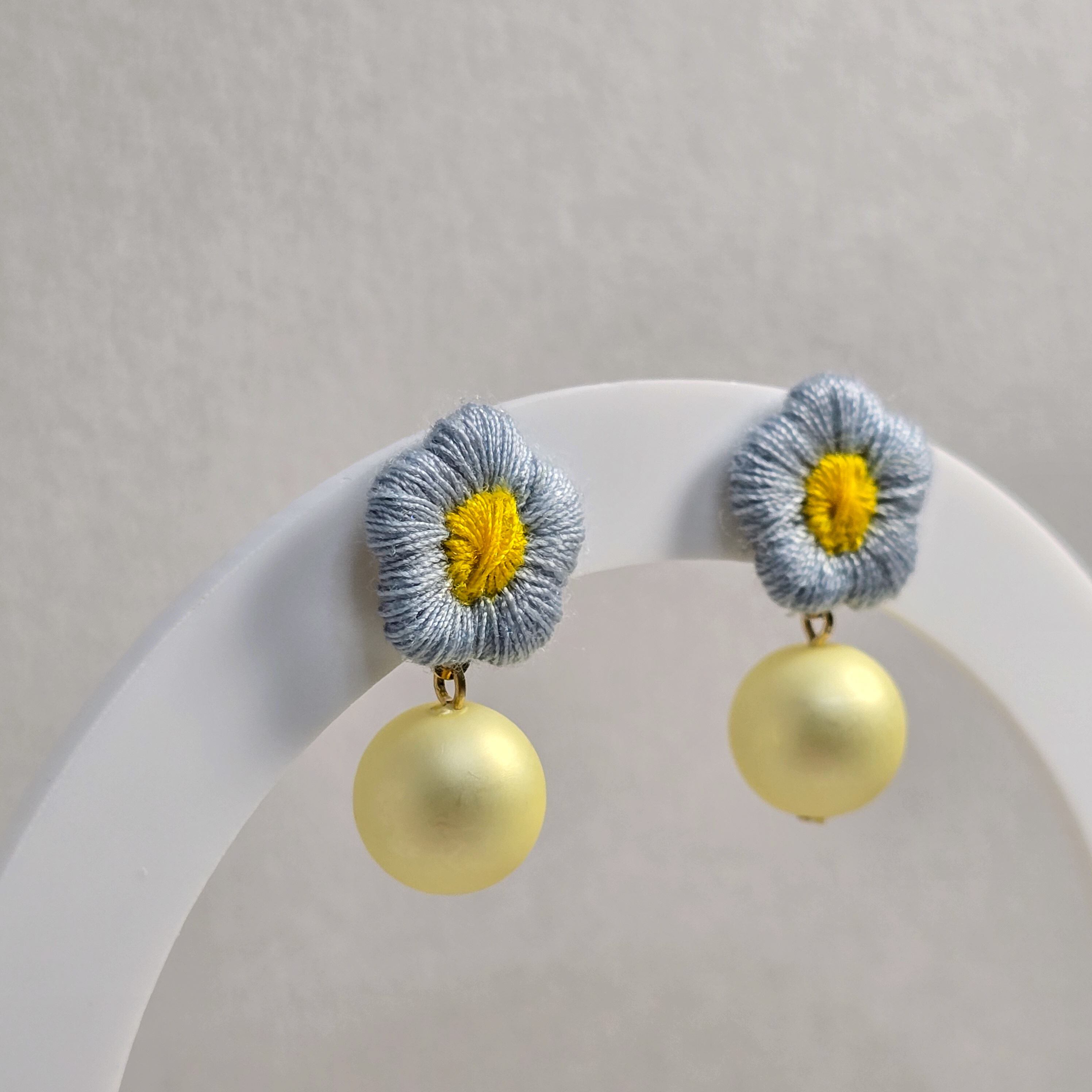 ⟬ ぷっくり刺繡フラワー&レモンクリームパール付き(ブルーグレー×イエロー)ピアス&イヤリング ⟭