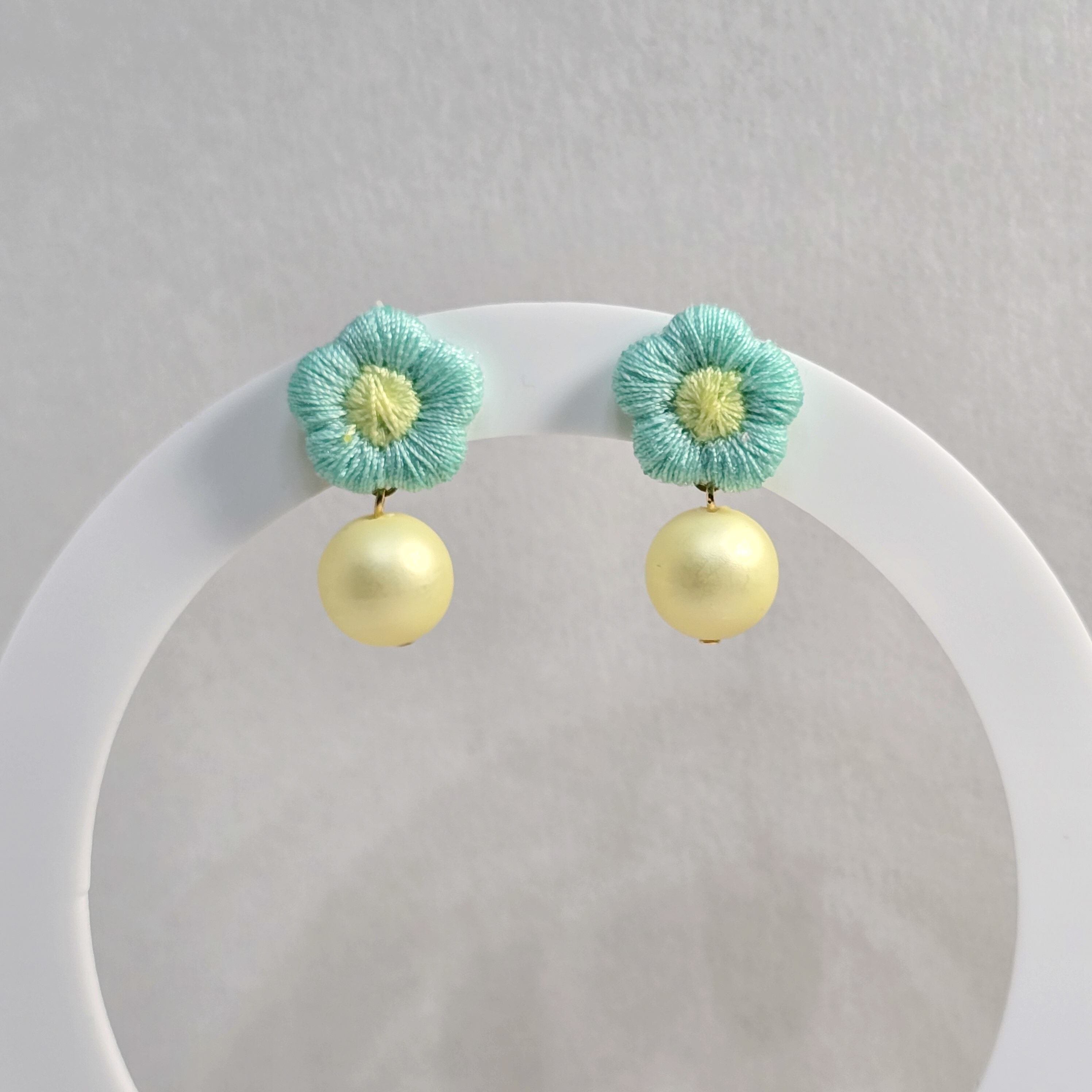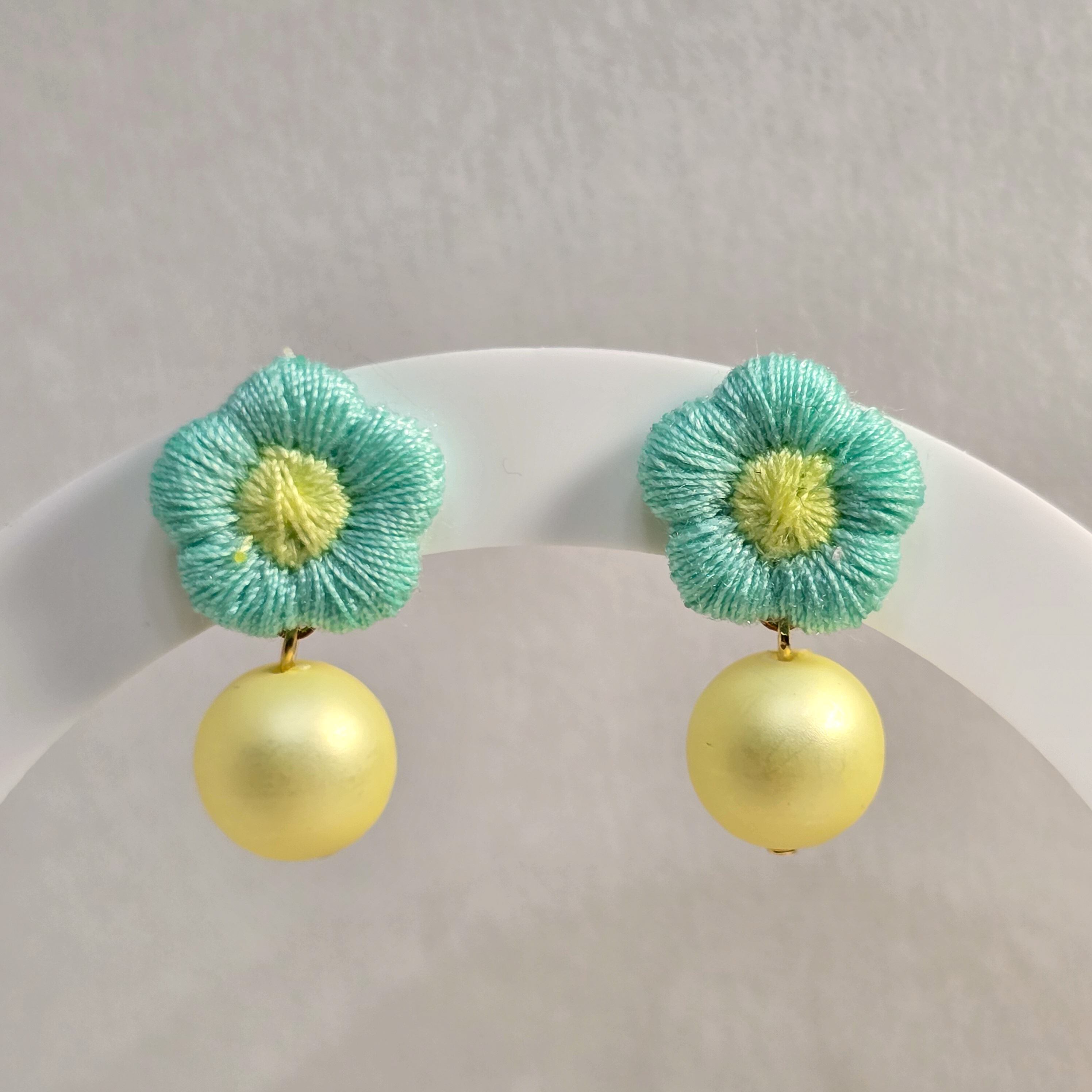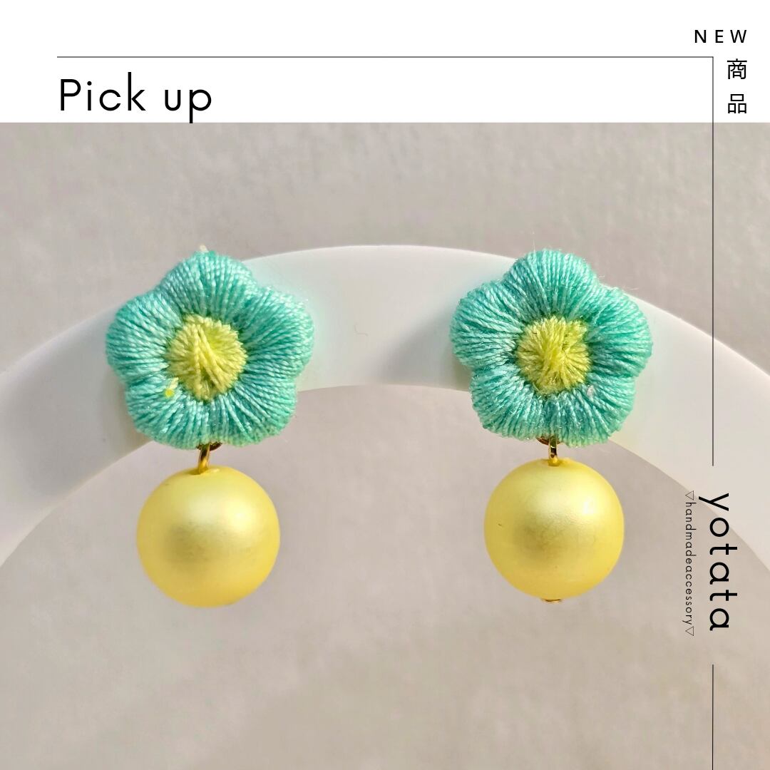 ⟬ ぷっくり刺繡フラワー&レモンクリームパール付き(ミントグリーン×イエロー)ピアス&イヤリング ⟭