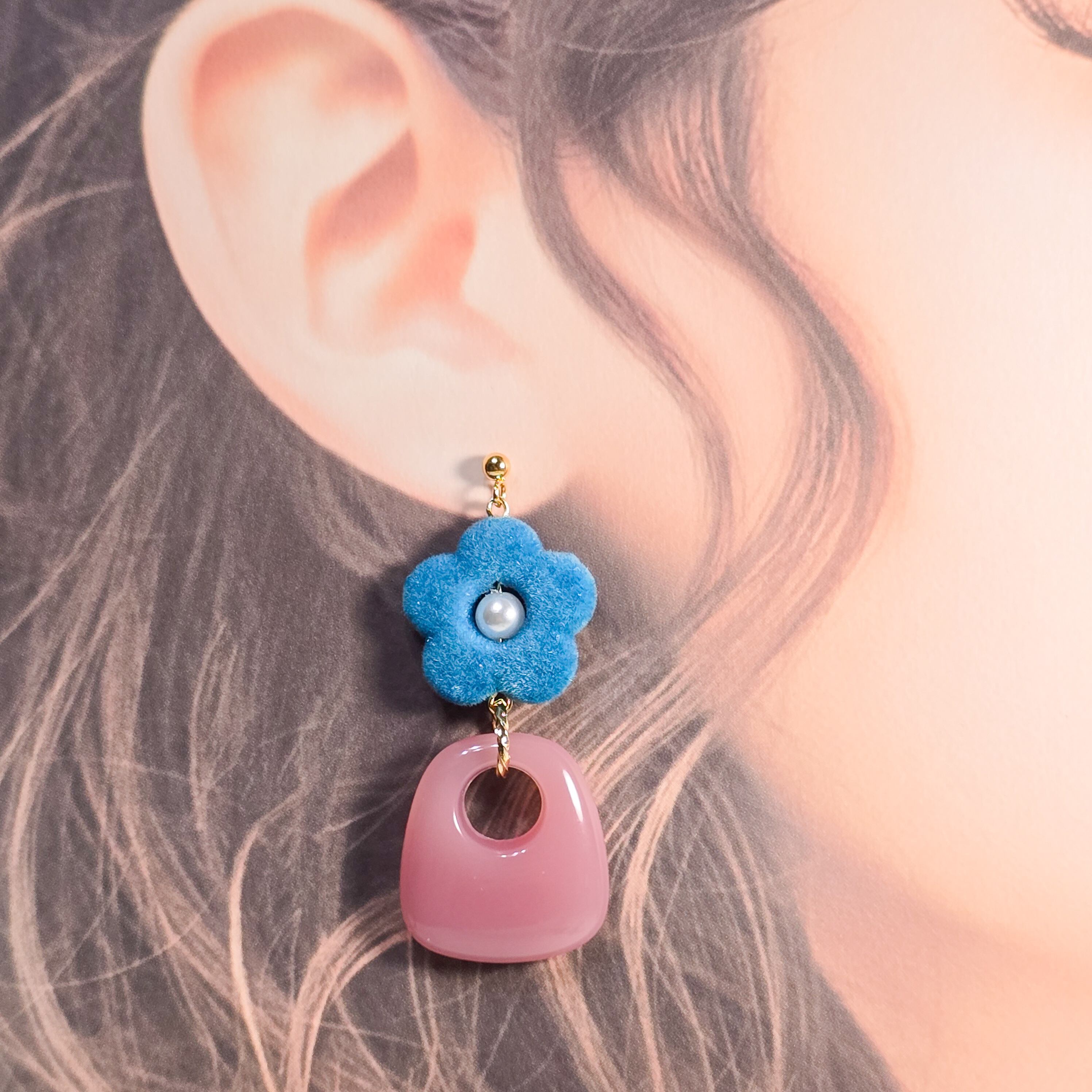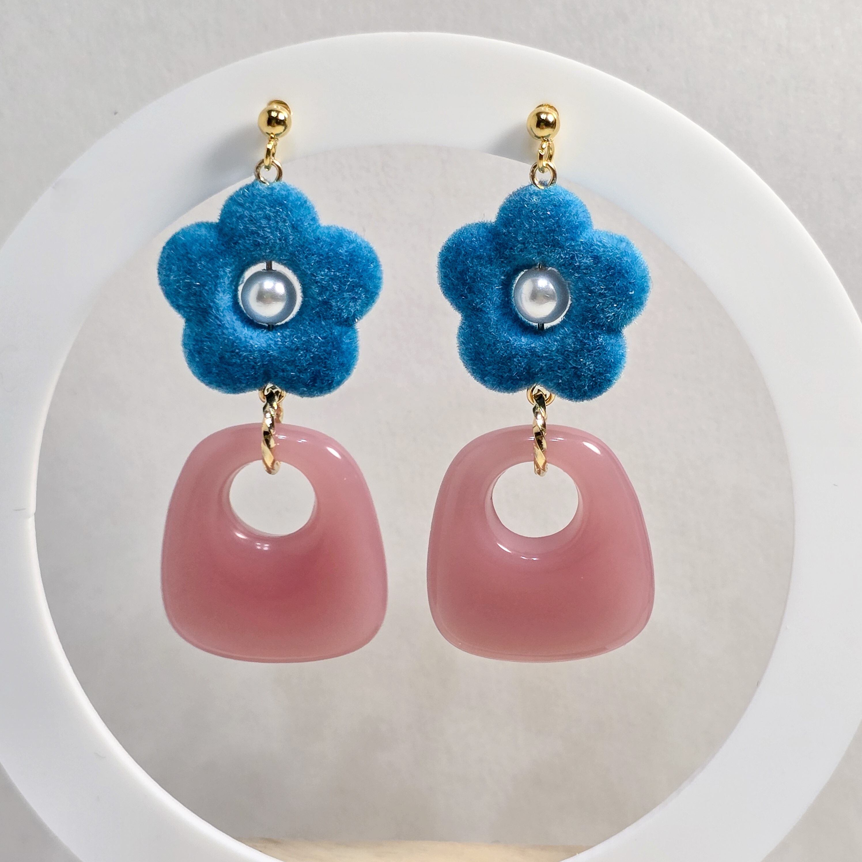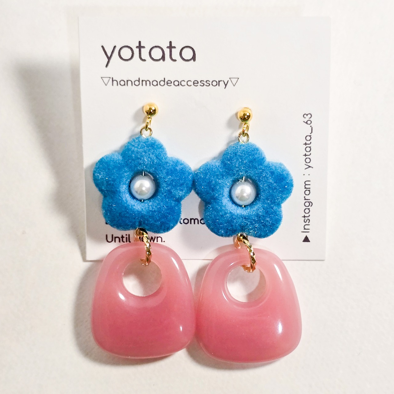 ⟬ レトロポップなお花のスエードピアス&イヤリング(ブルー×ピンク) ⟭