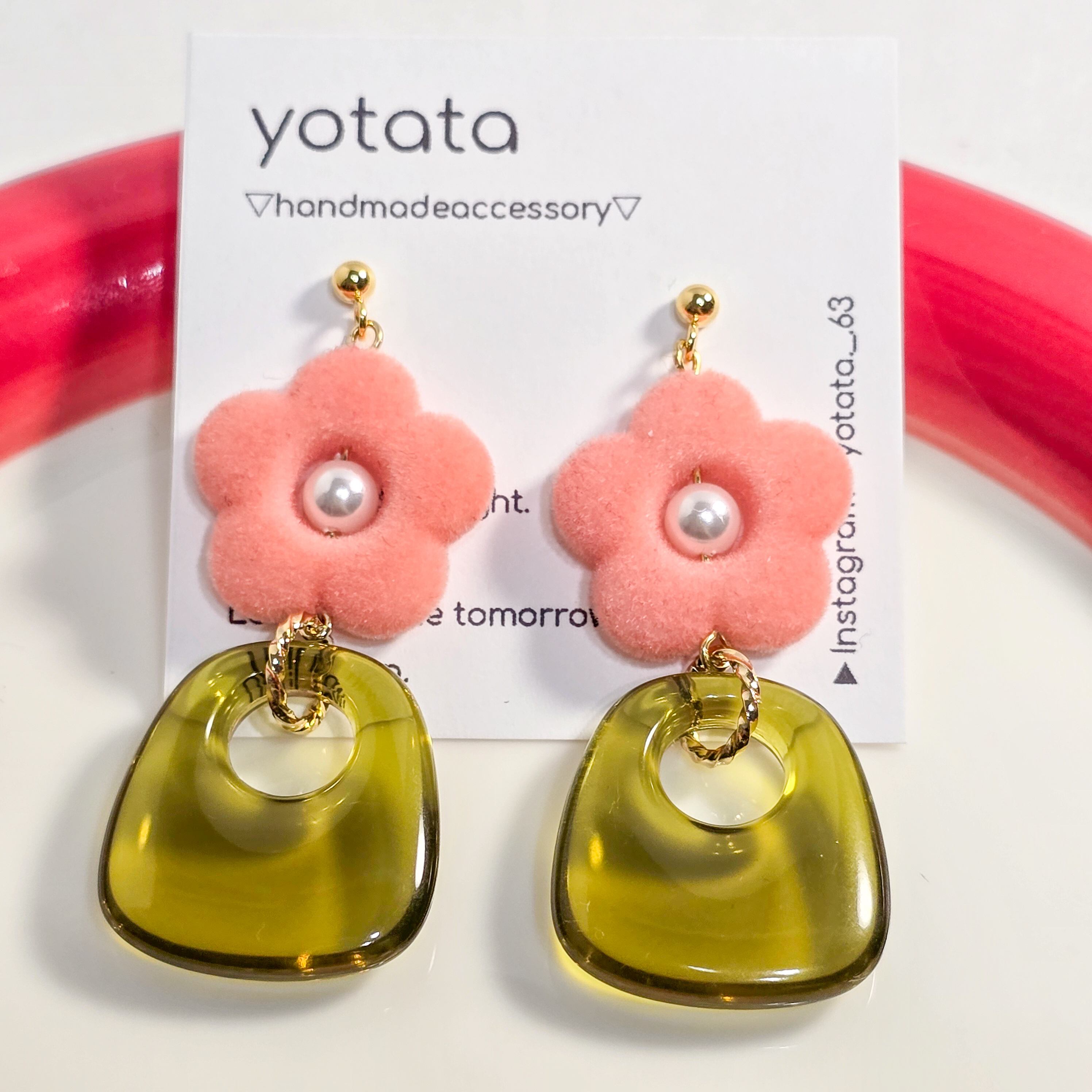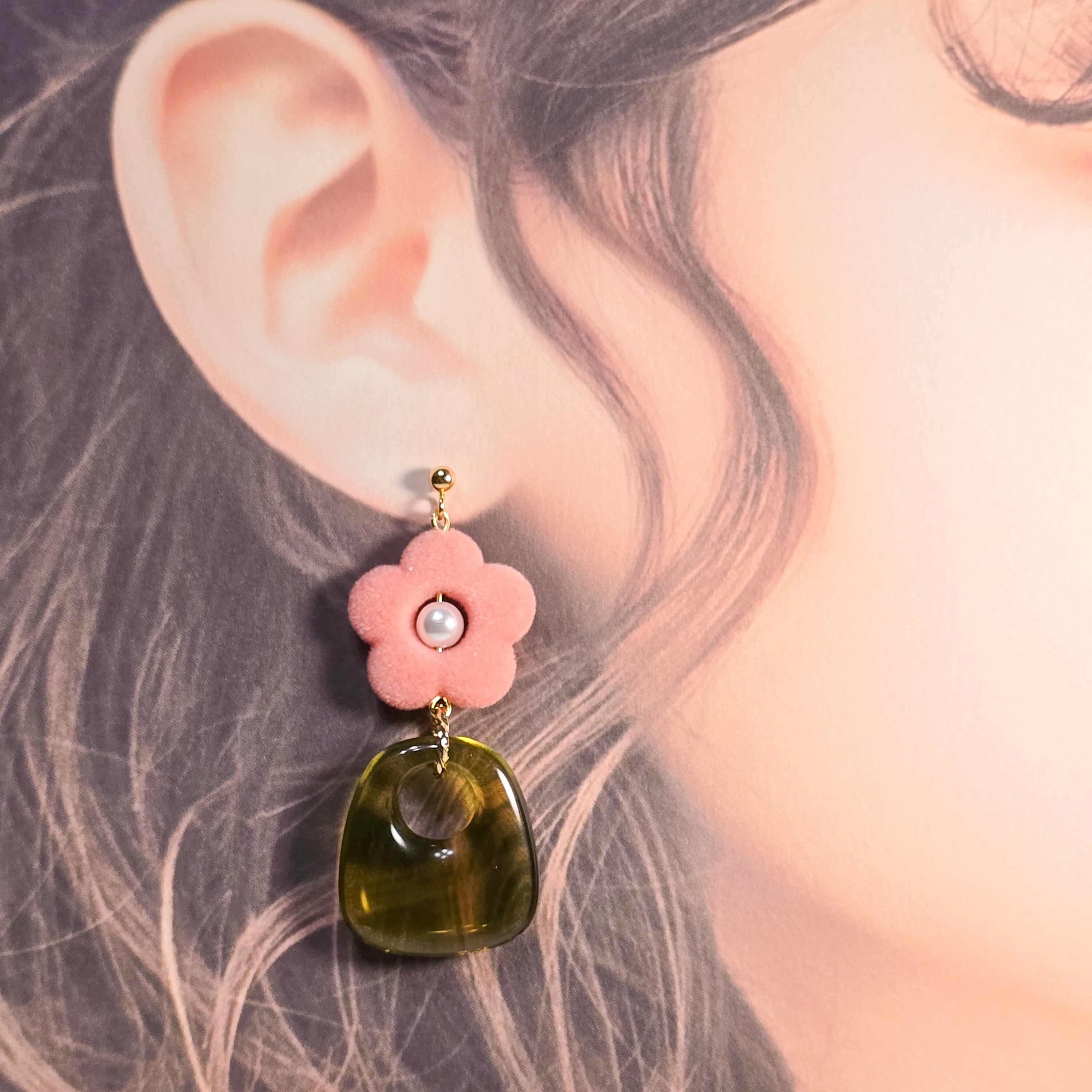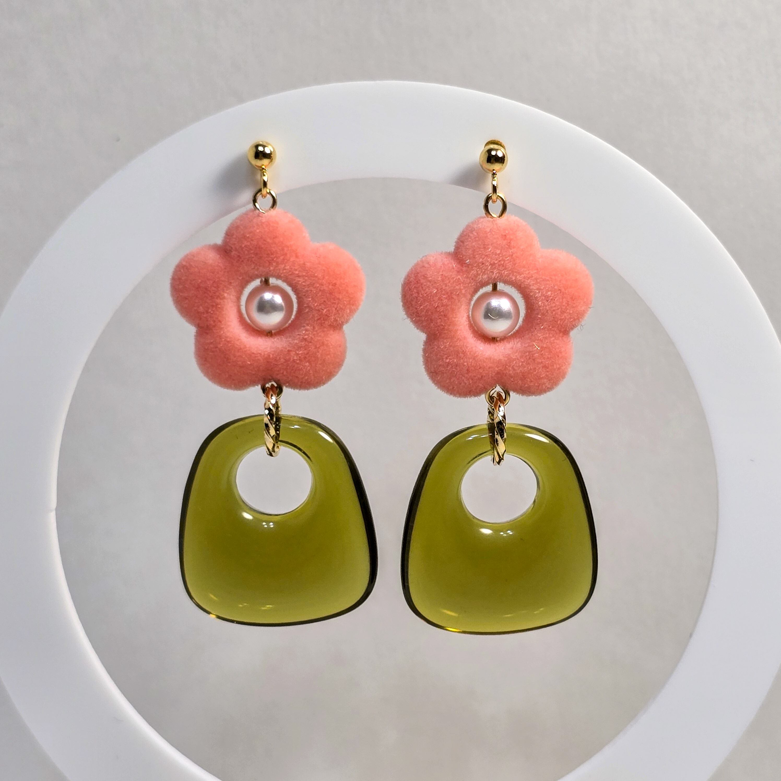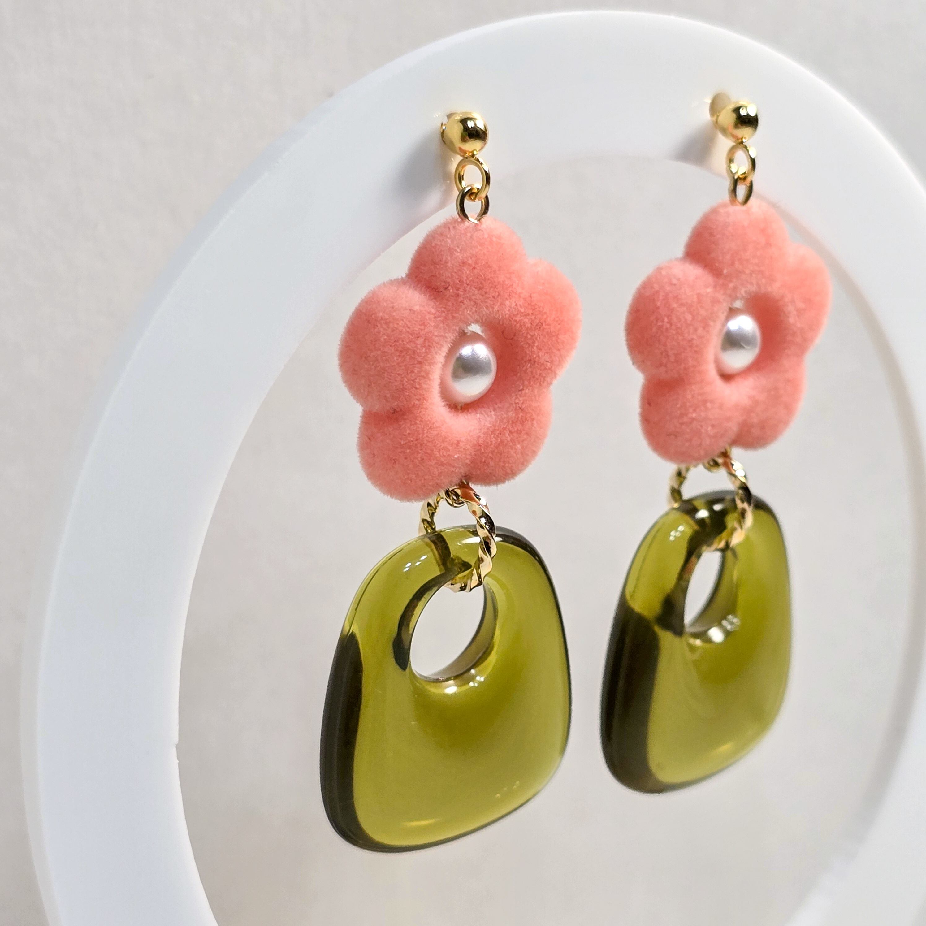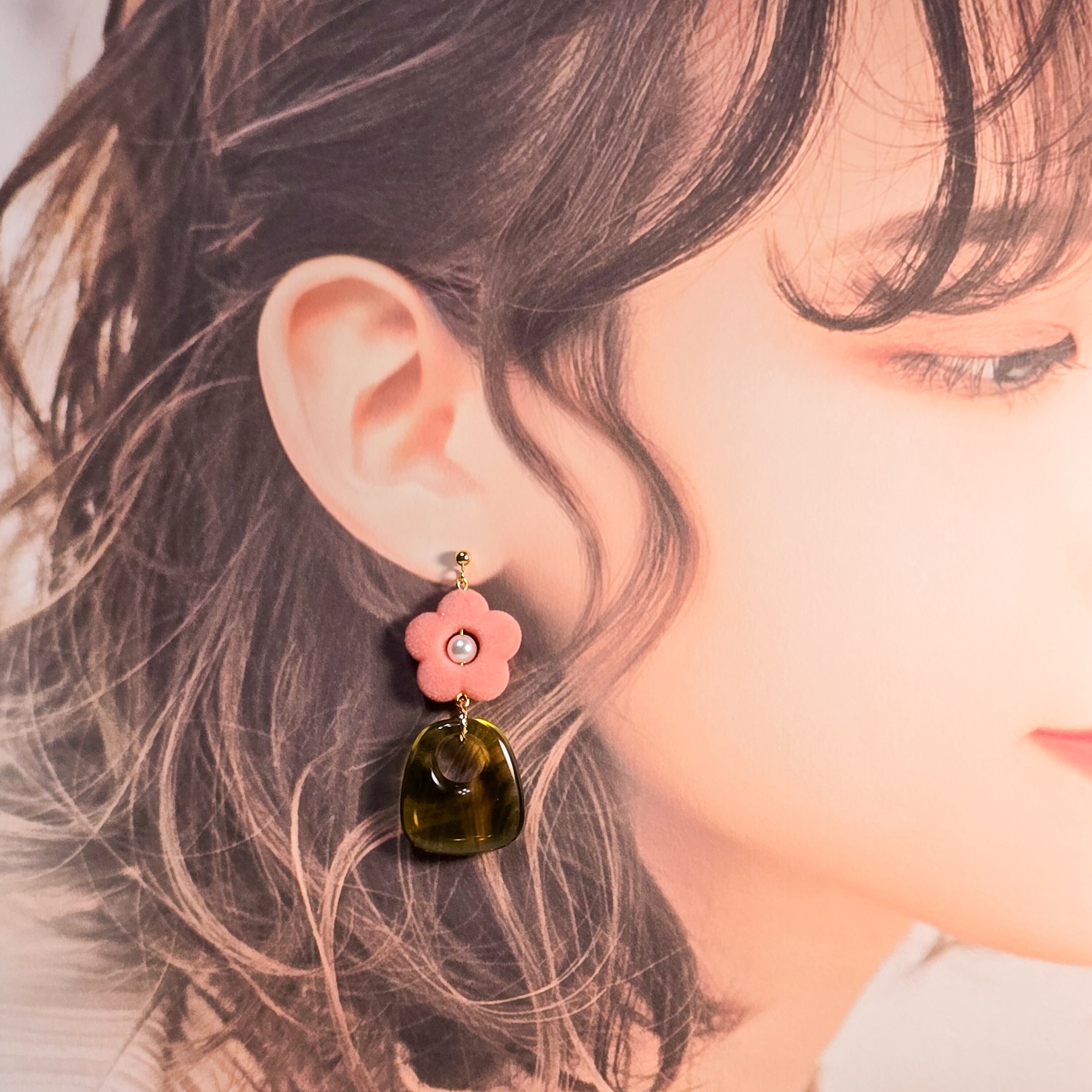 ⟬ レトロポップなお花のスエードピアス&イヤリング(ピンク×グリーン) ⟭