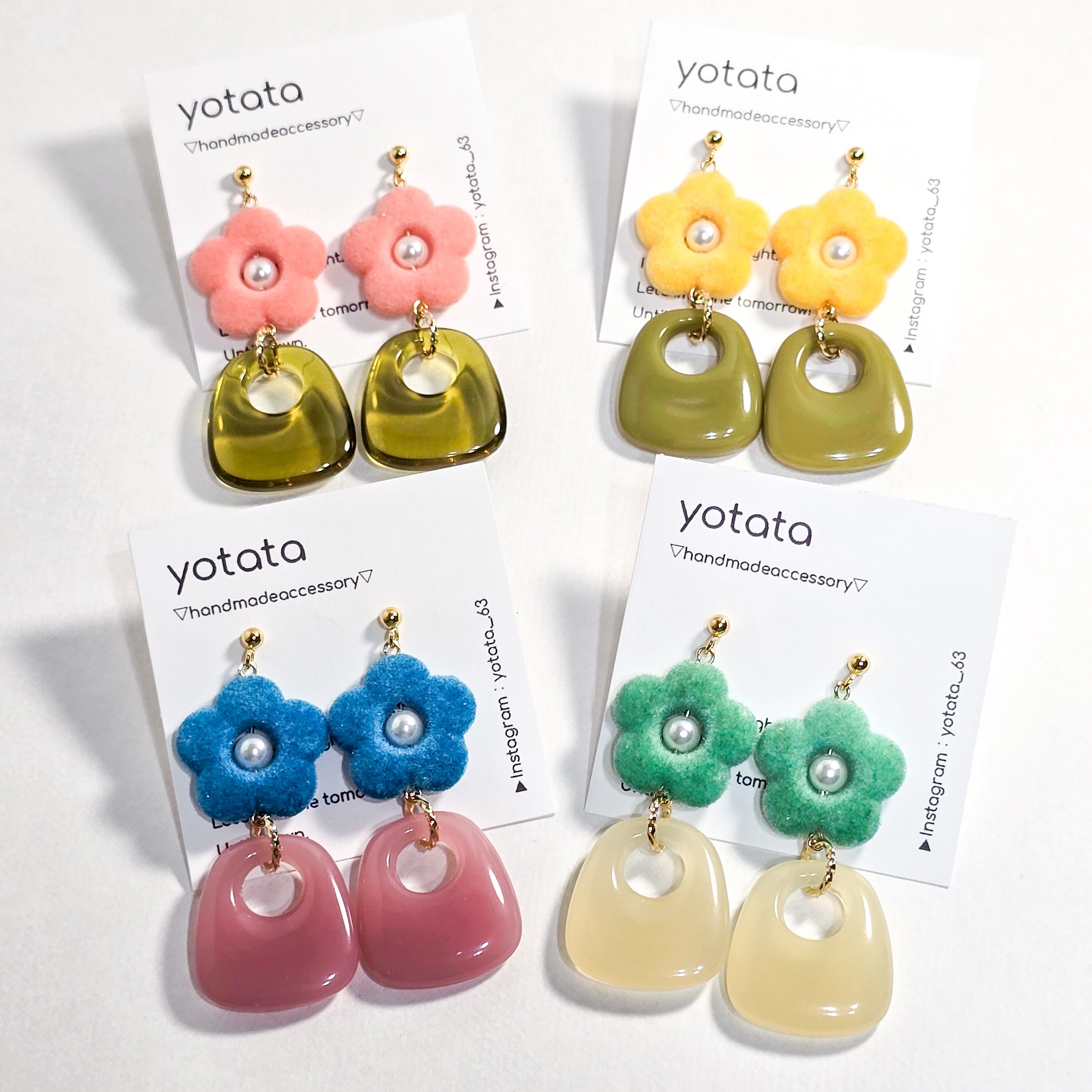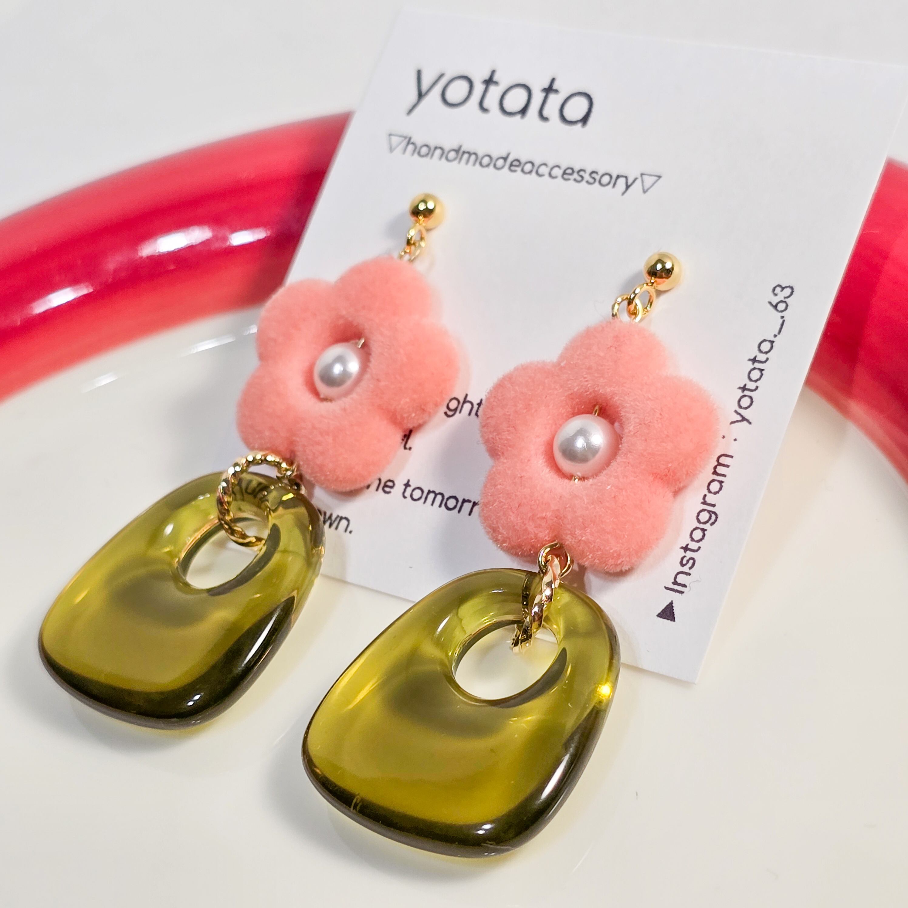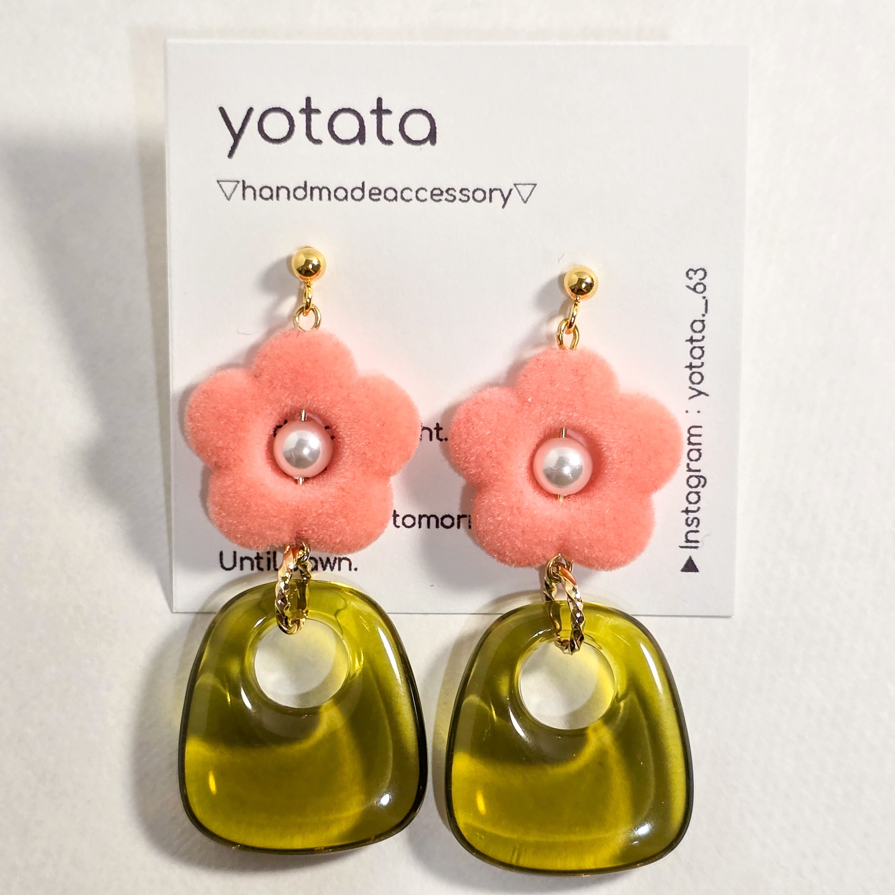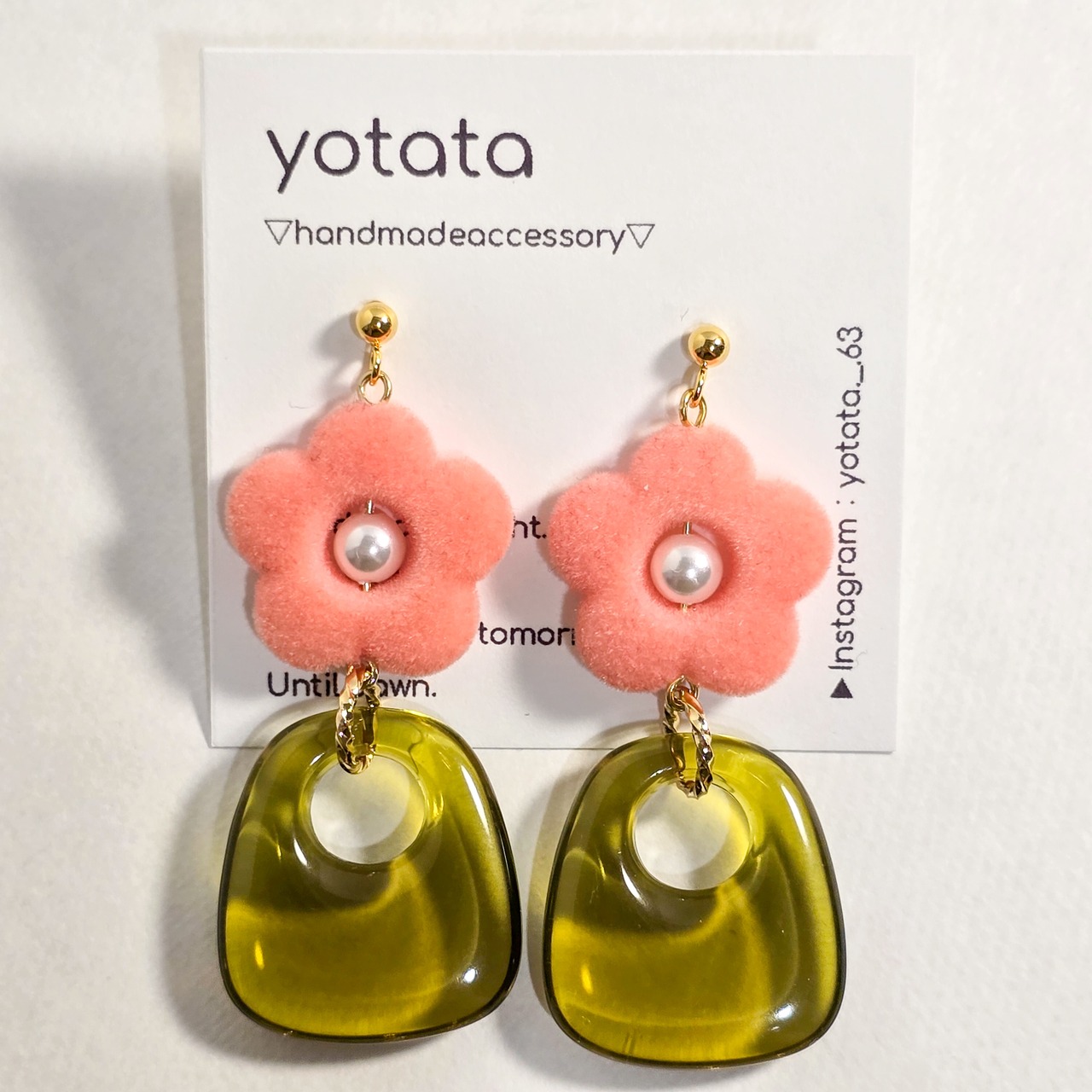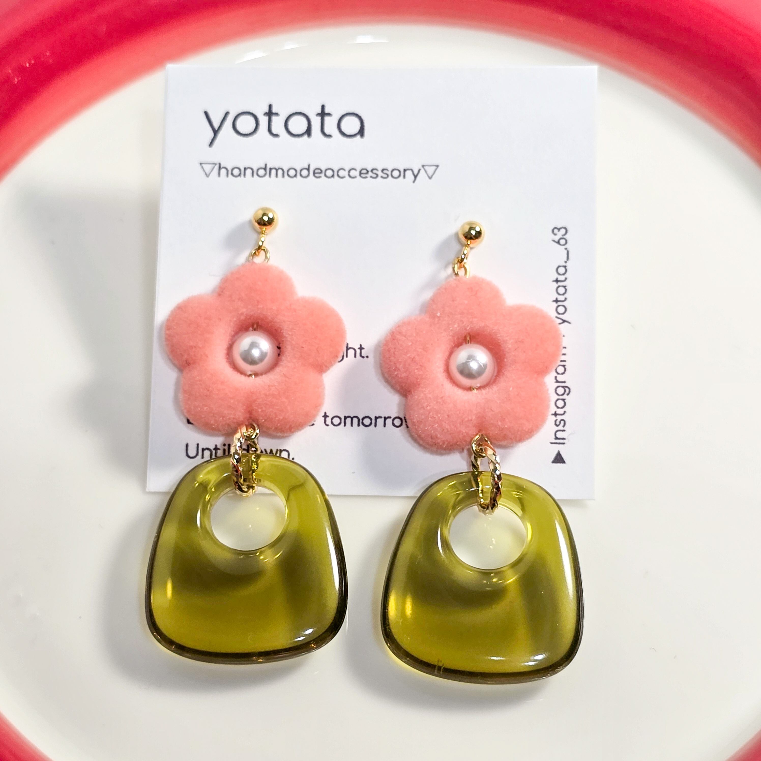 ⟬ レトロポップなお花のスエードピアス&イヤリング(ピンク×グリーン) ⟭