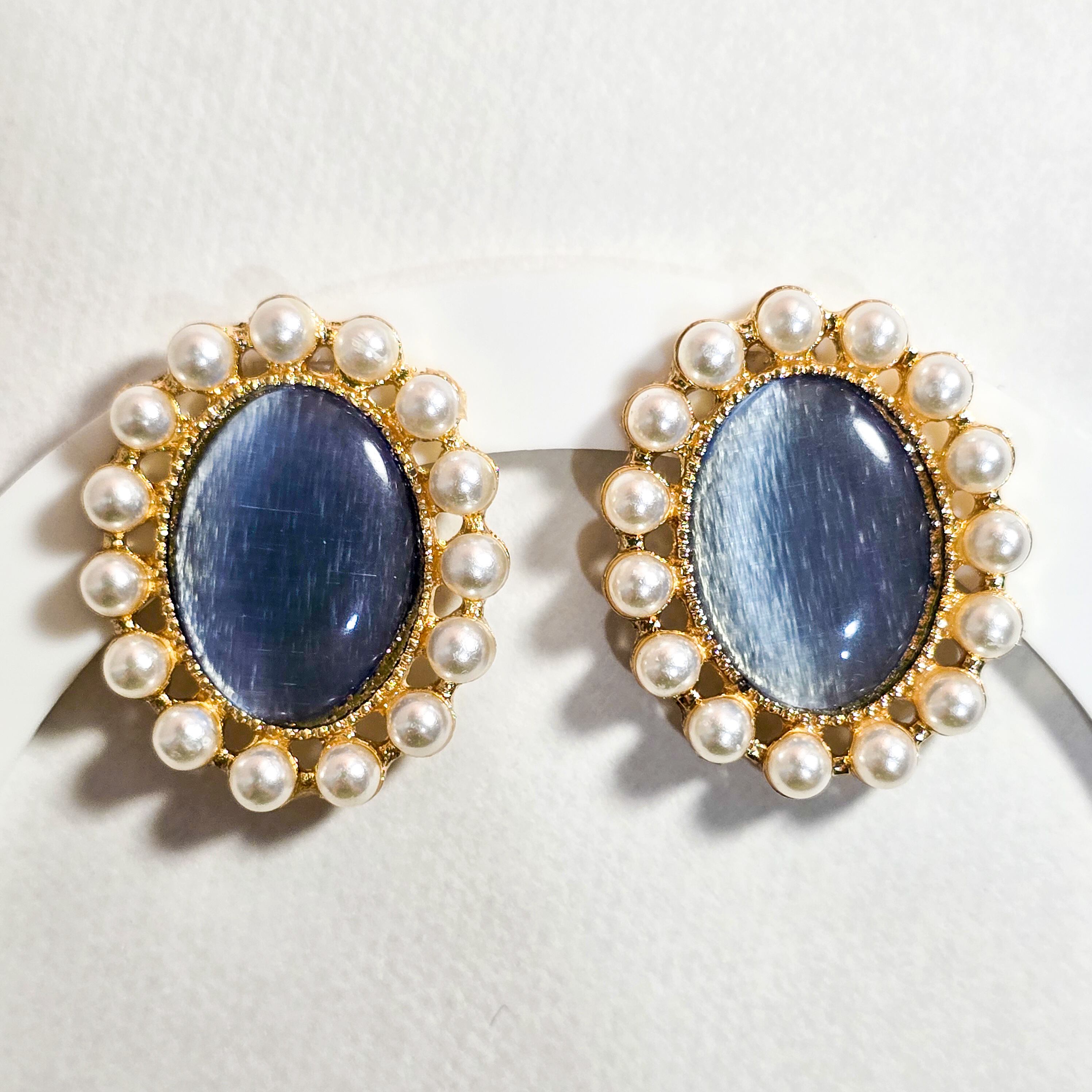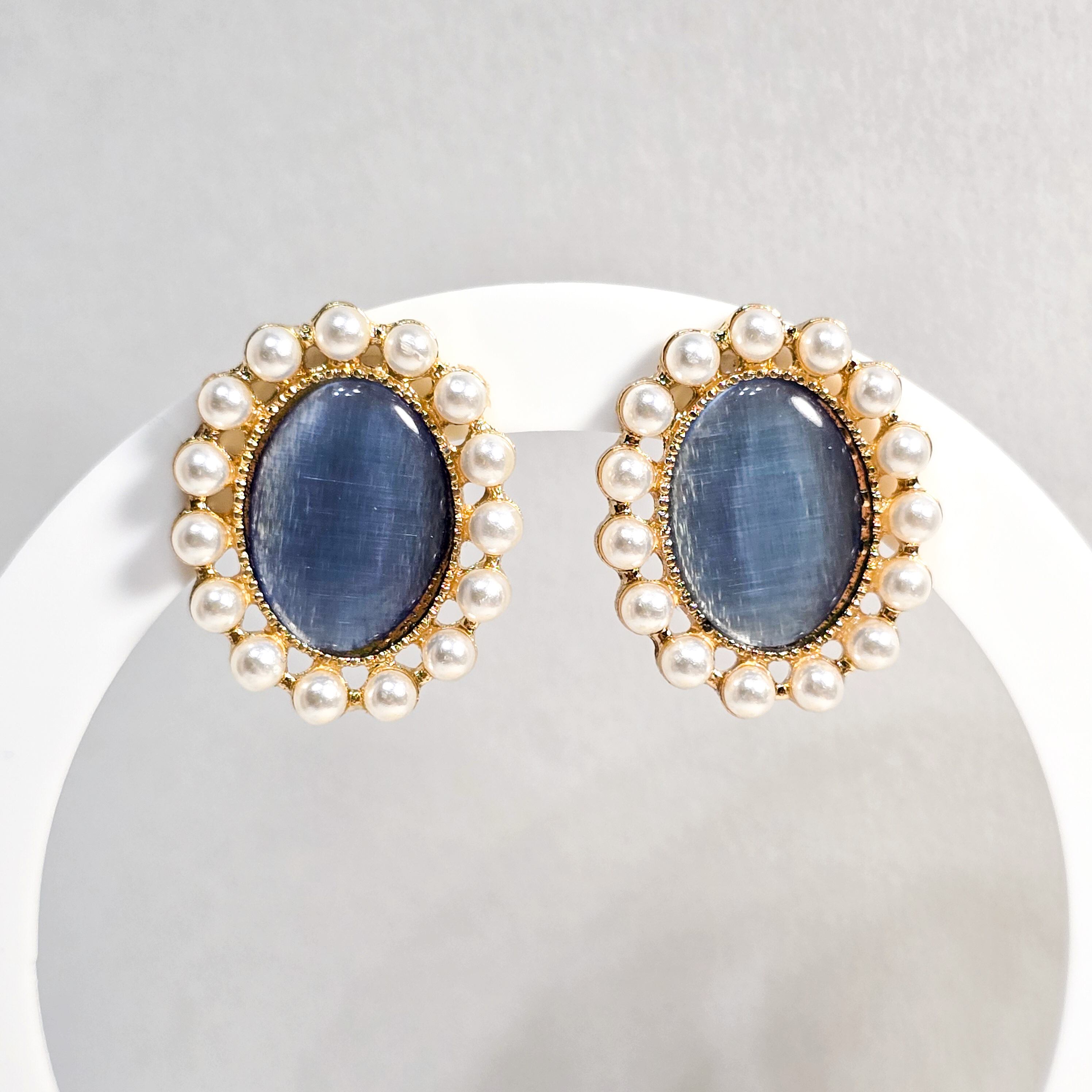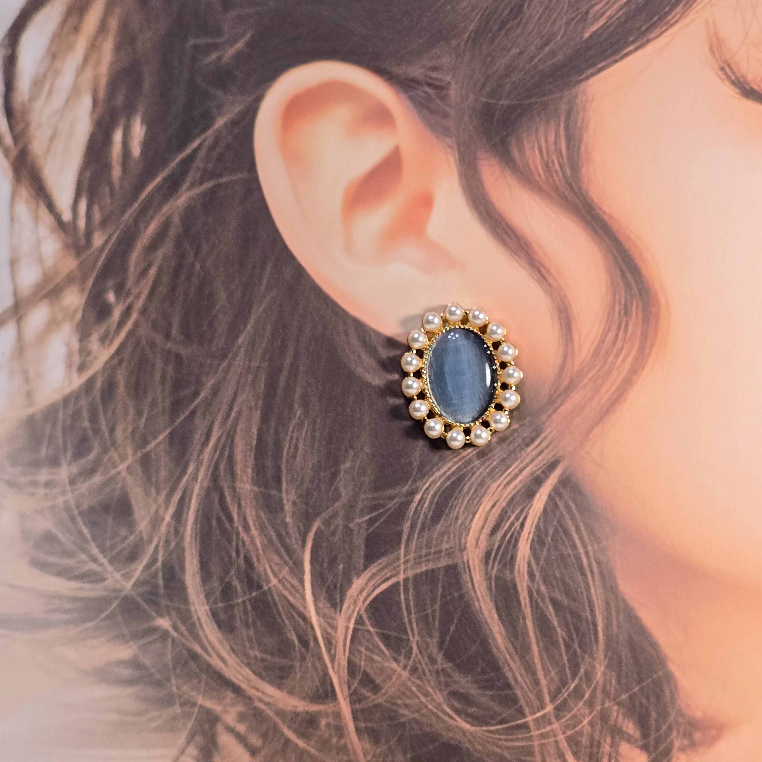 ⟬ キャッツアイ/パール付きカボション(ブルー)ピアス&イヤリング ⟭