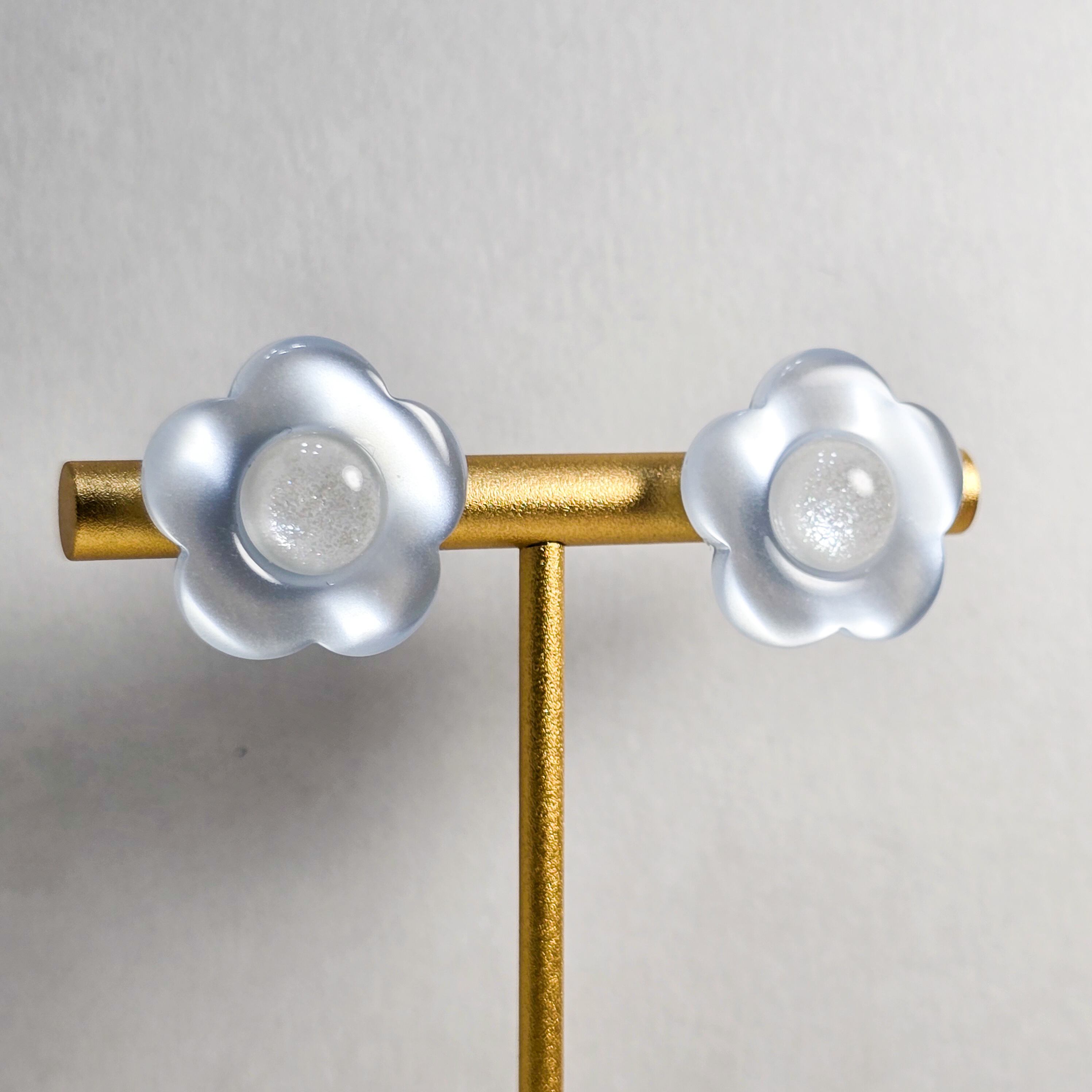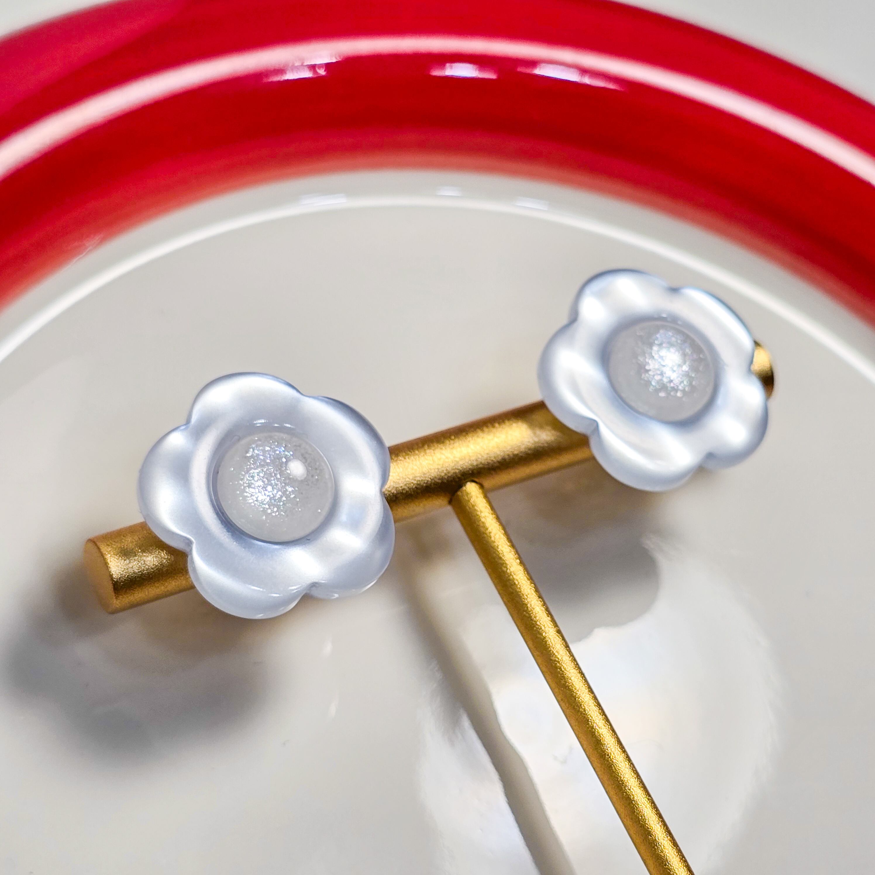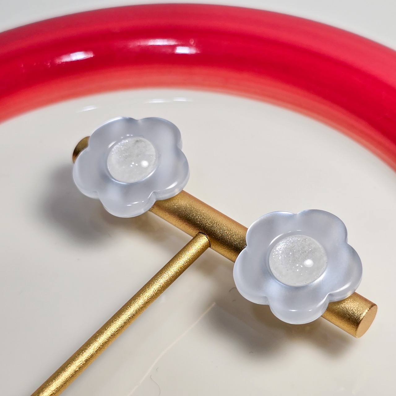 中心がパールでキラキラして、特殊な加工をされているフラワーベースのボタンパーツを使用したアクセサリー!