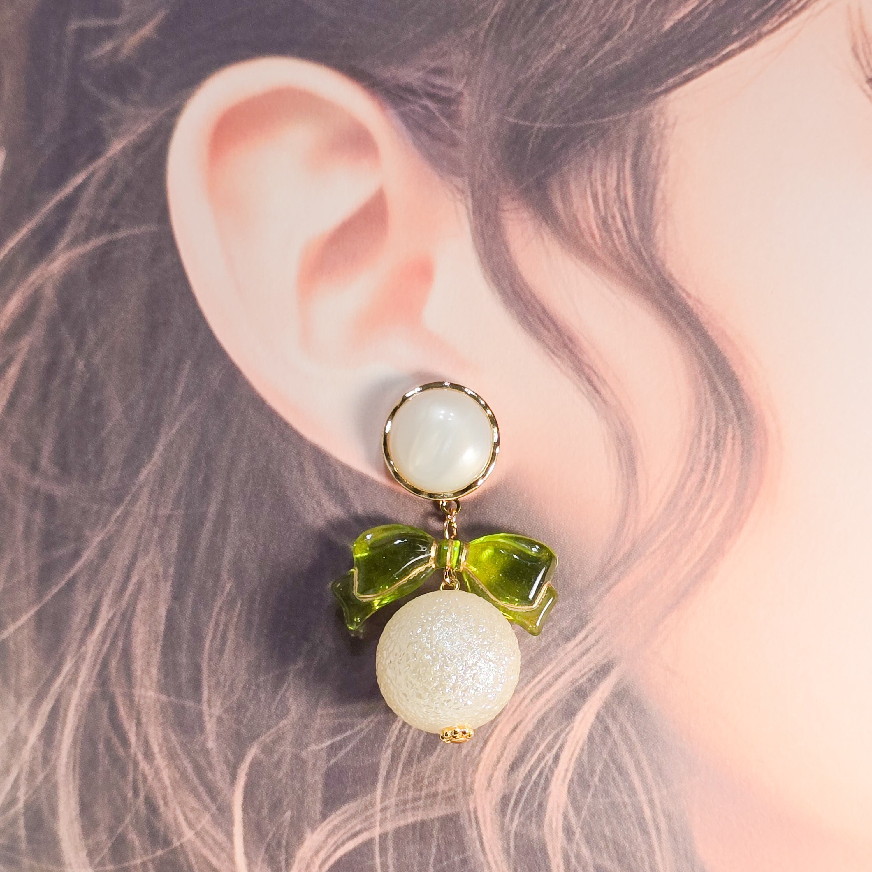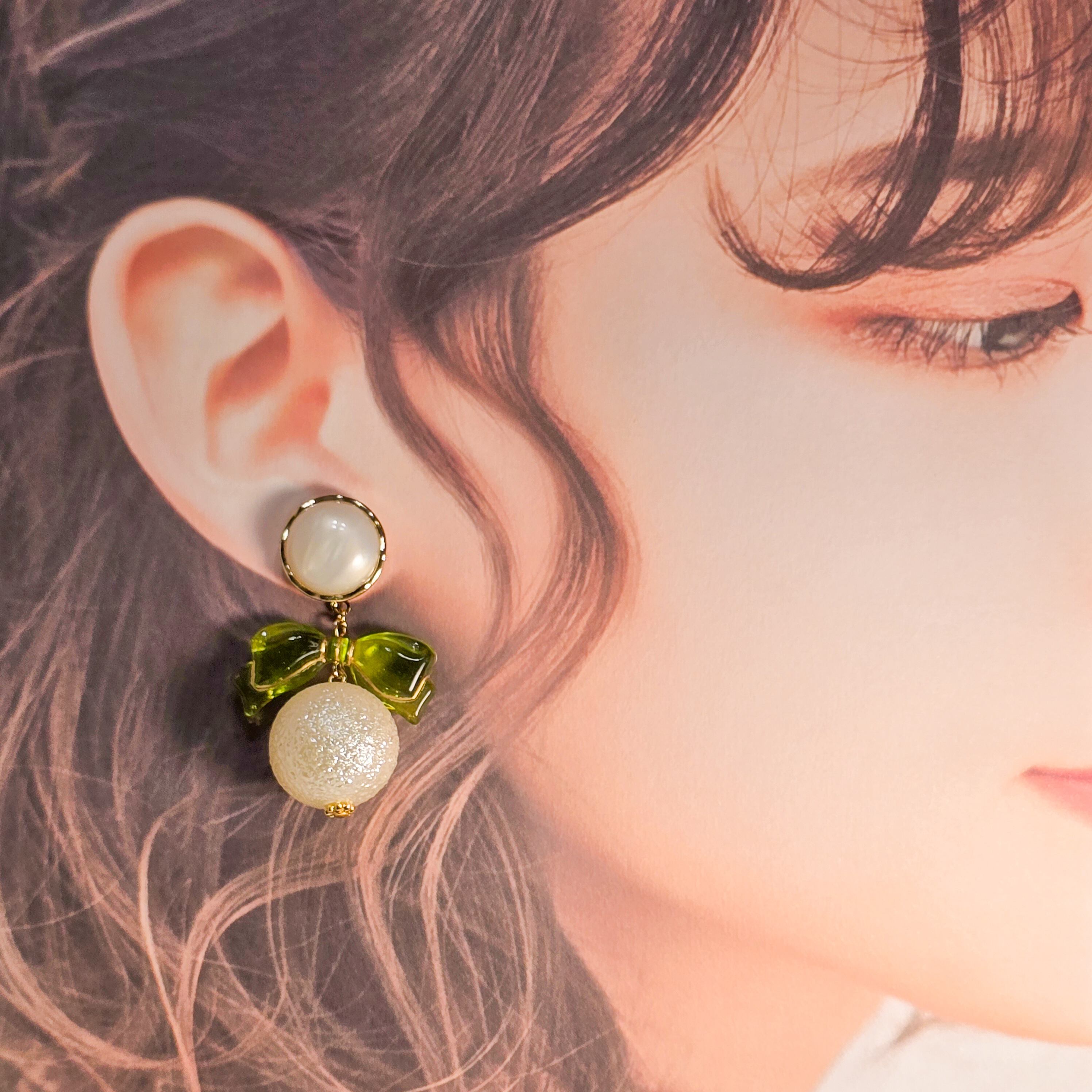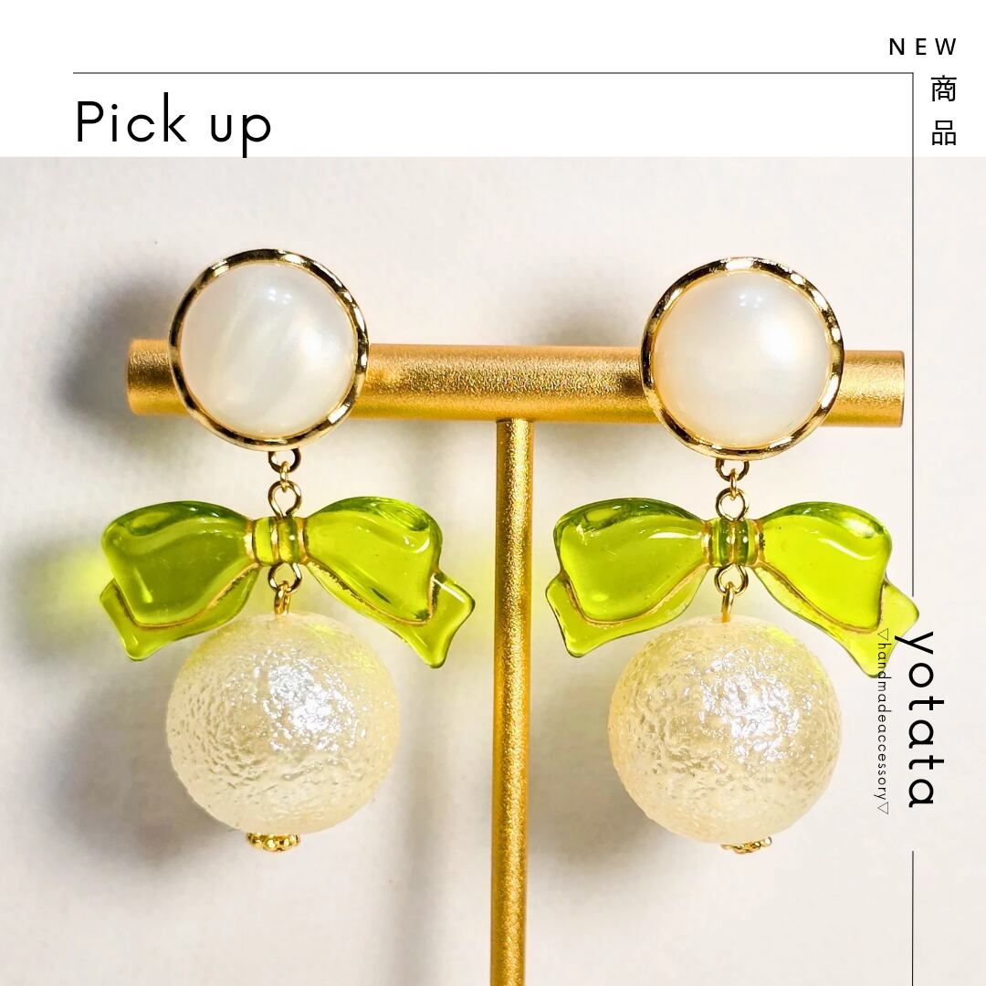 20mmの大ぶりの特殊パールに、グリーンのリボンを添えて