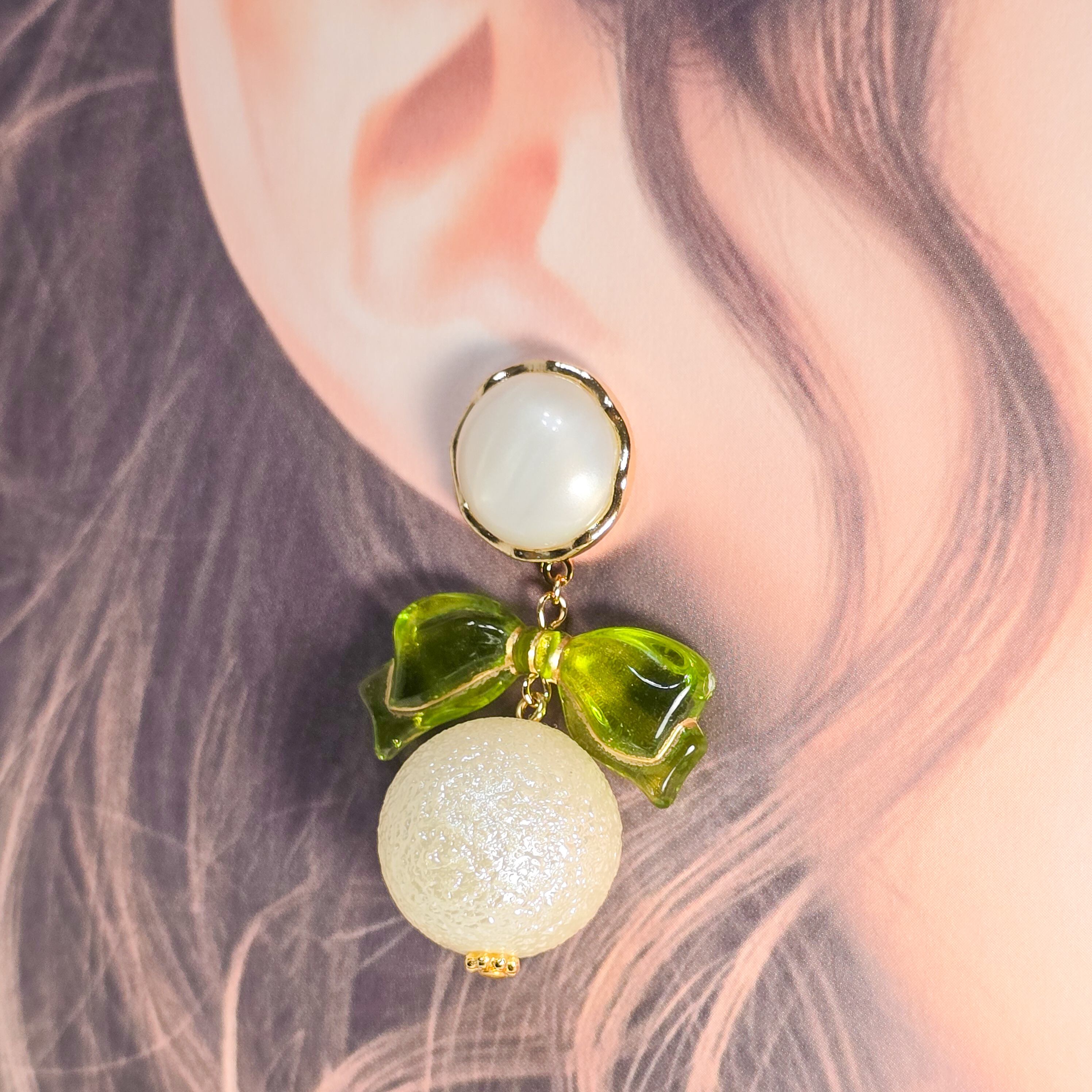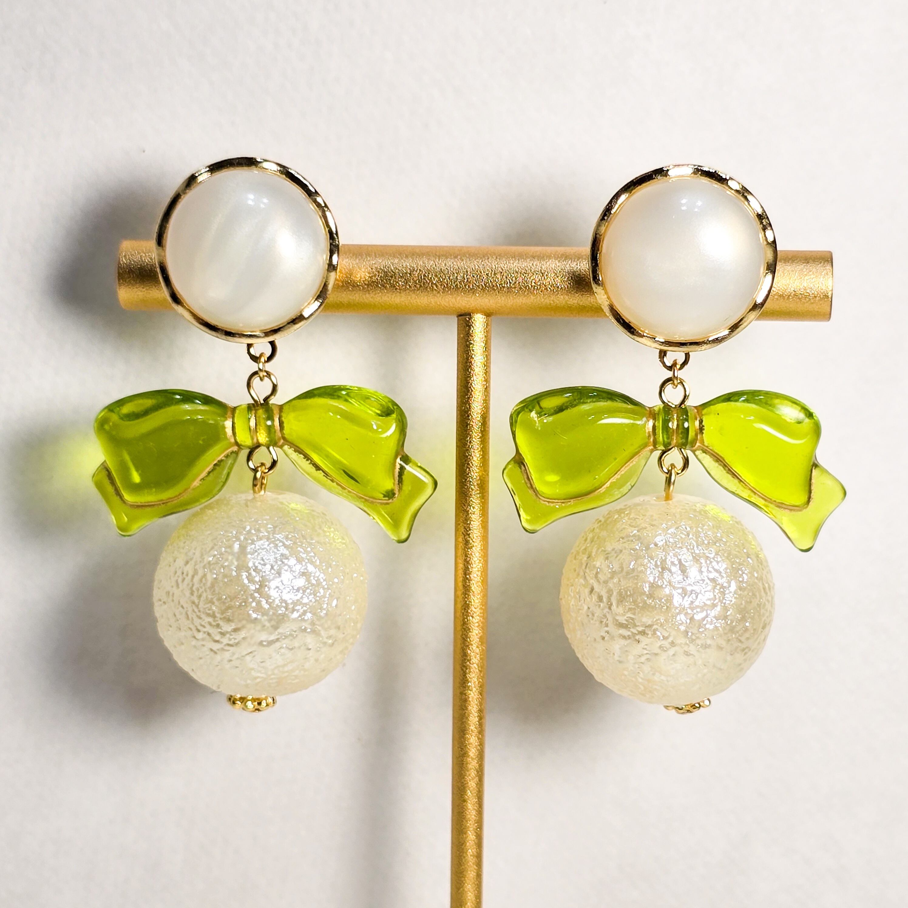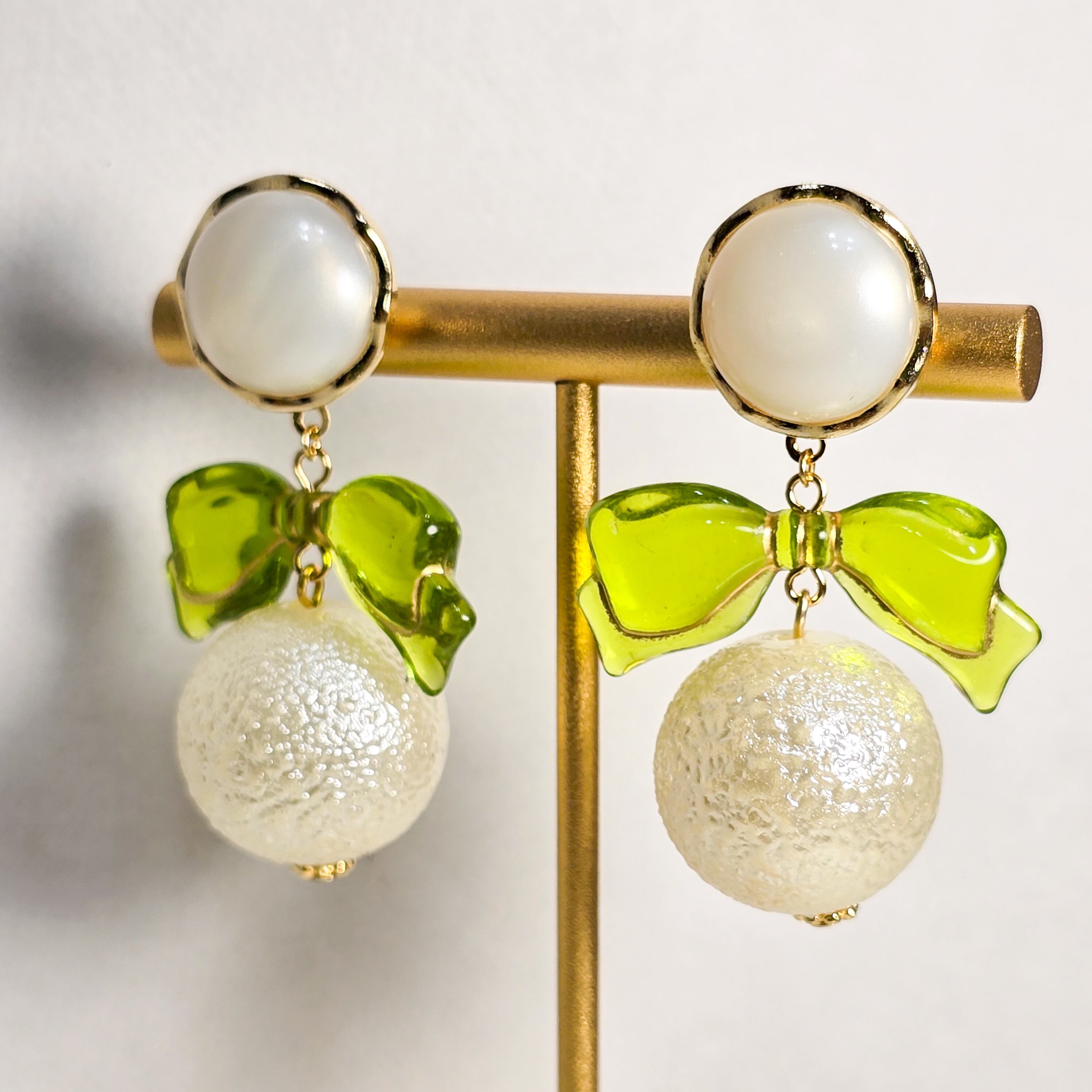 20mmの大ぶりの特殊パールに、グリーンのリボンを添えて
