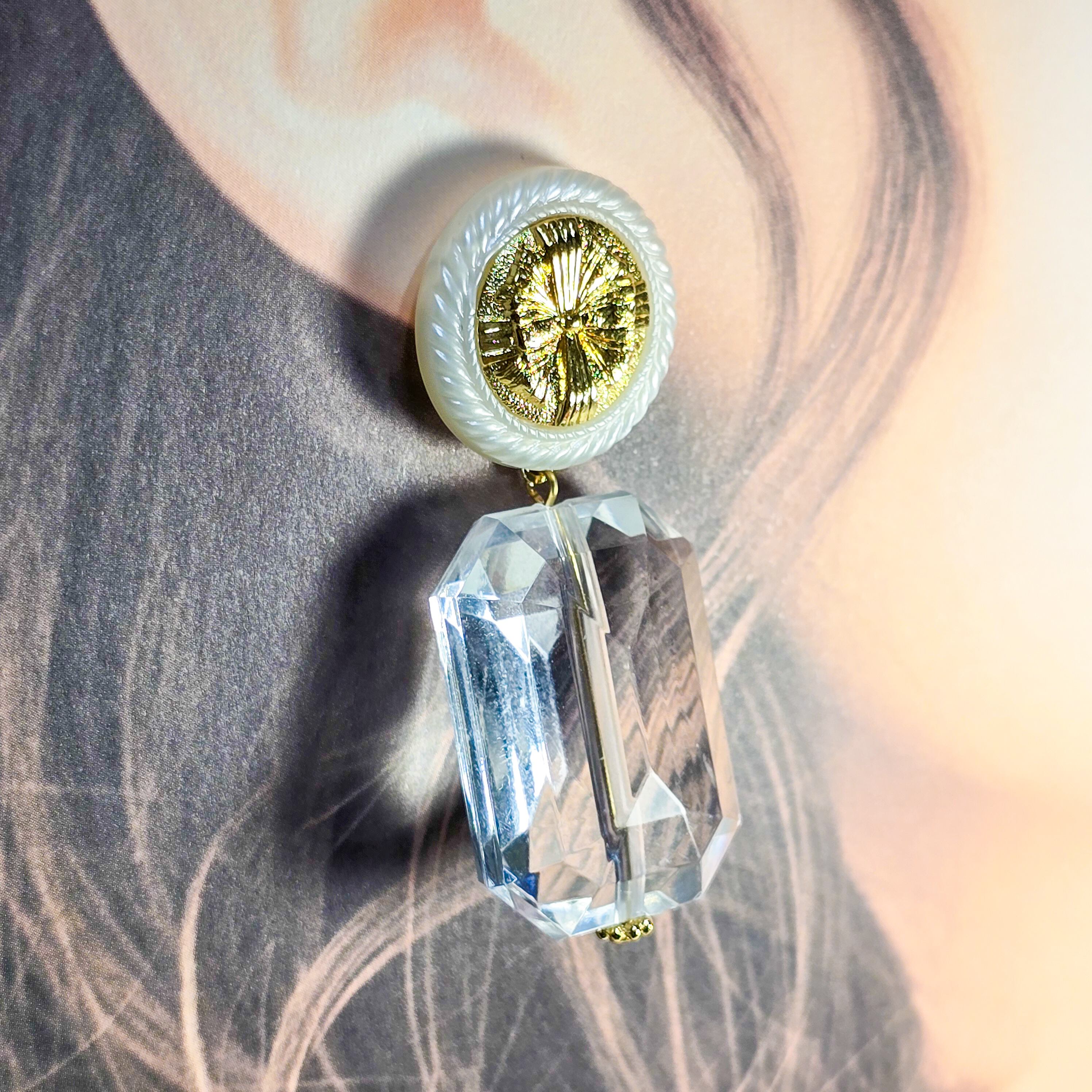 ⟬ ヴィンテージレトロボタンとガラスの多面カットの大ぶりピアス&イヤリング(1点限り) ⟭