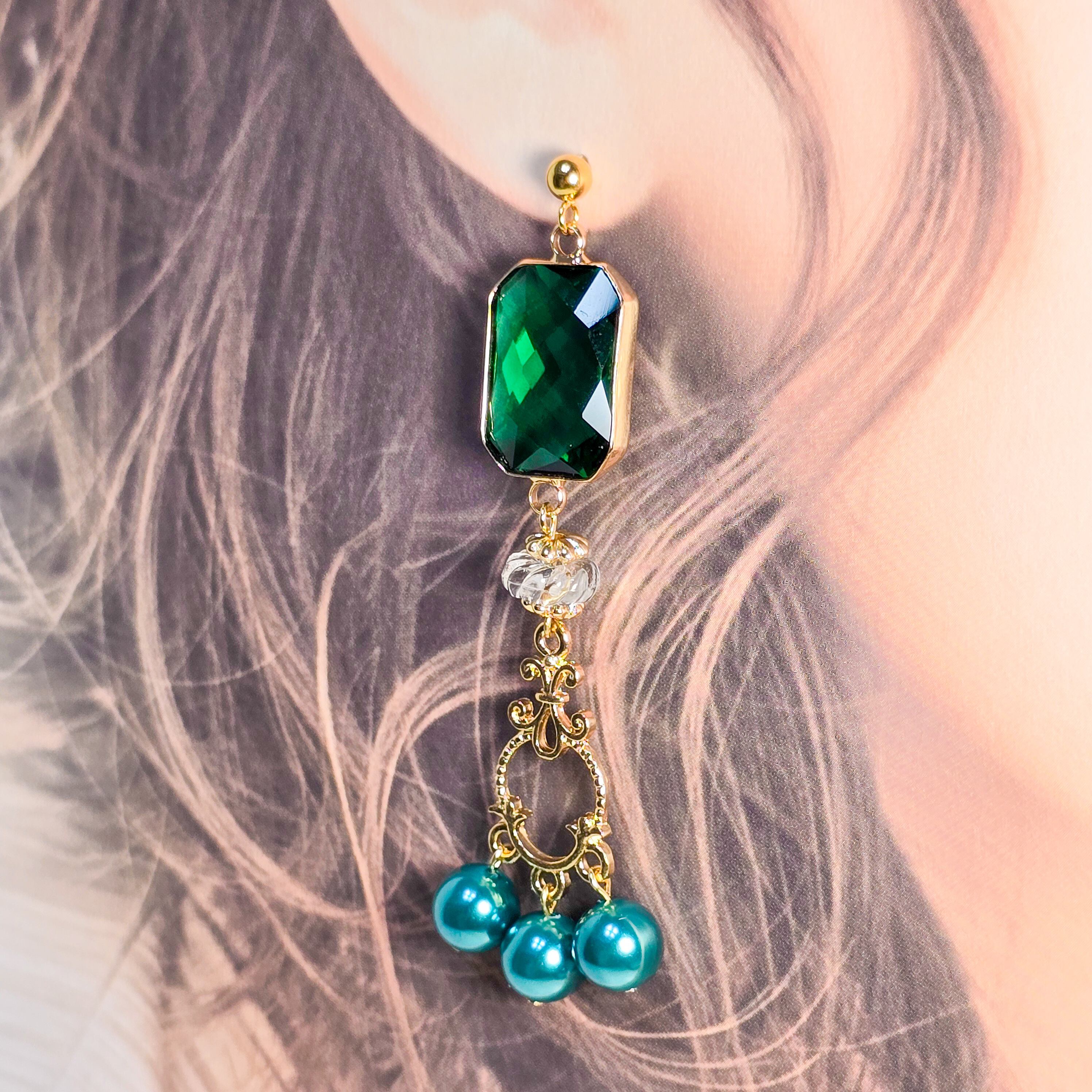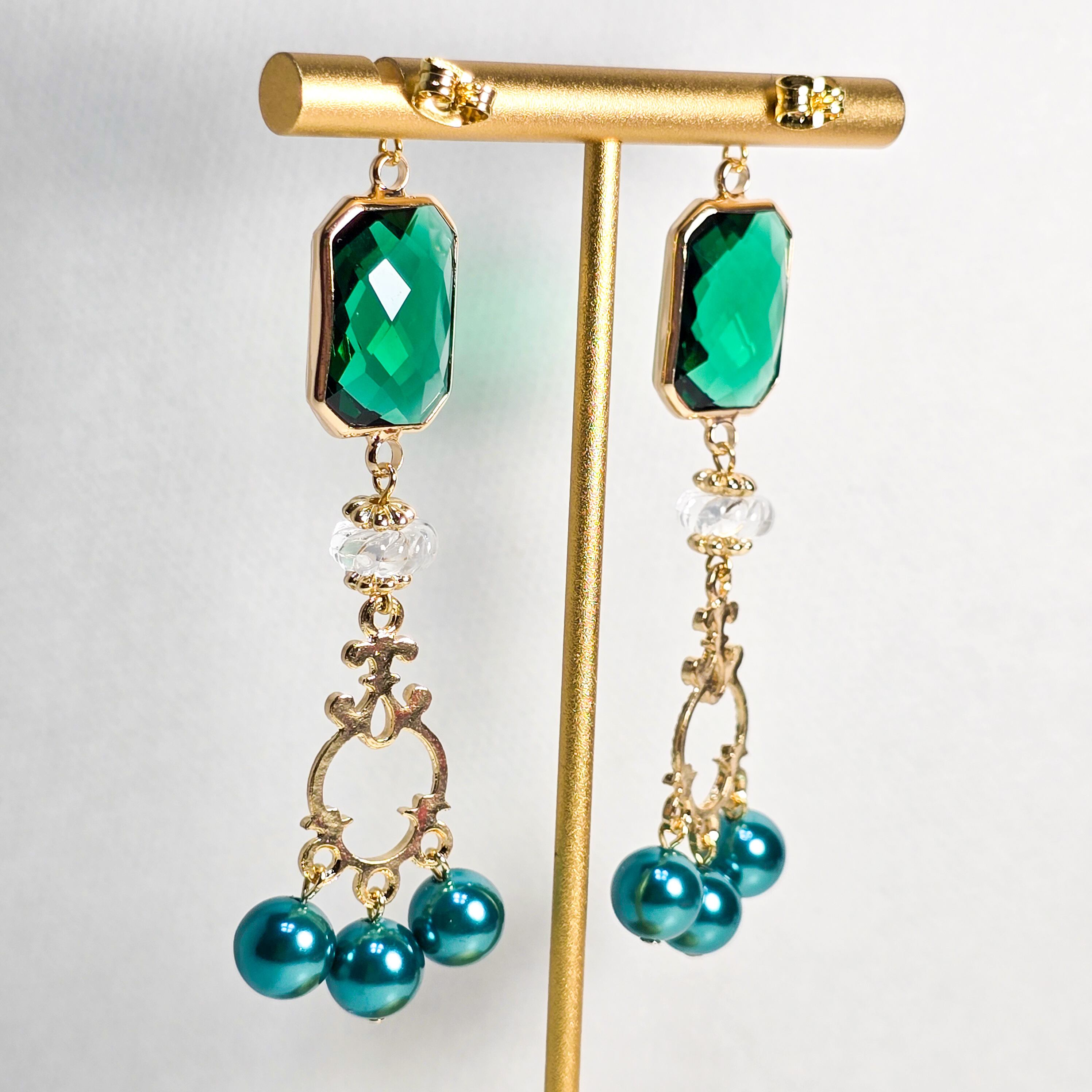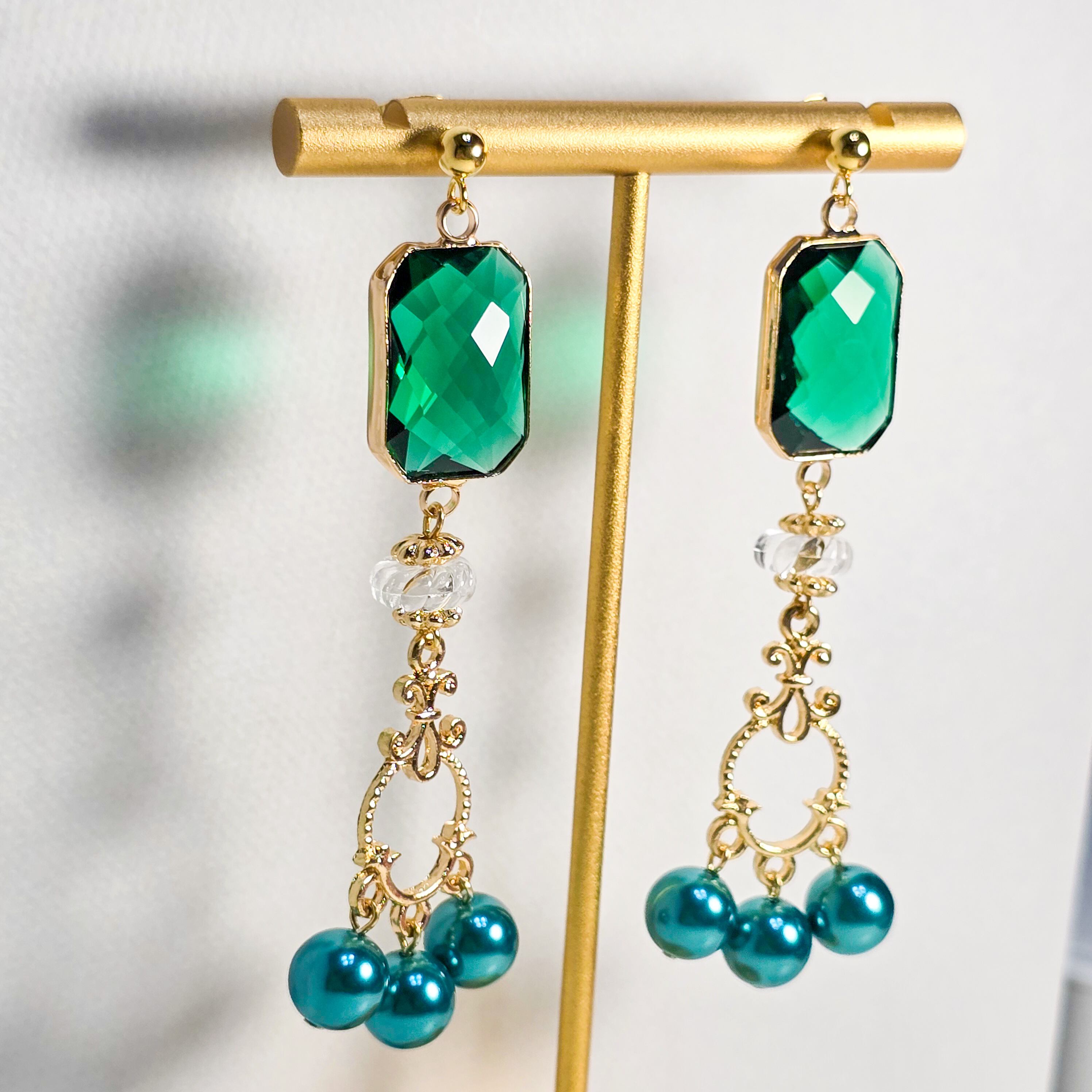 ⟬(グリーン)ガラスカットとパールのアンティークピアス&イヤリング ⟭
