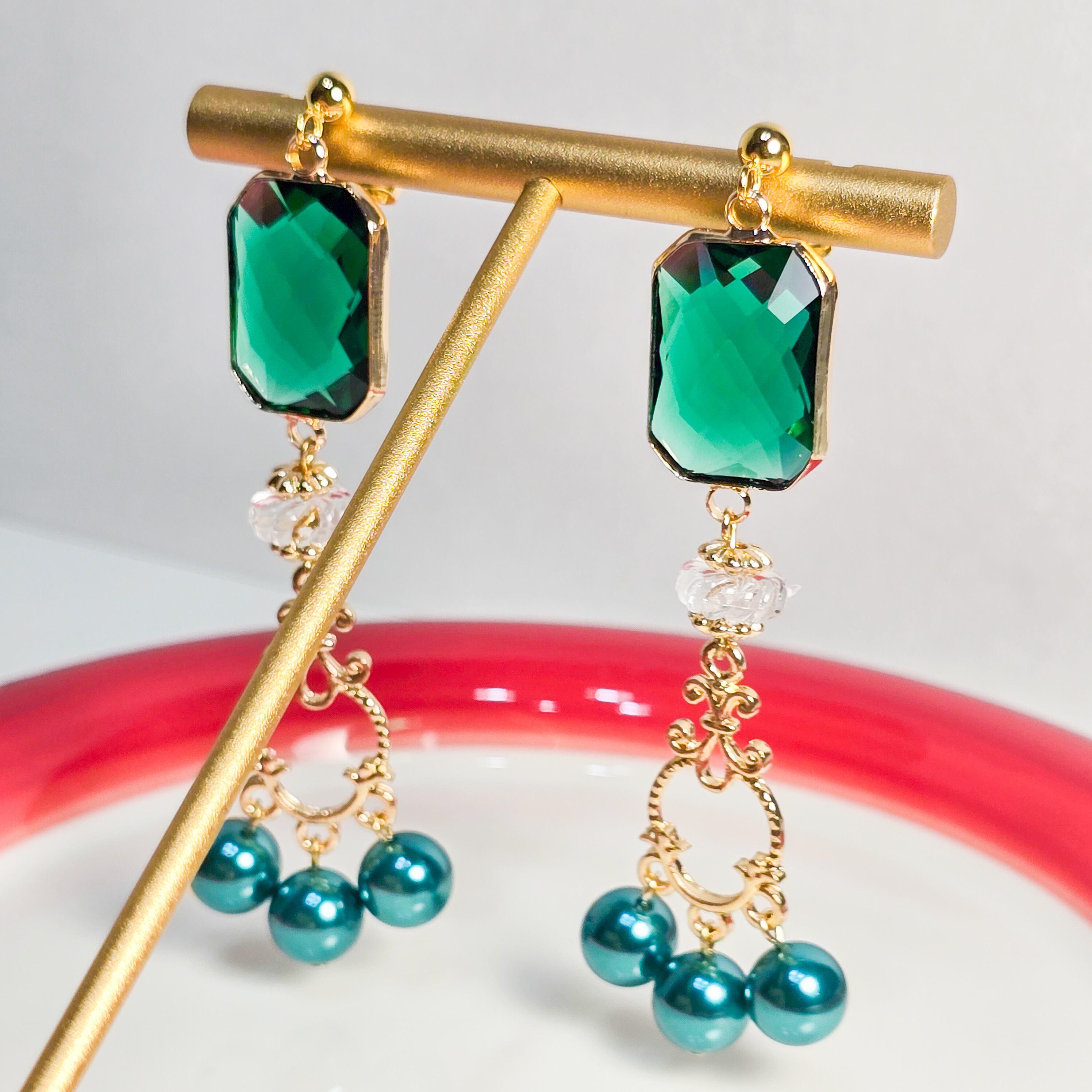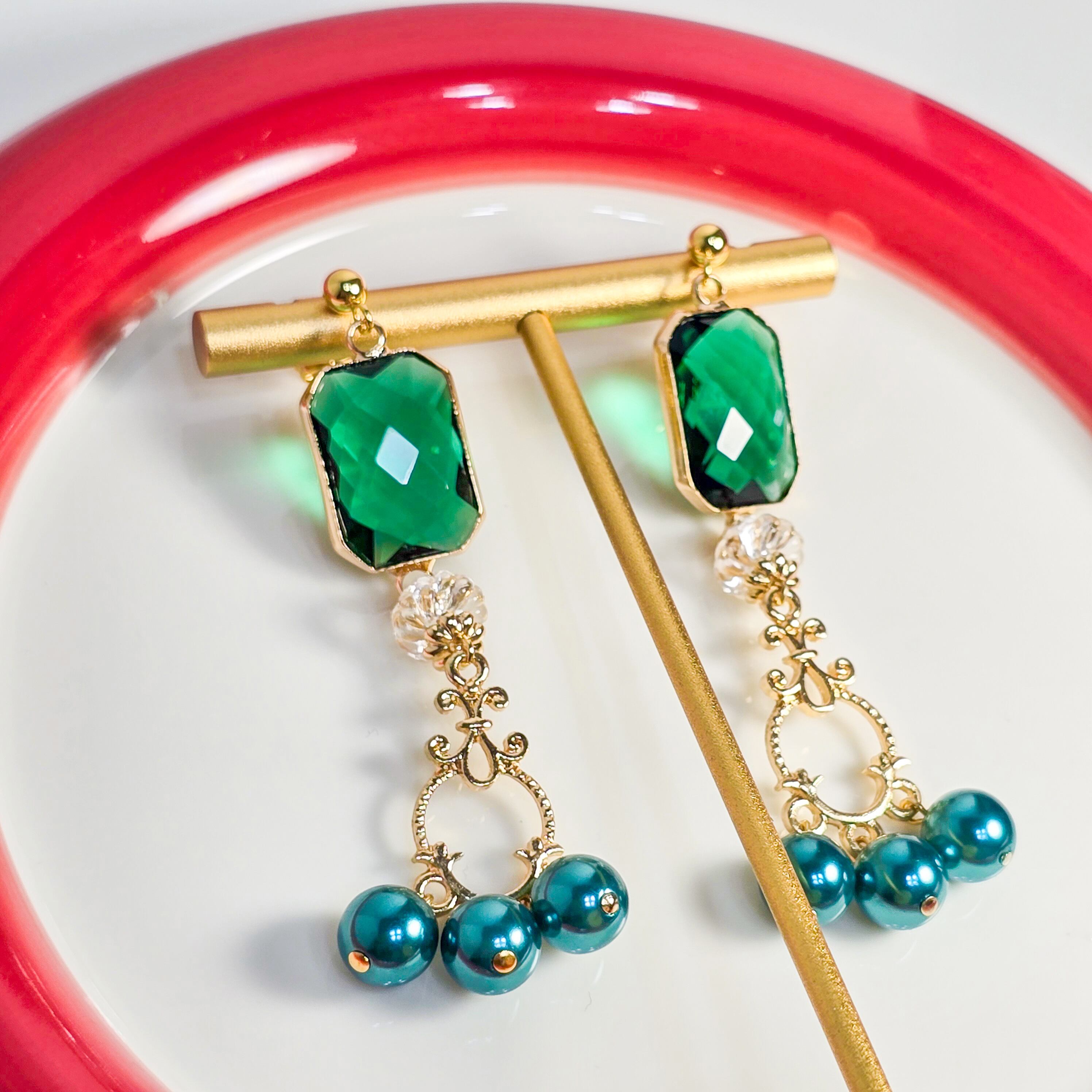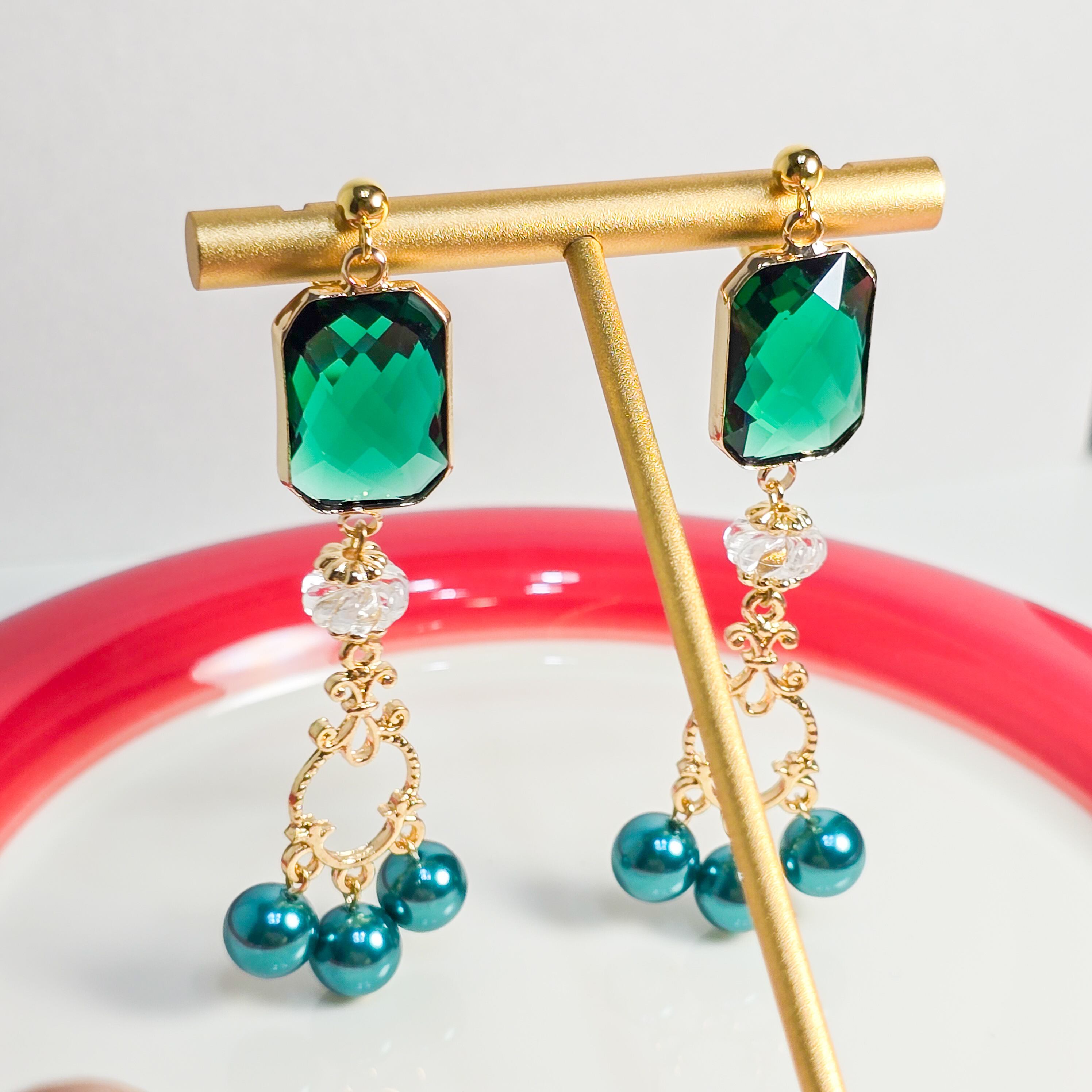 キラキラと輝くガラスカットにグリーンのパールを連なった