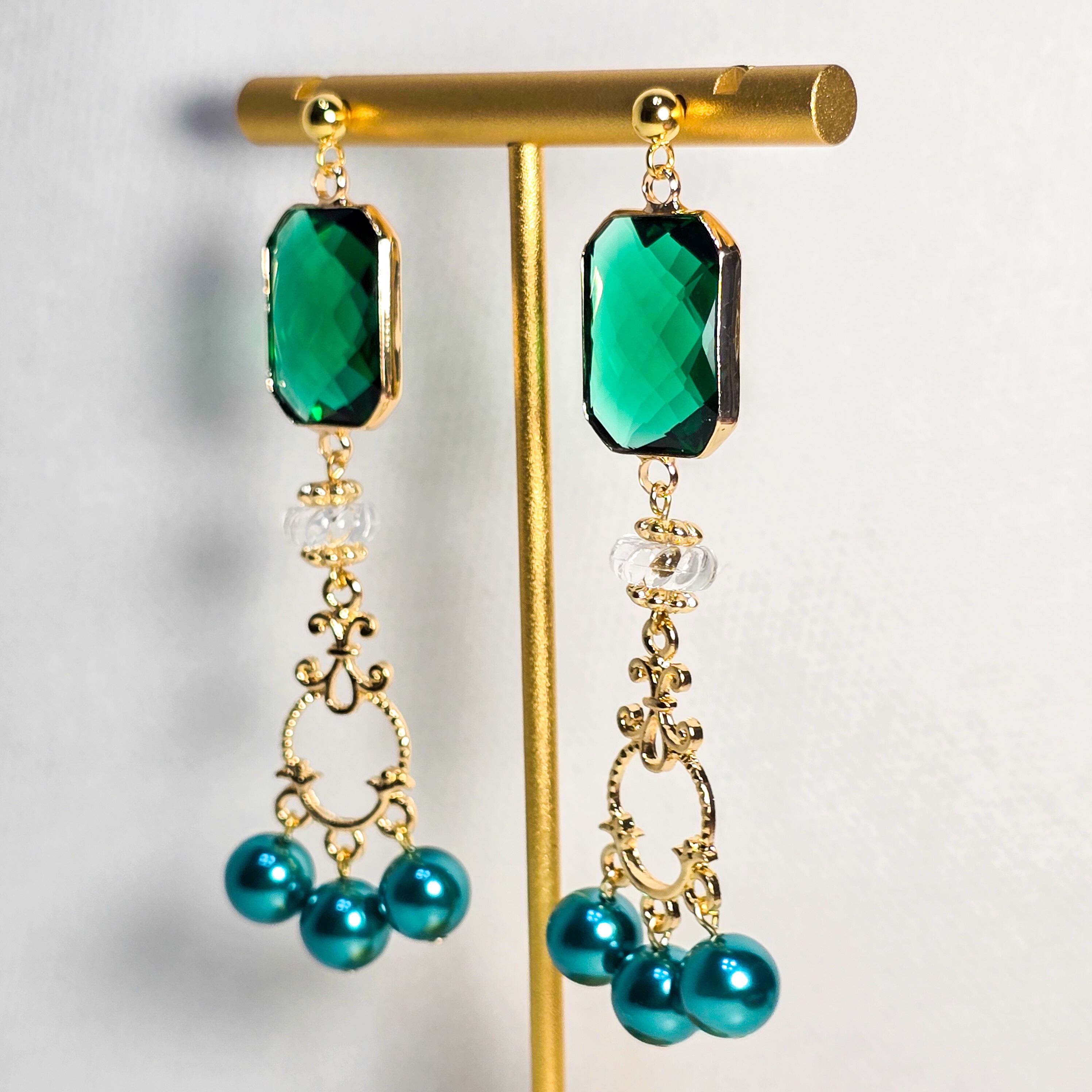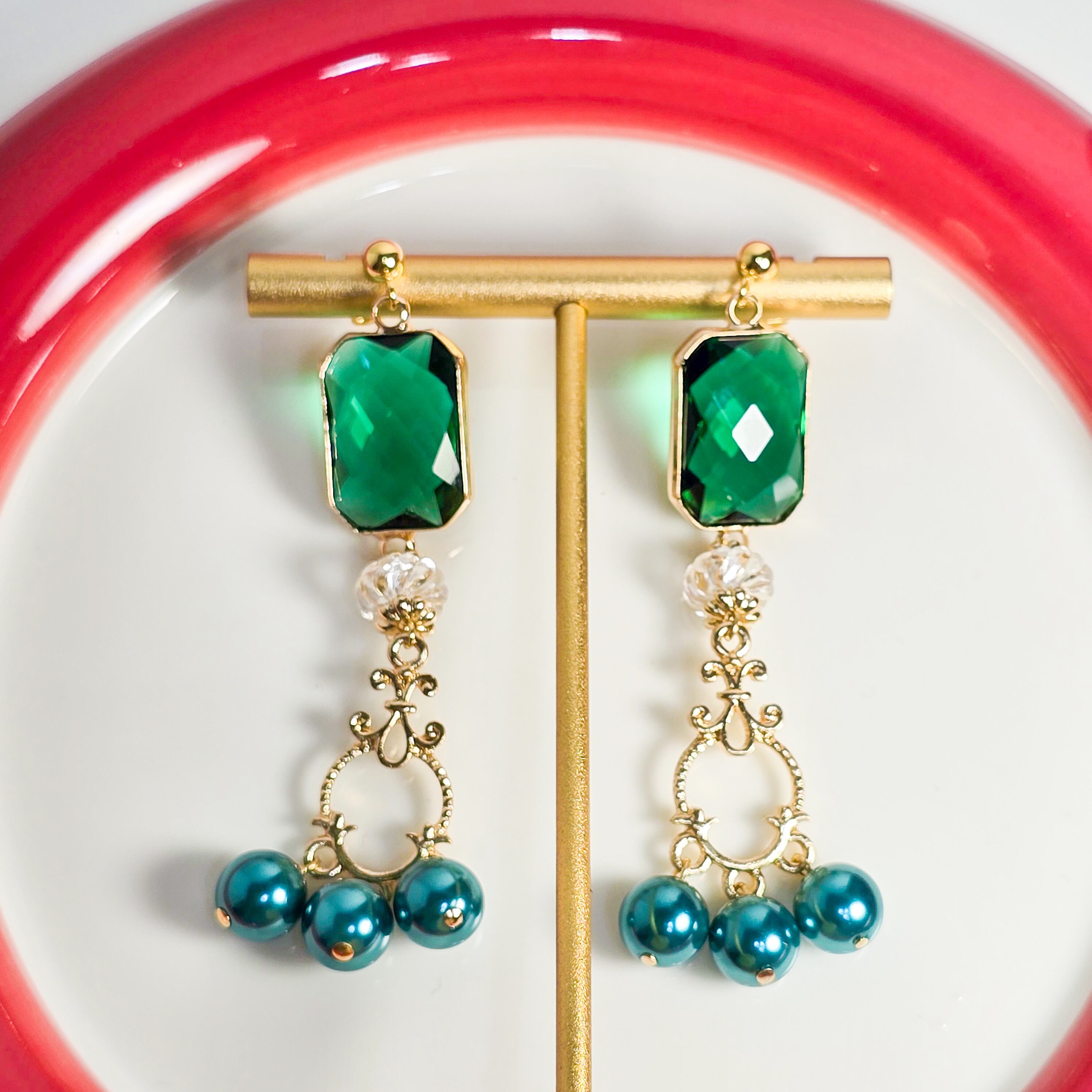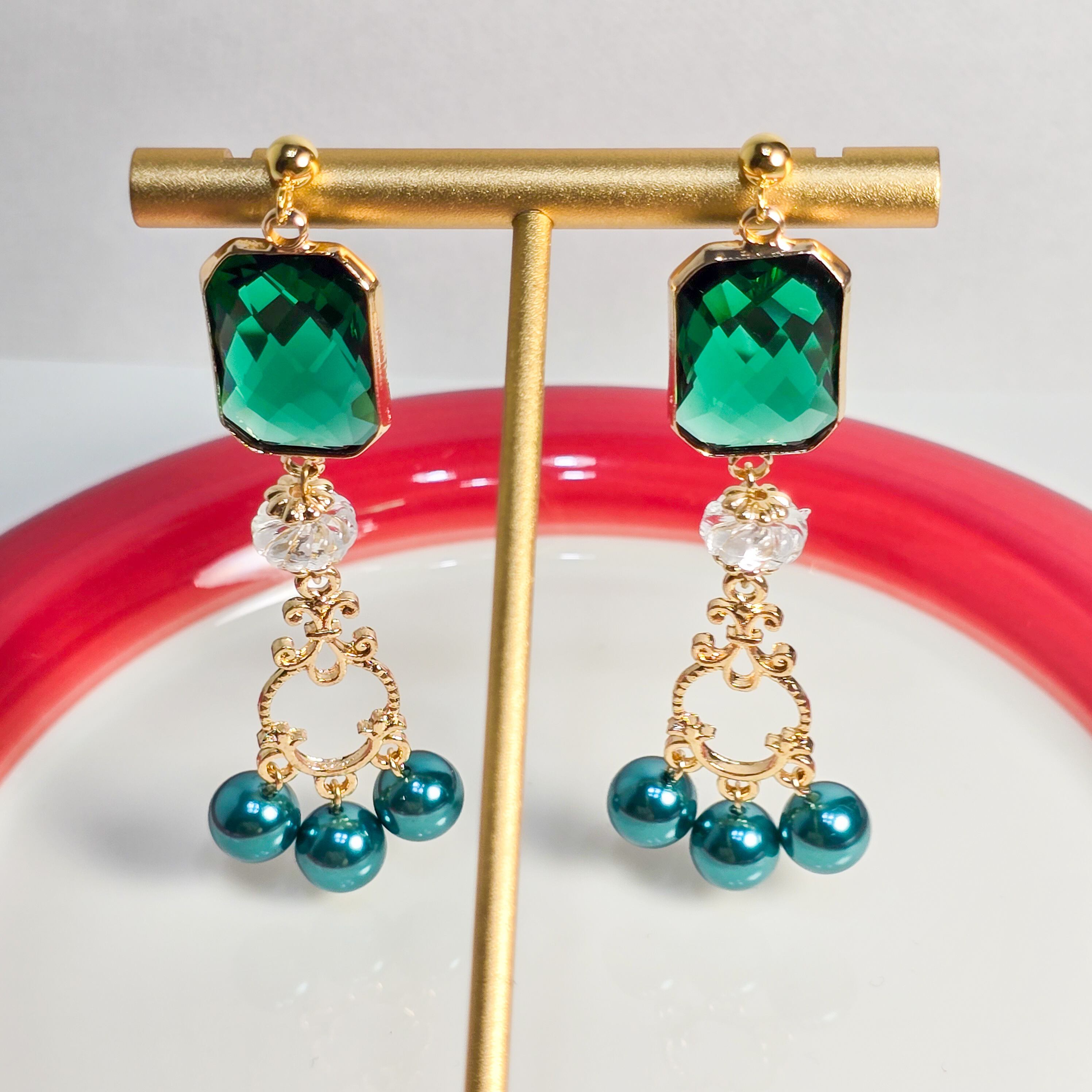 キラキラと輝くガラスカットにグリーンのパールを連なった