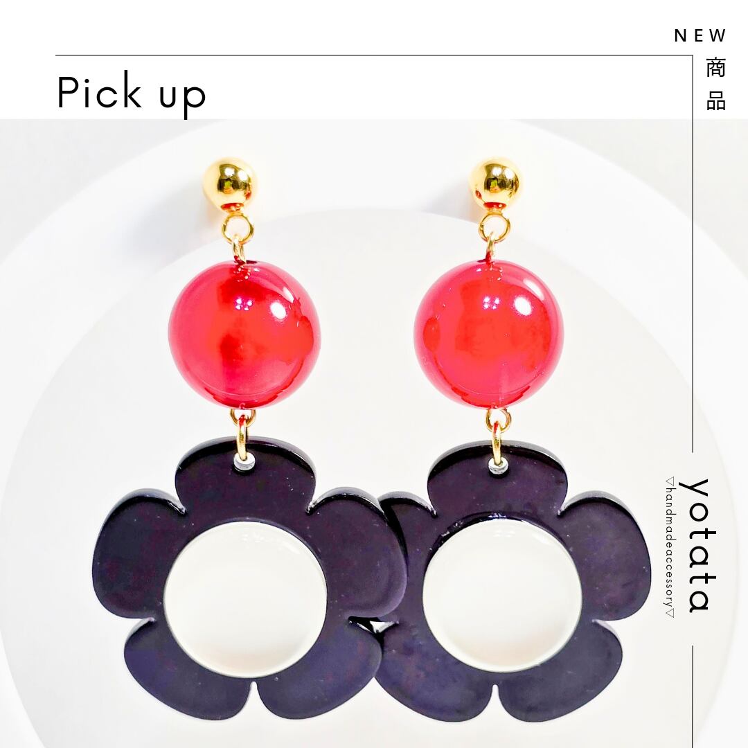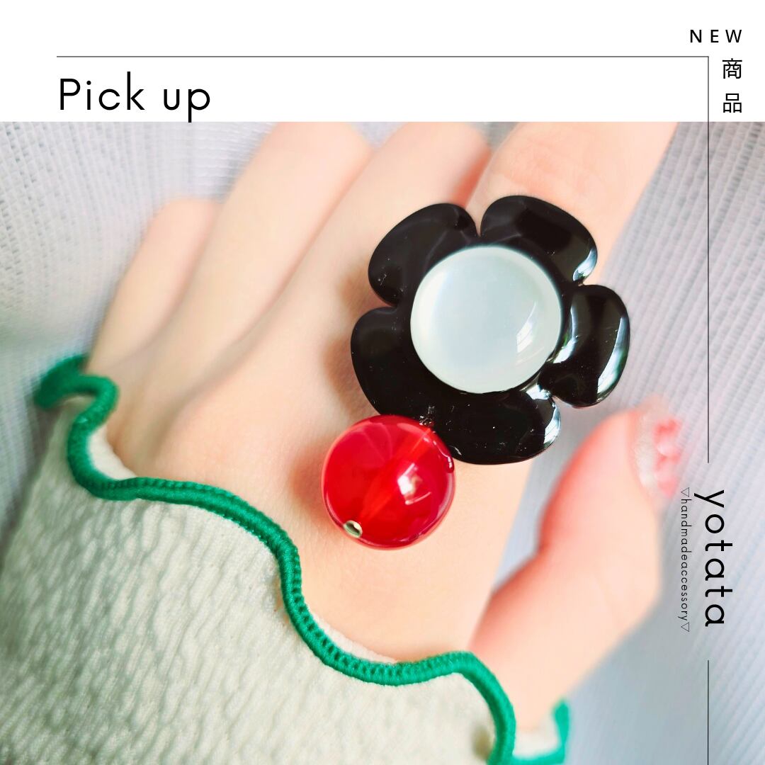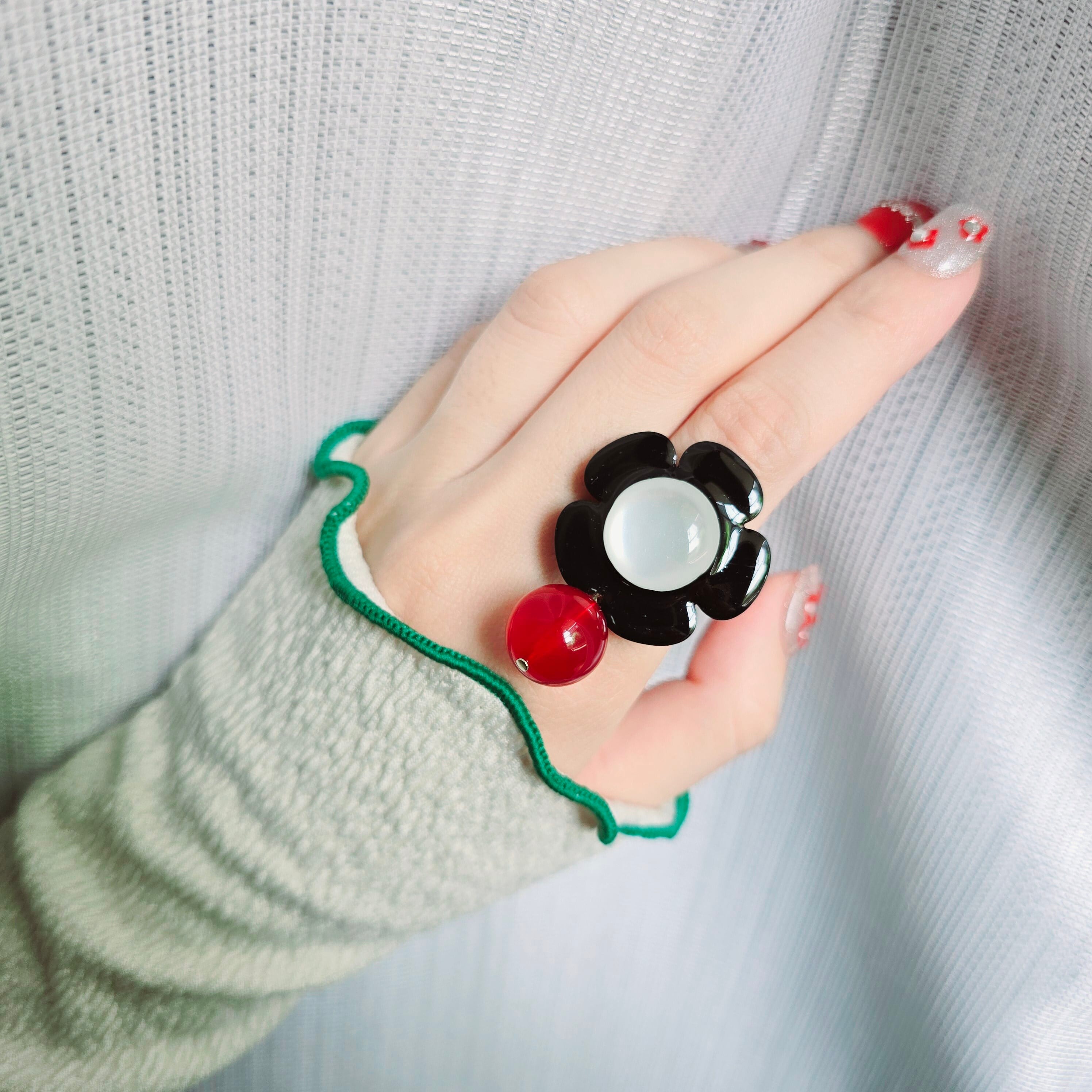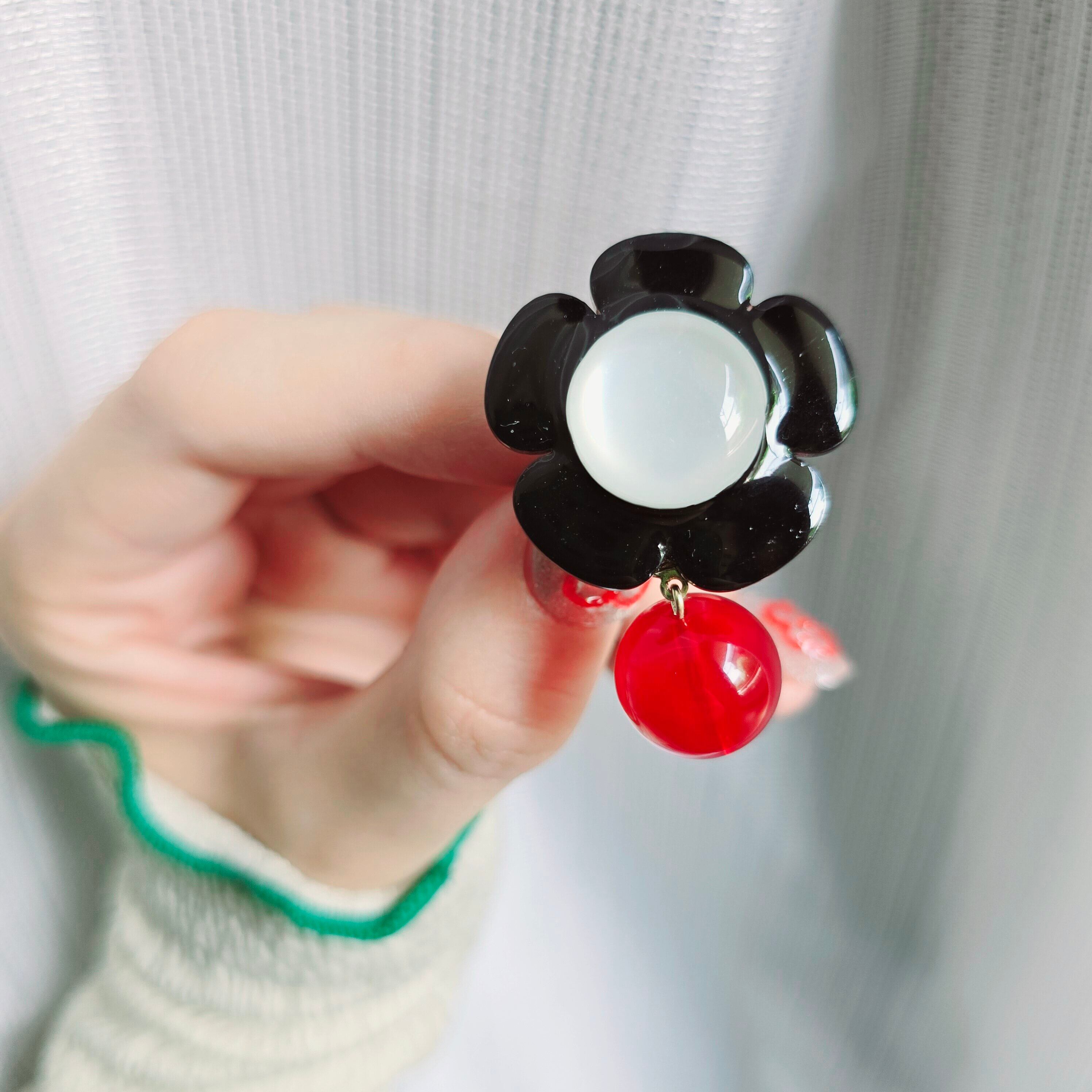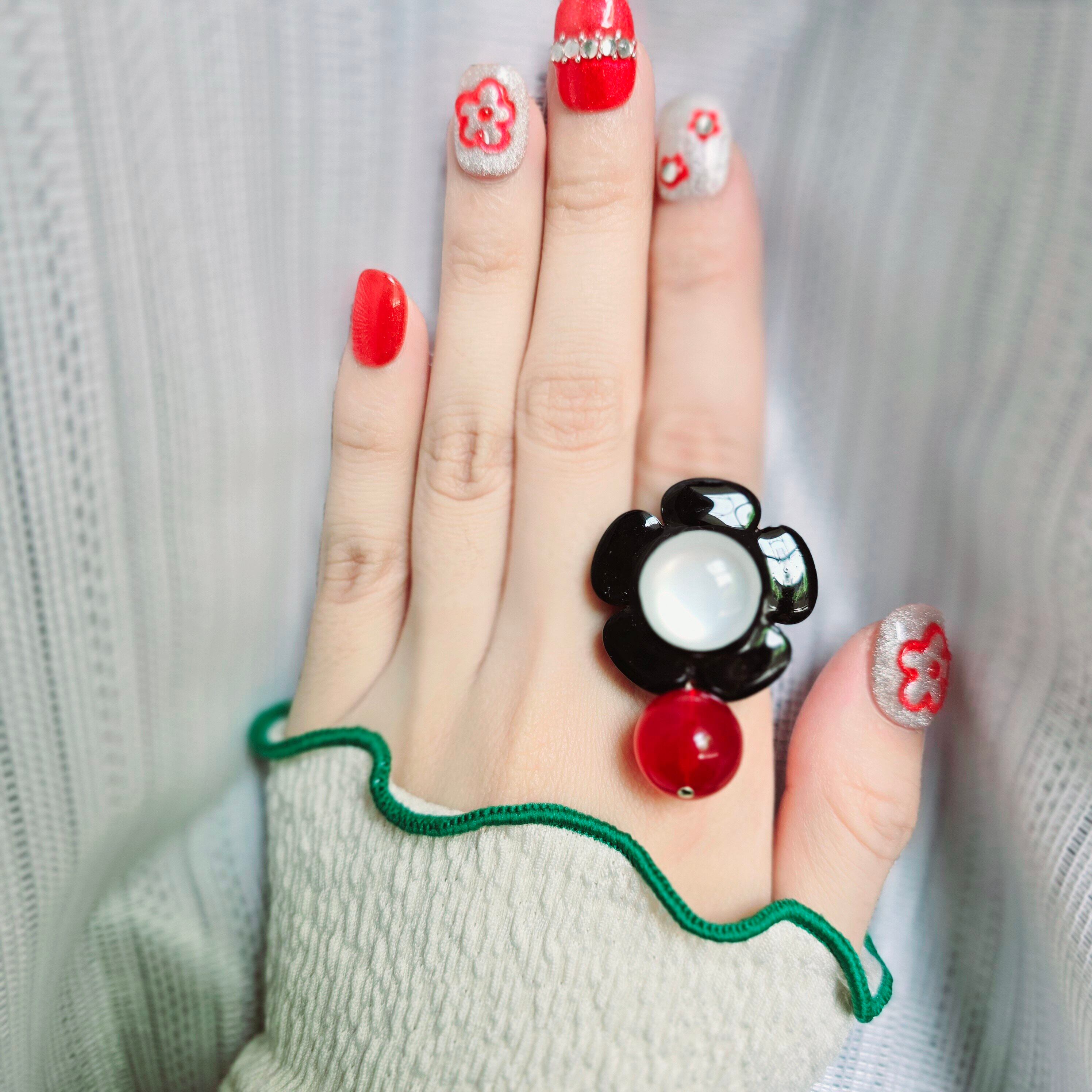 ⟬ レトロフラワーのモノトーン大ぶりリング(チェリーレッド) ⟭