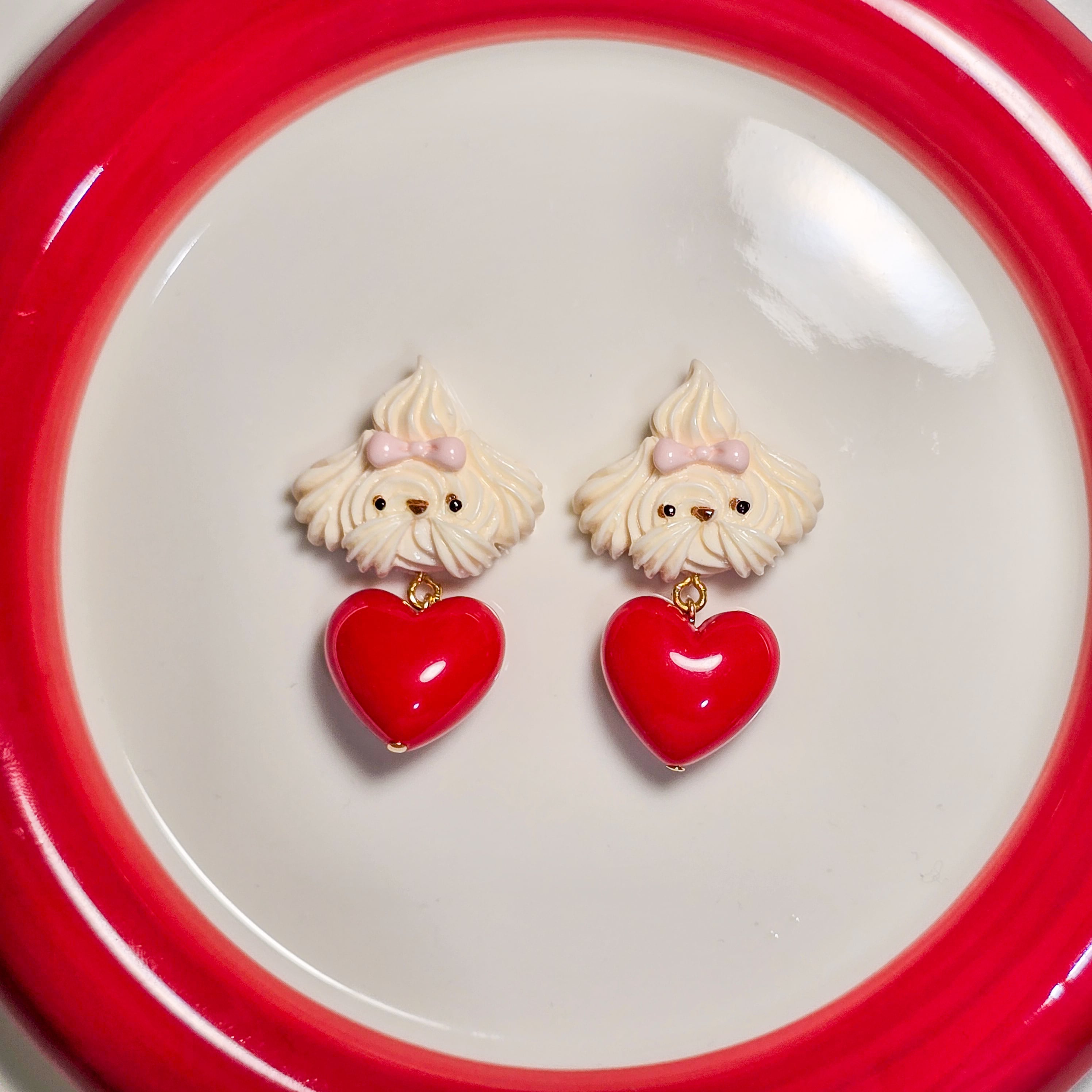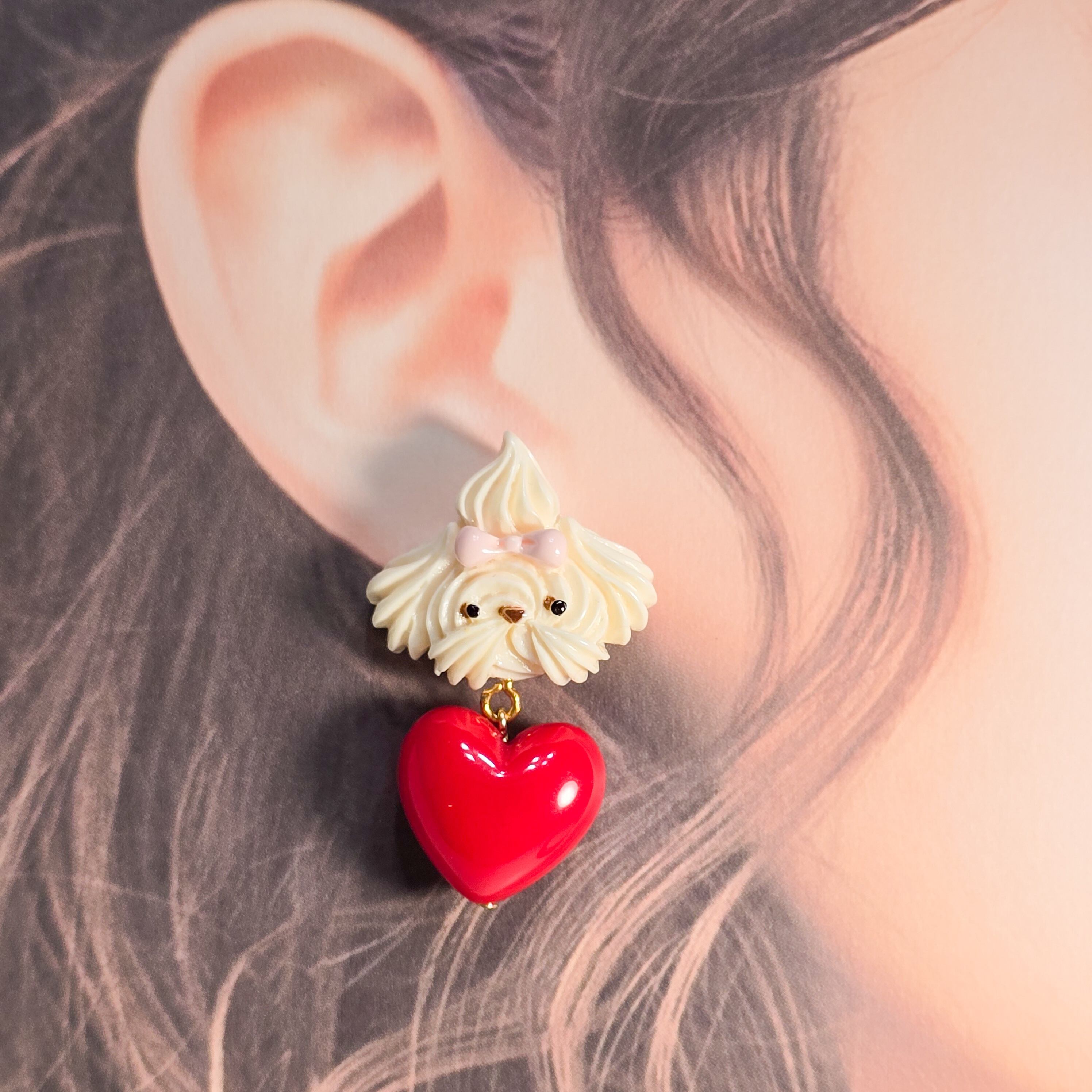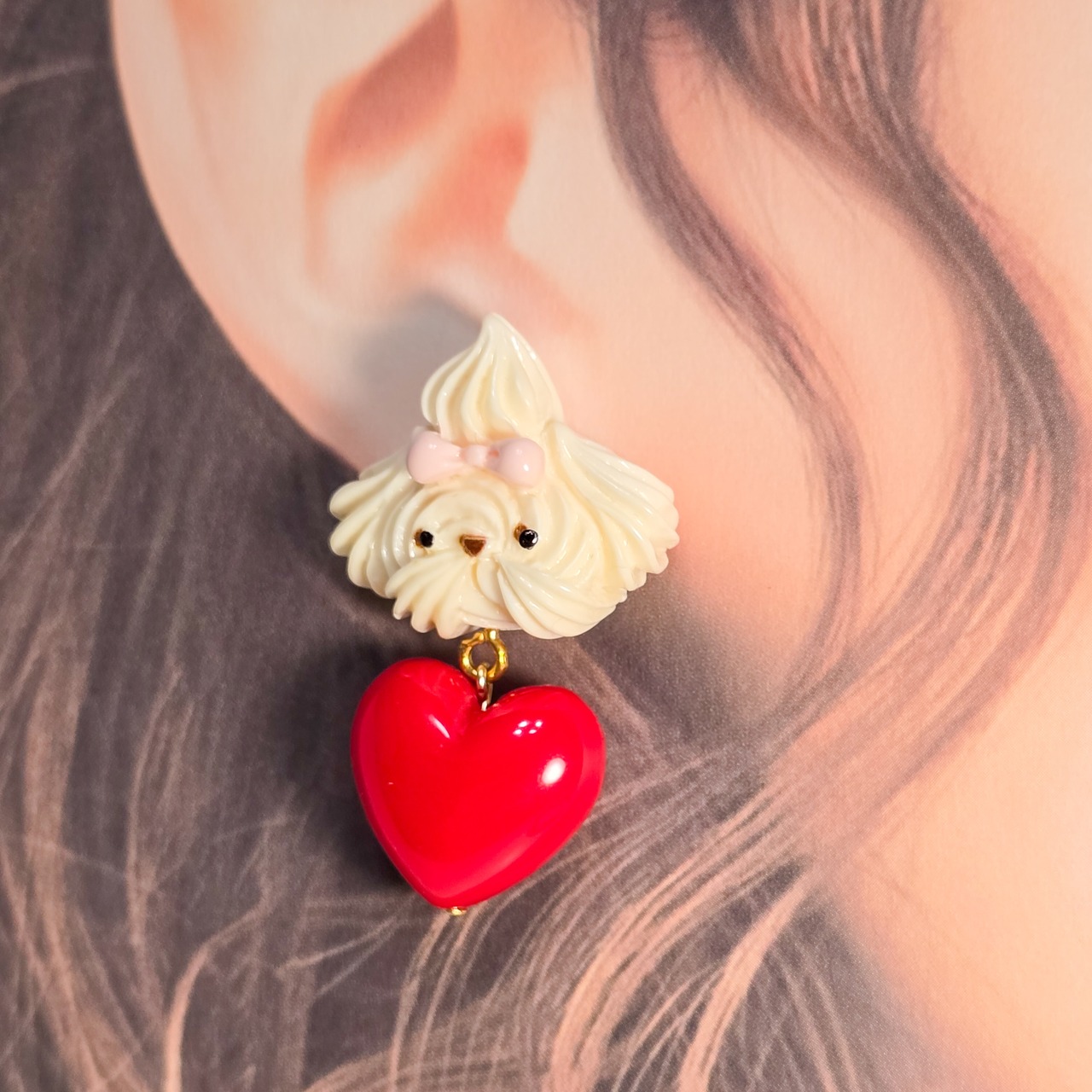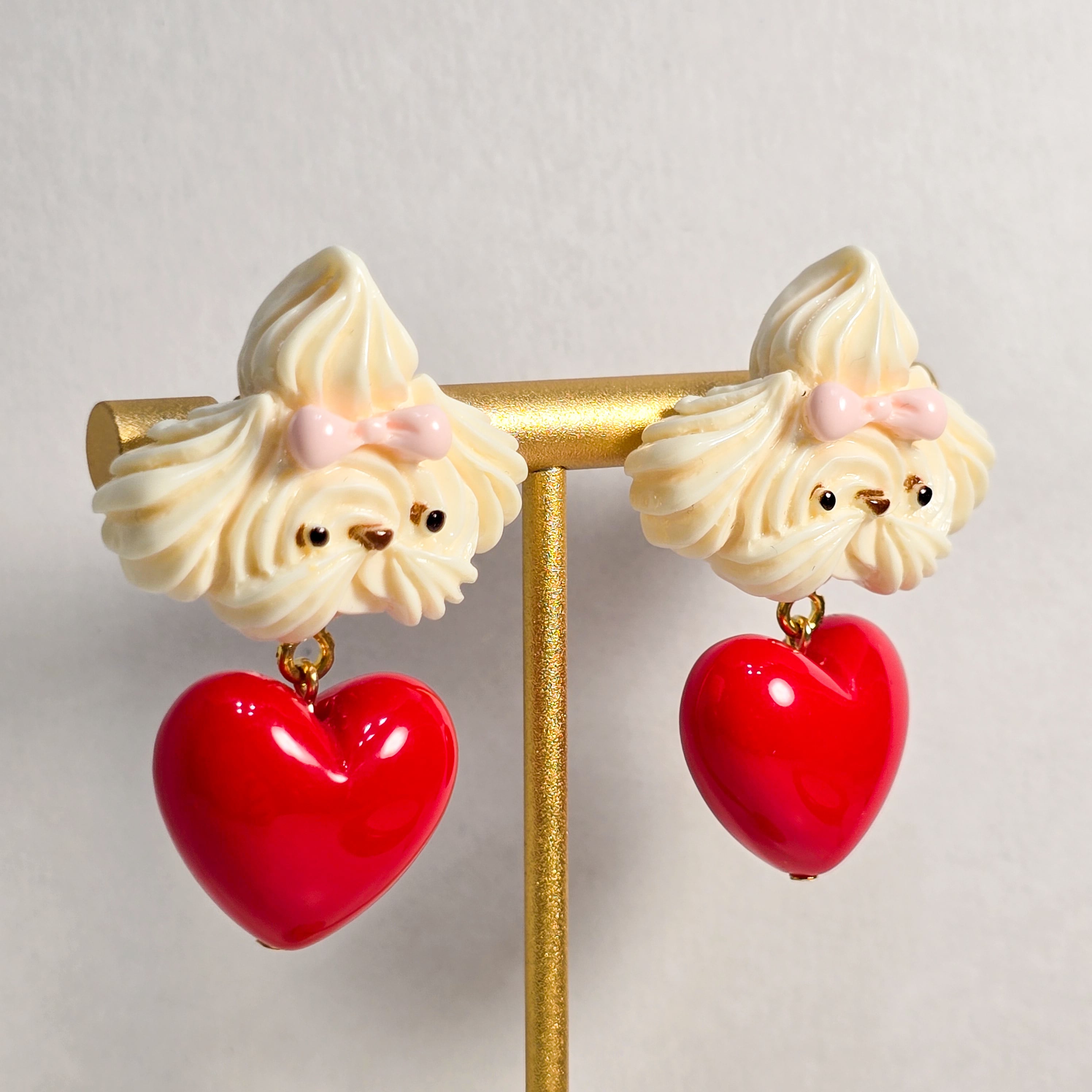 ⟬ ホイップわんちゃんとハートのピアス&イヤリング(クリーム色のわんちゃん) ⟭