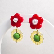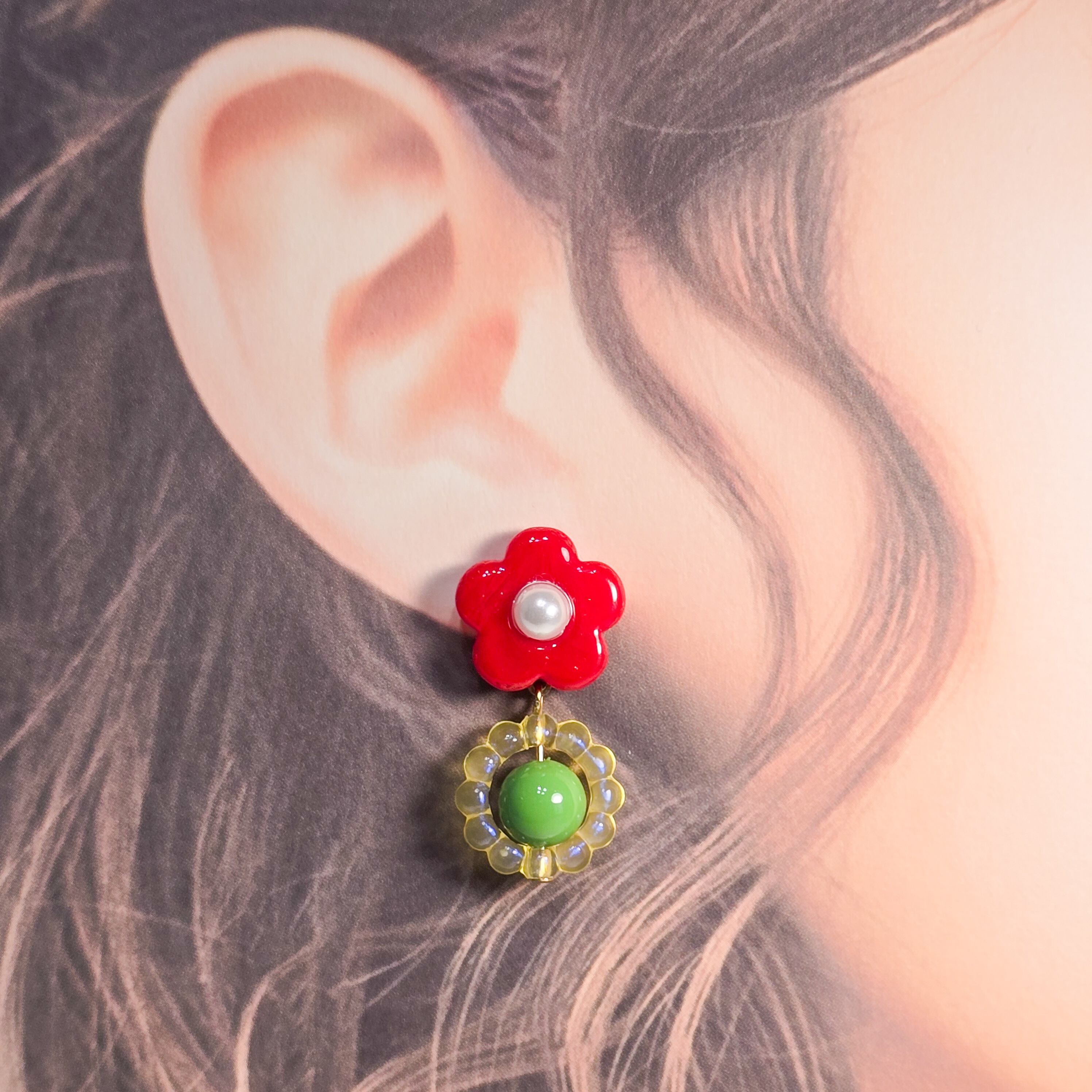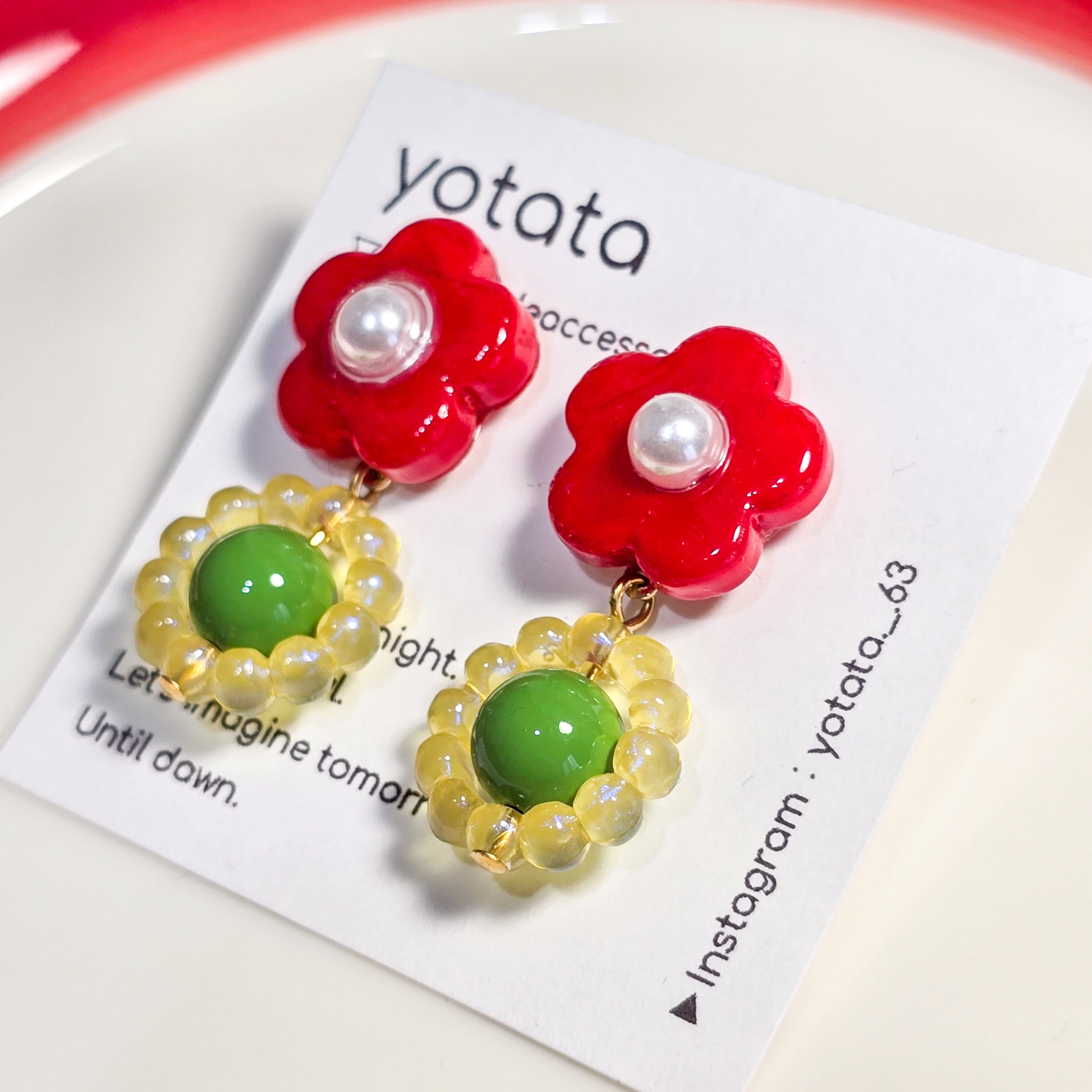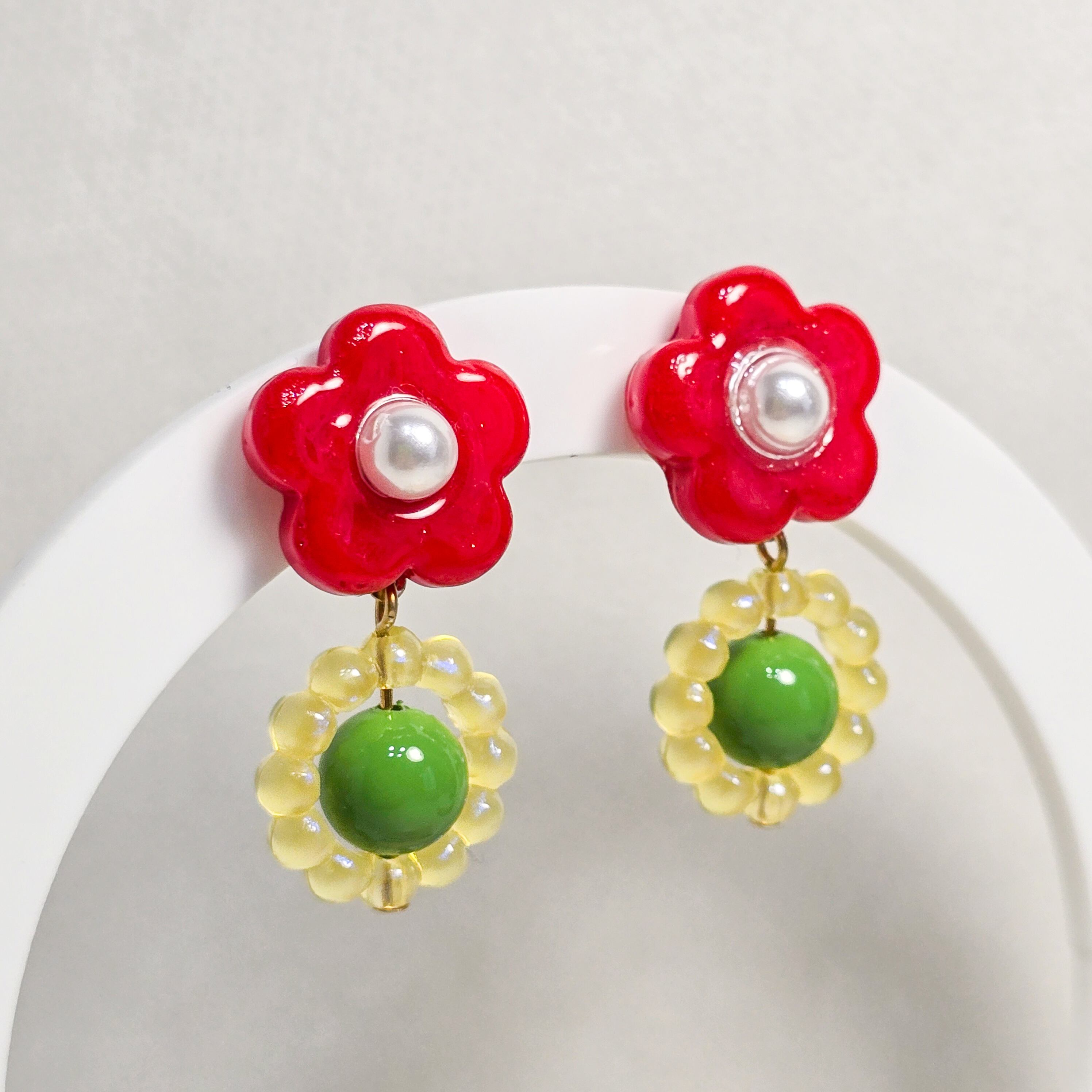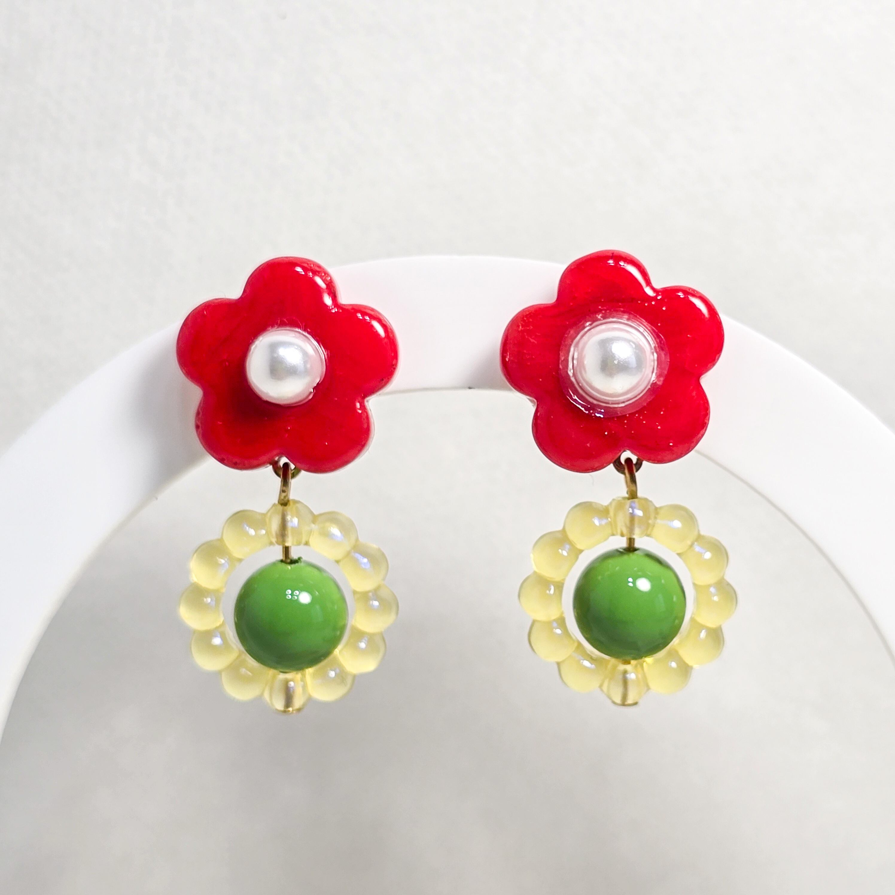 ⟬ バブルリングとポップなガラスフラワー(レッド)ピアス&イヤリング ⟭