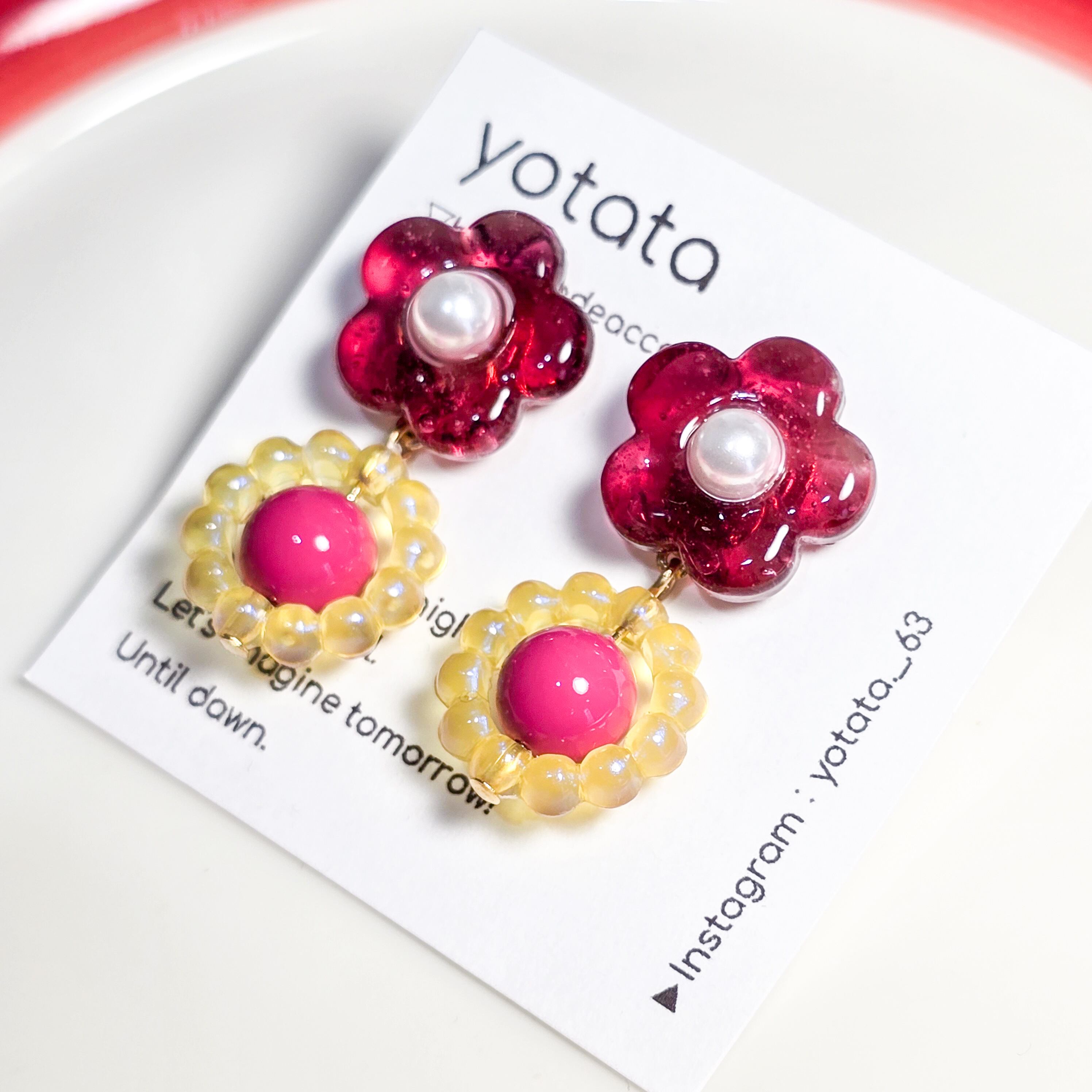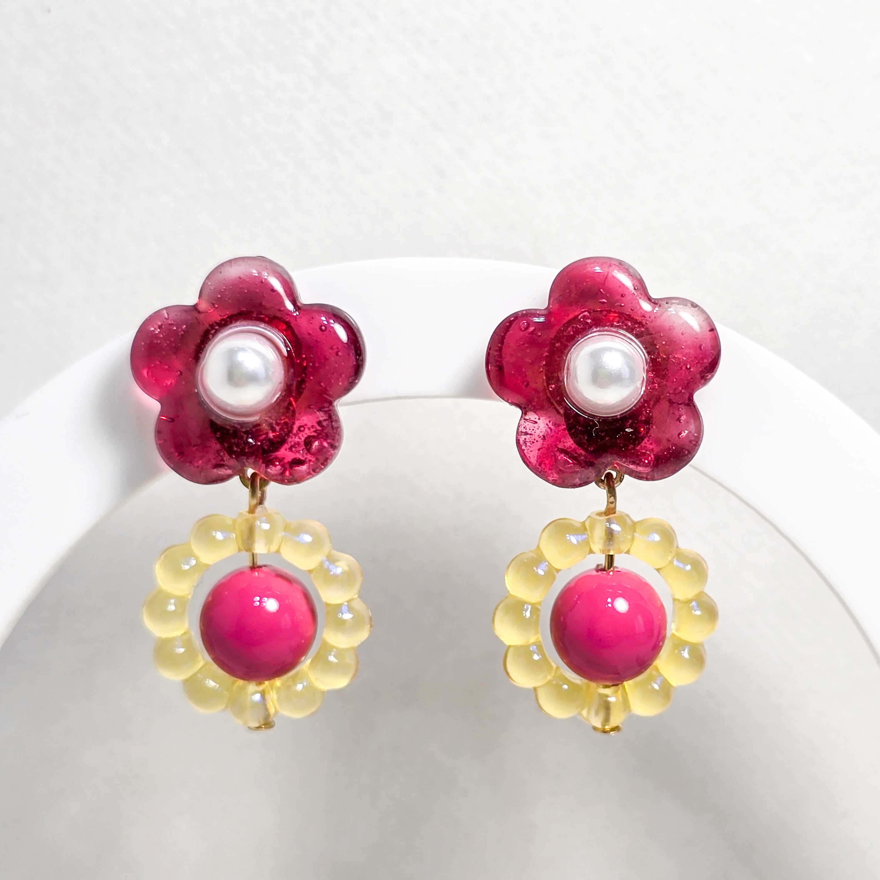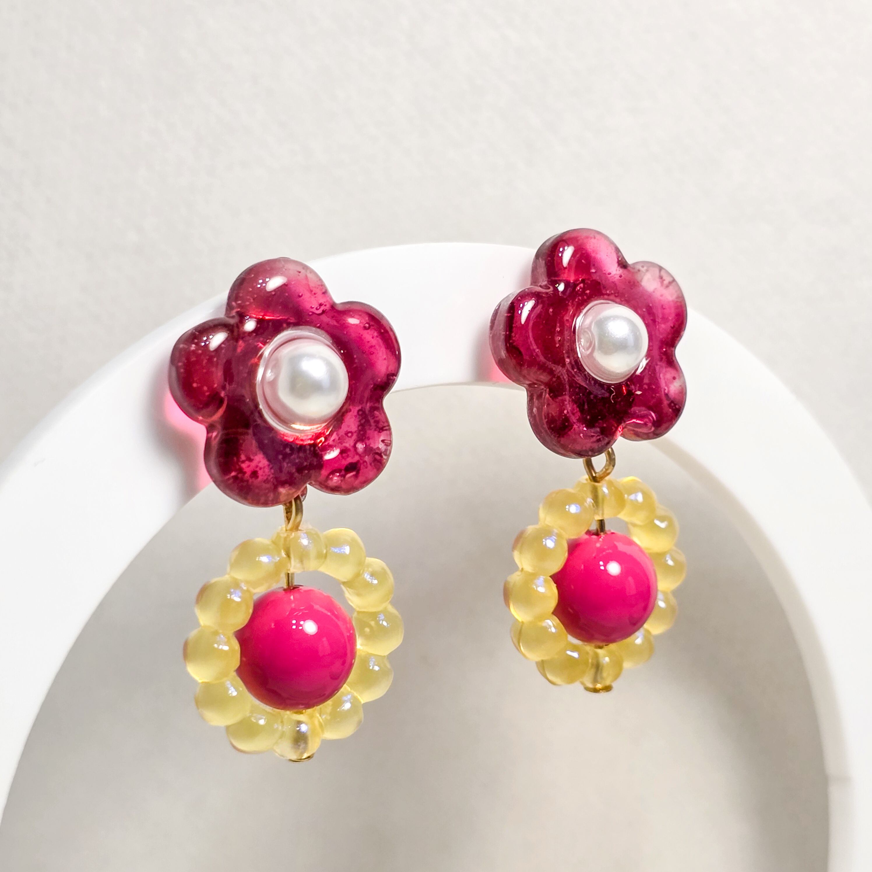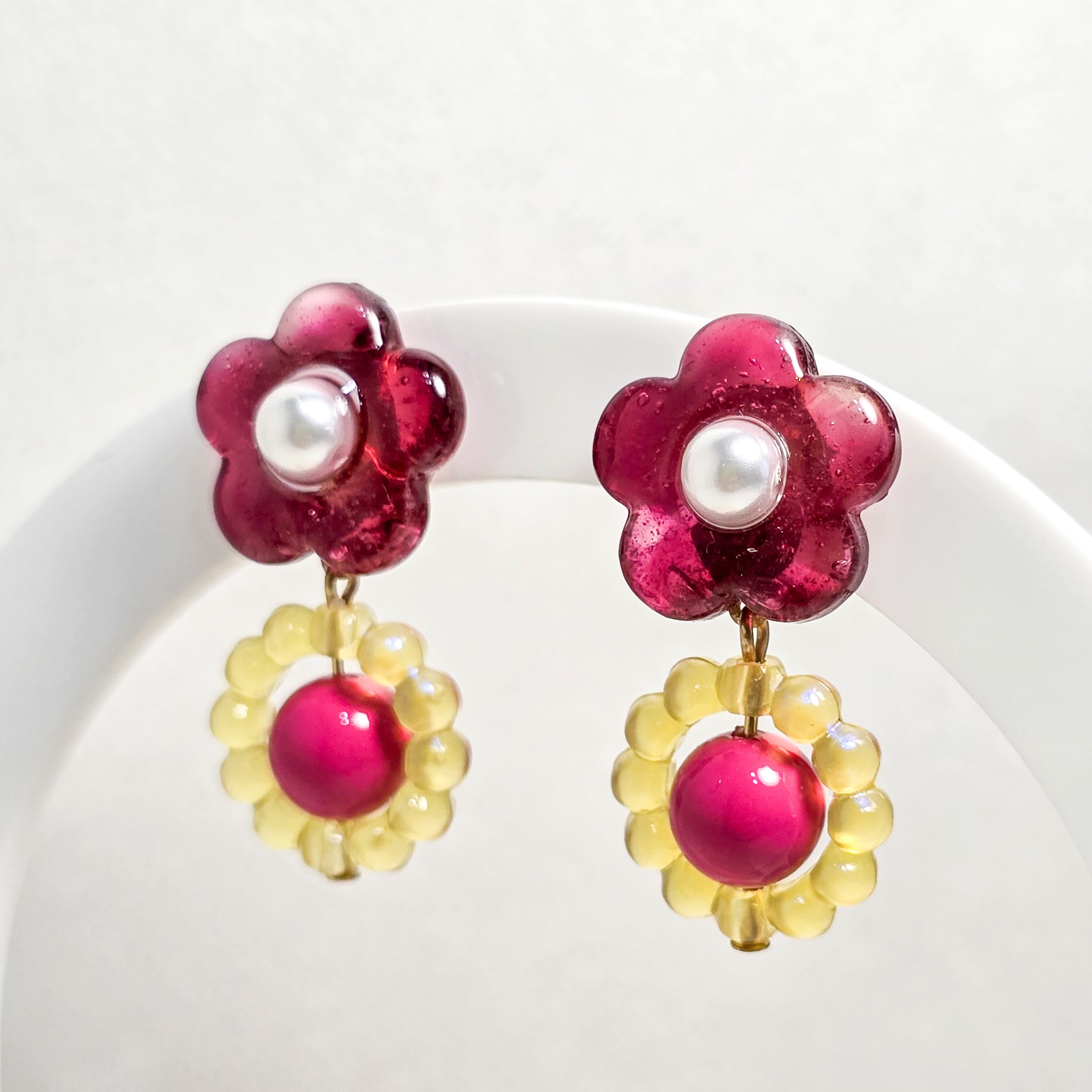⟬ バブルリングとポップなガラスフラワー(ワインレッド)ピアス&イヤリング ⟭