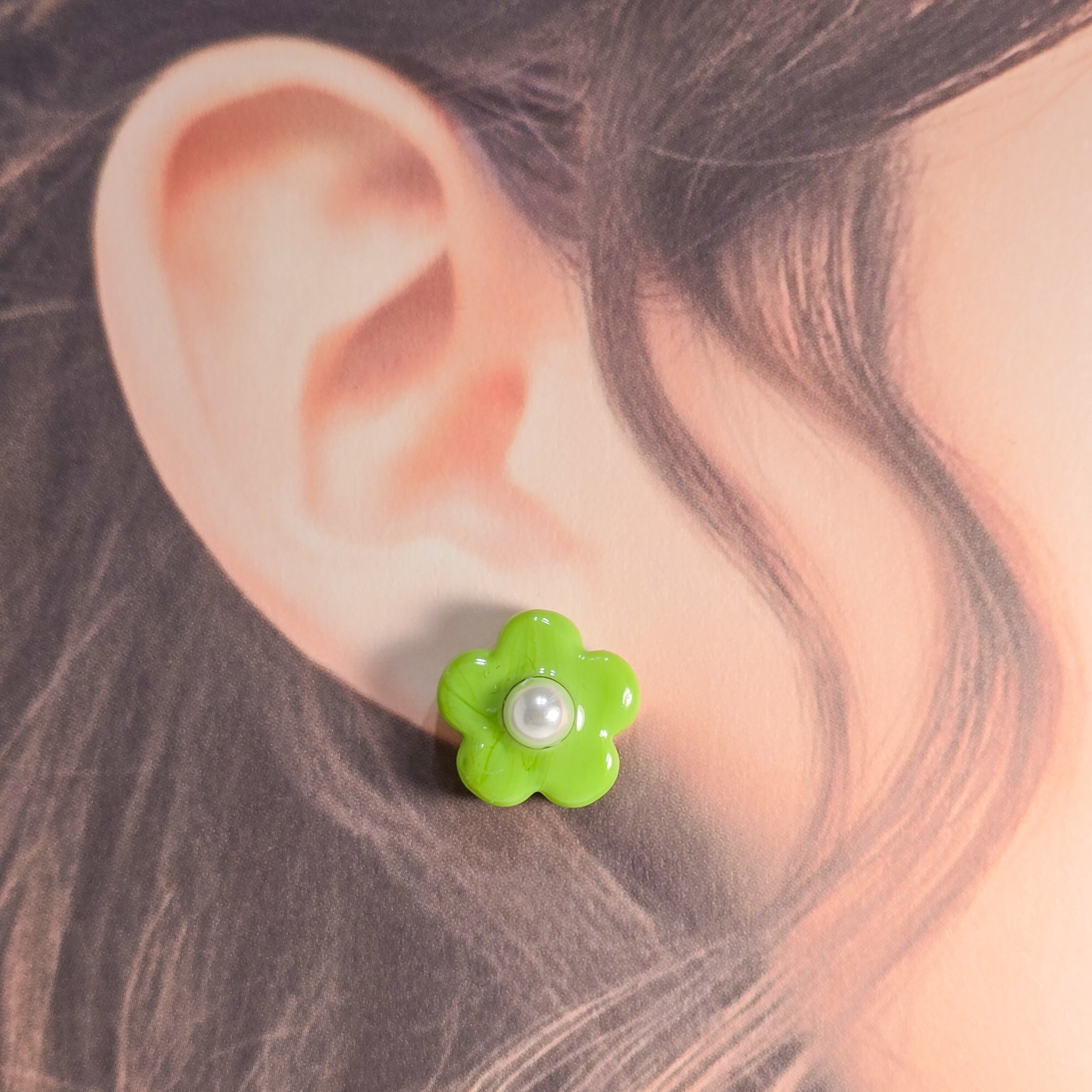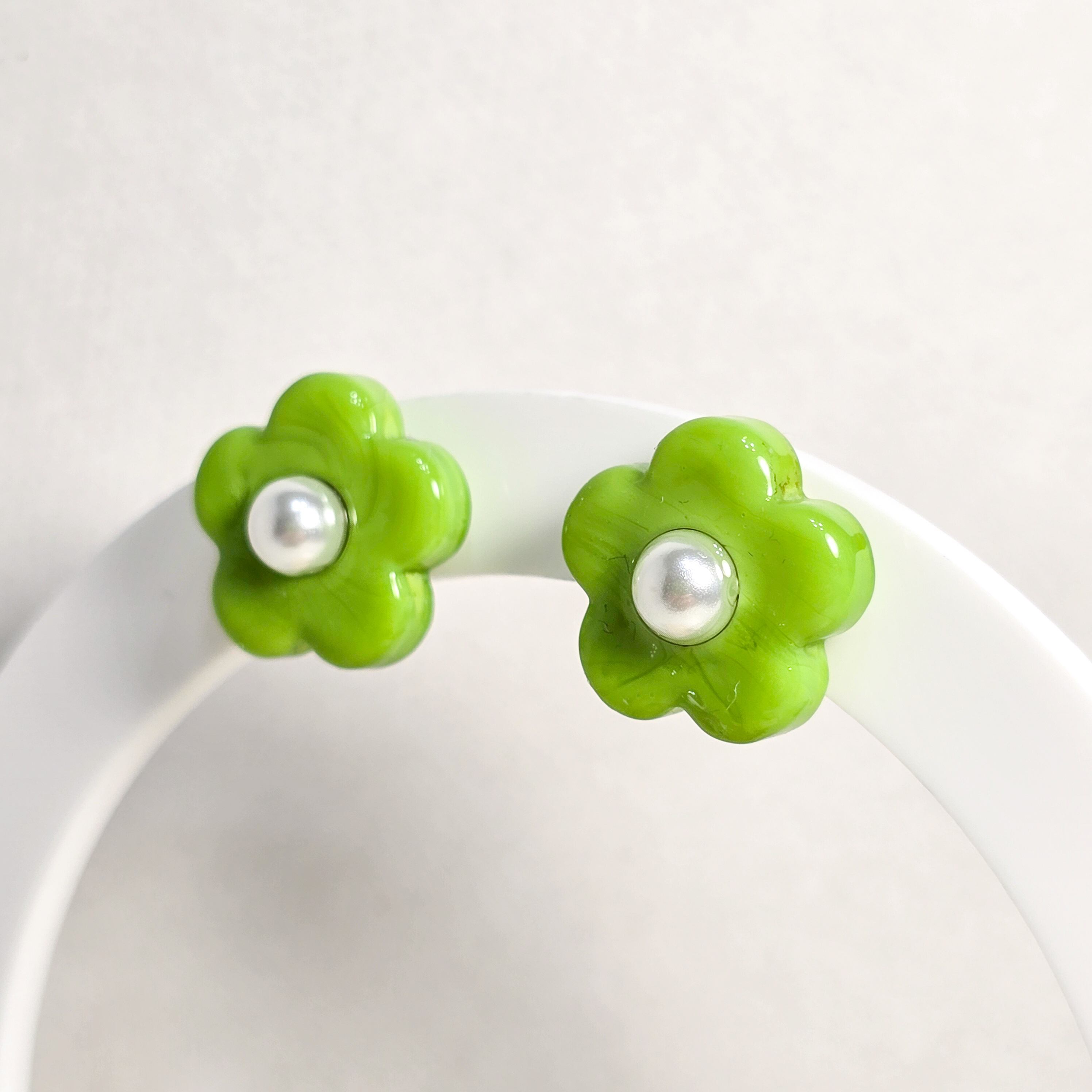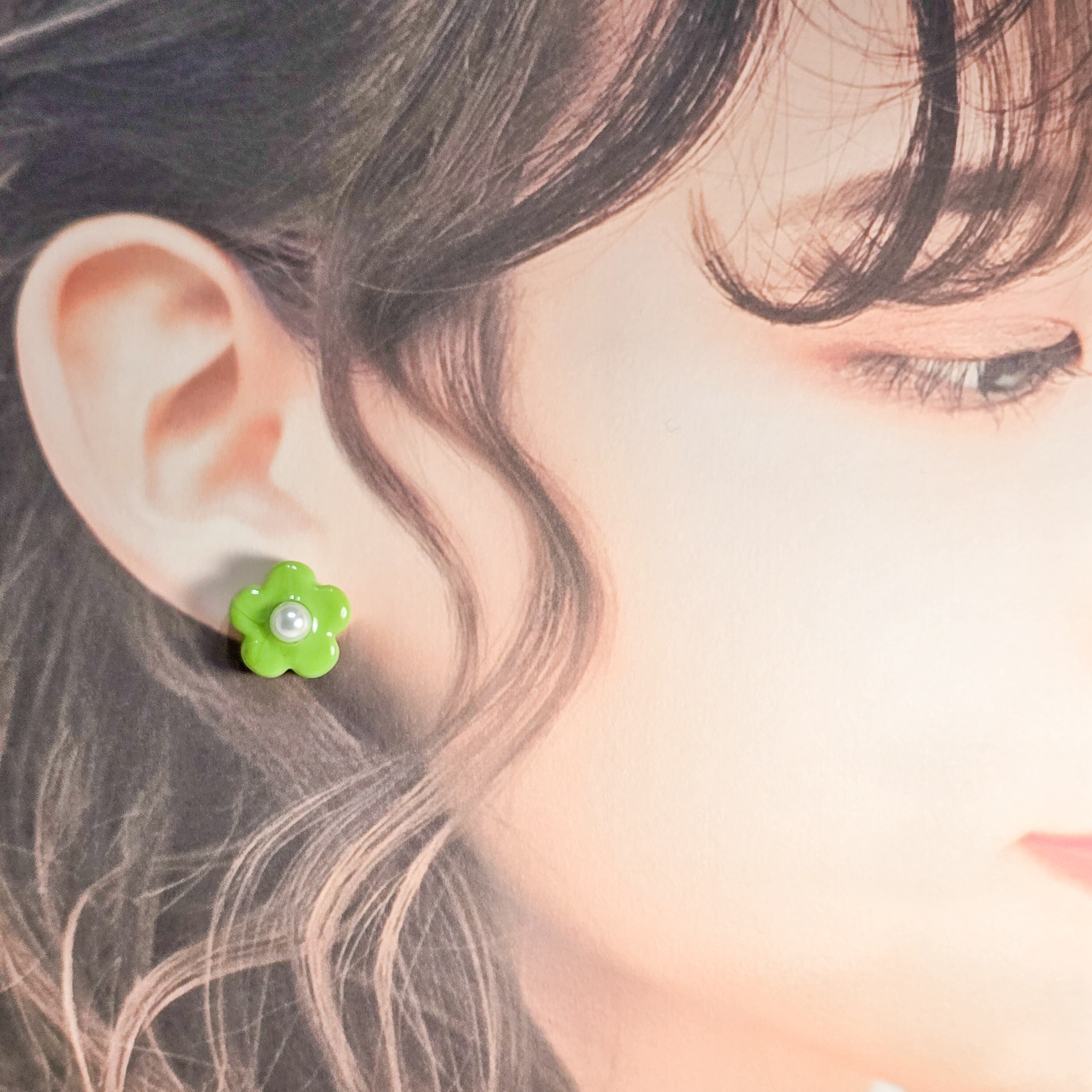⟬ ポップな1粒ガラスフラワー(グリーン)ピアス&イヤリング ⟭