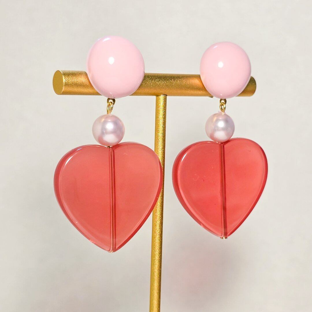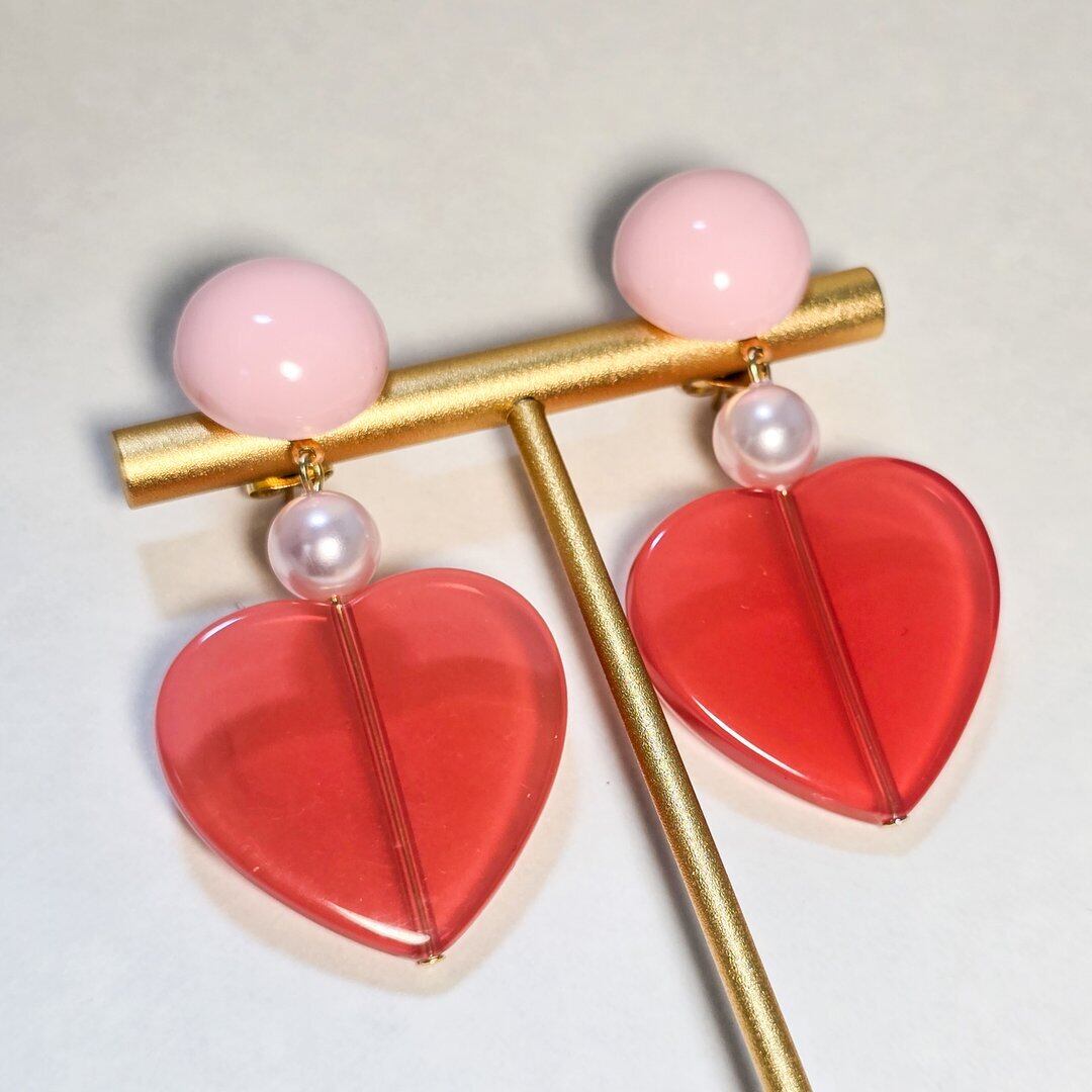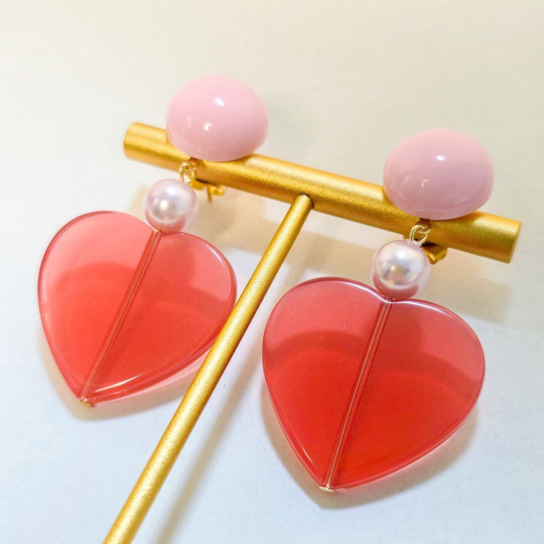 ⟬ ピンク×クリアレッドの大ぶりハートピアス&イヤリング ⟭