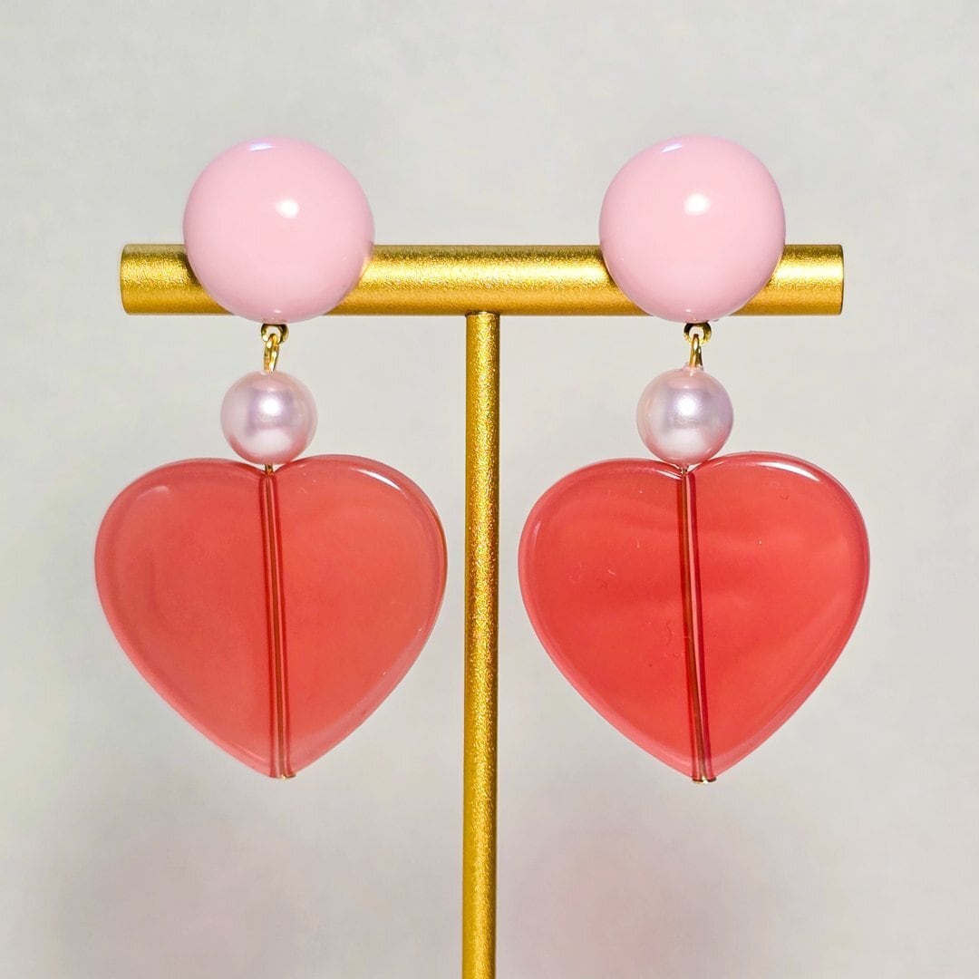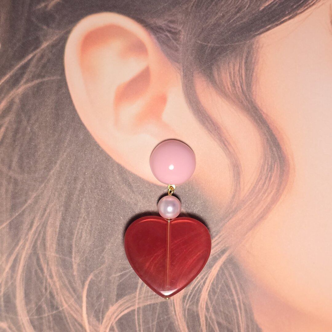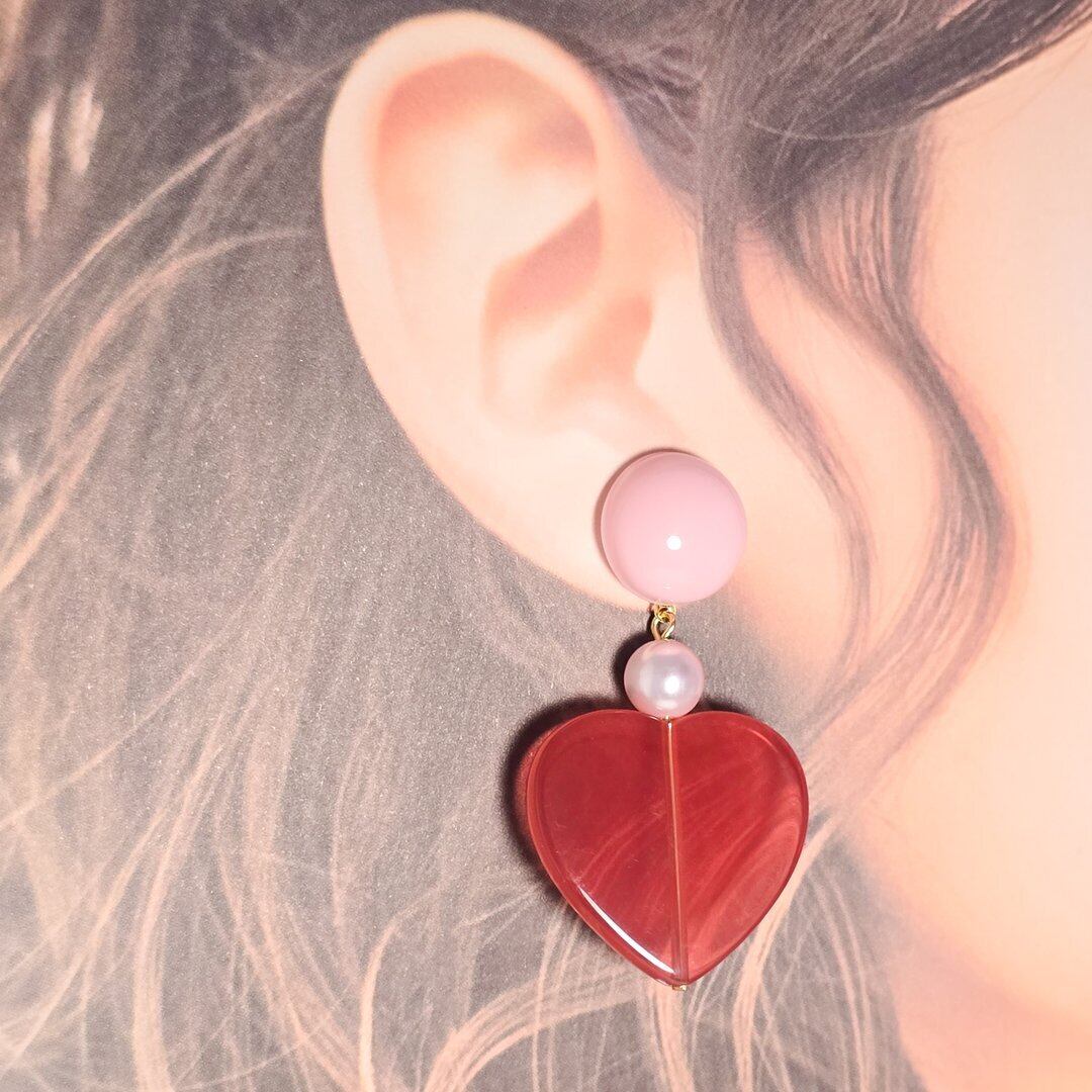 ⟬ ピンク×クリアレッドの大ぶりハートピアス&イヤリング ⟭