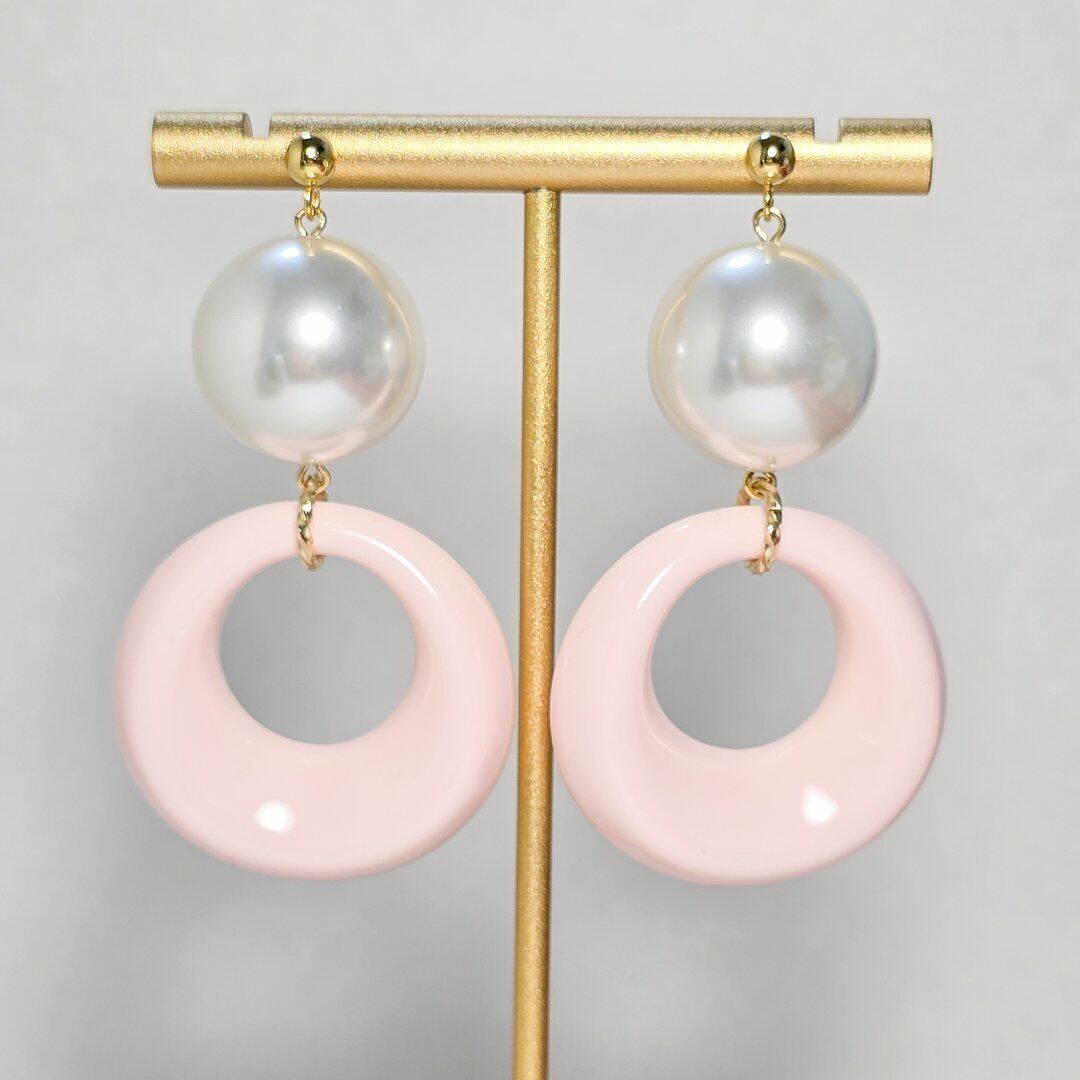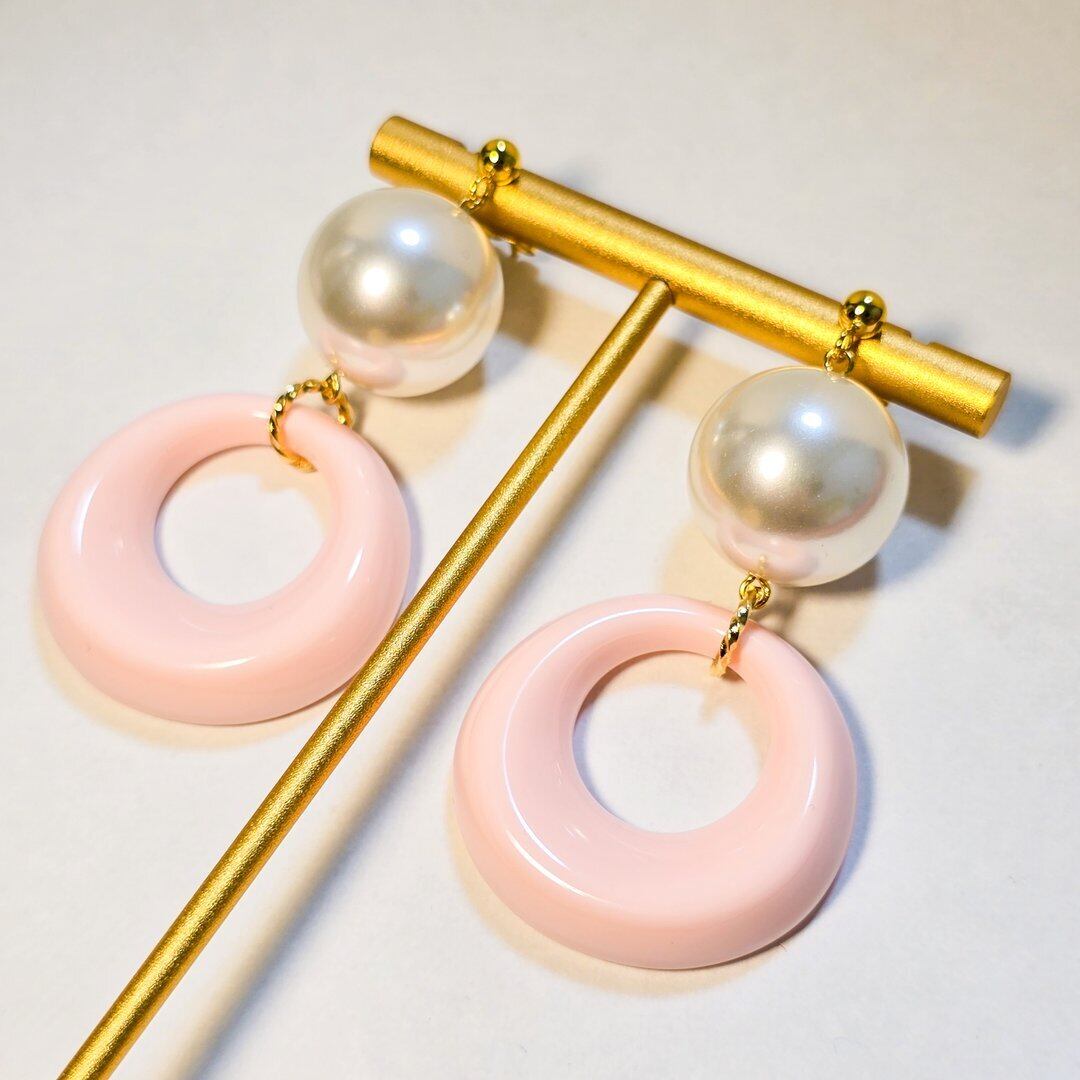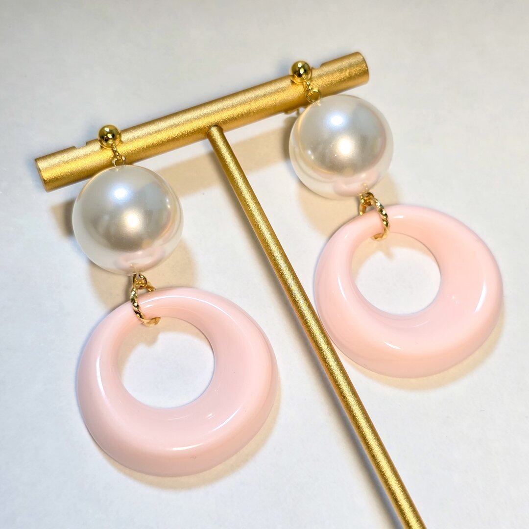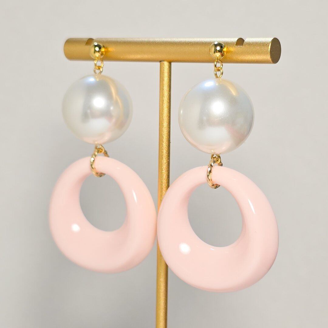 ⟬ 大ぶりレトロフープ(ホワイトパール×ミルクピンク)ピアス&イヤリング ⟭
