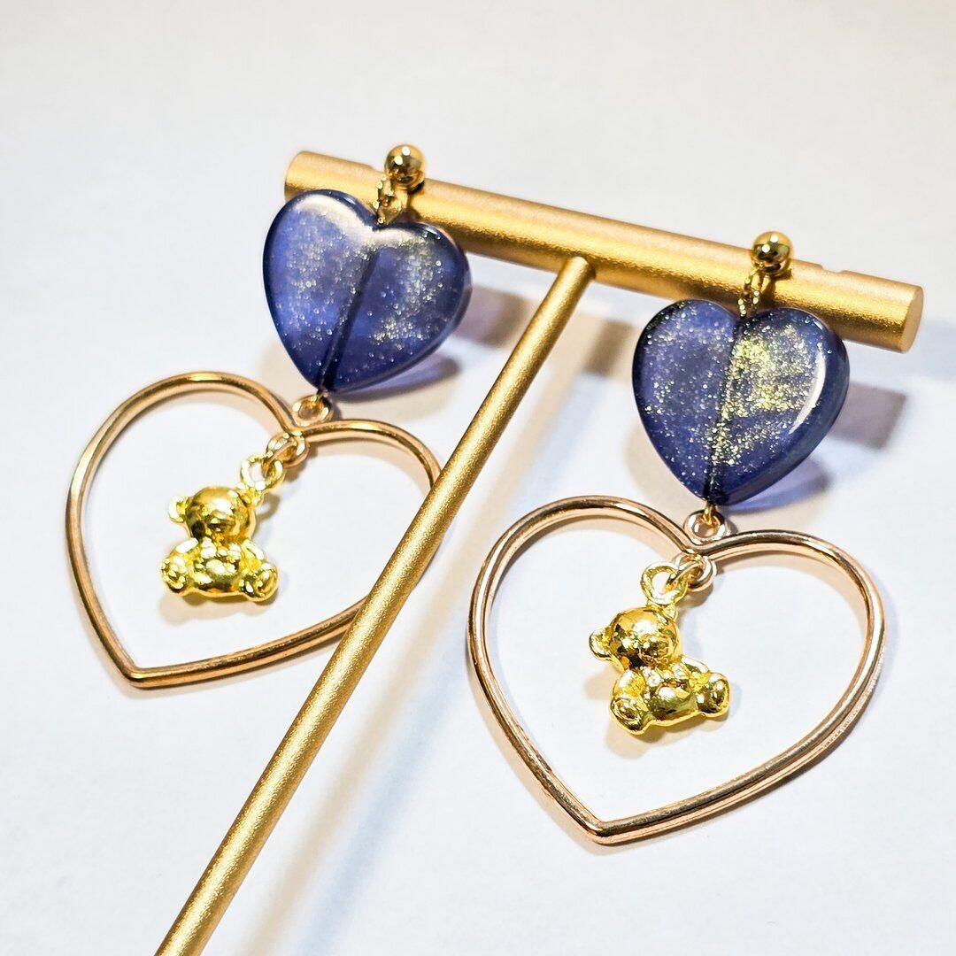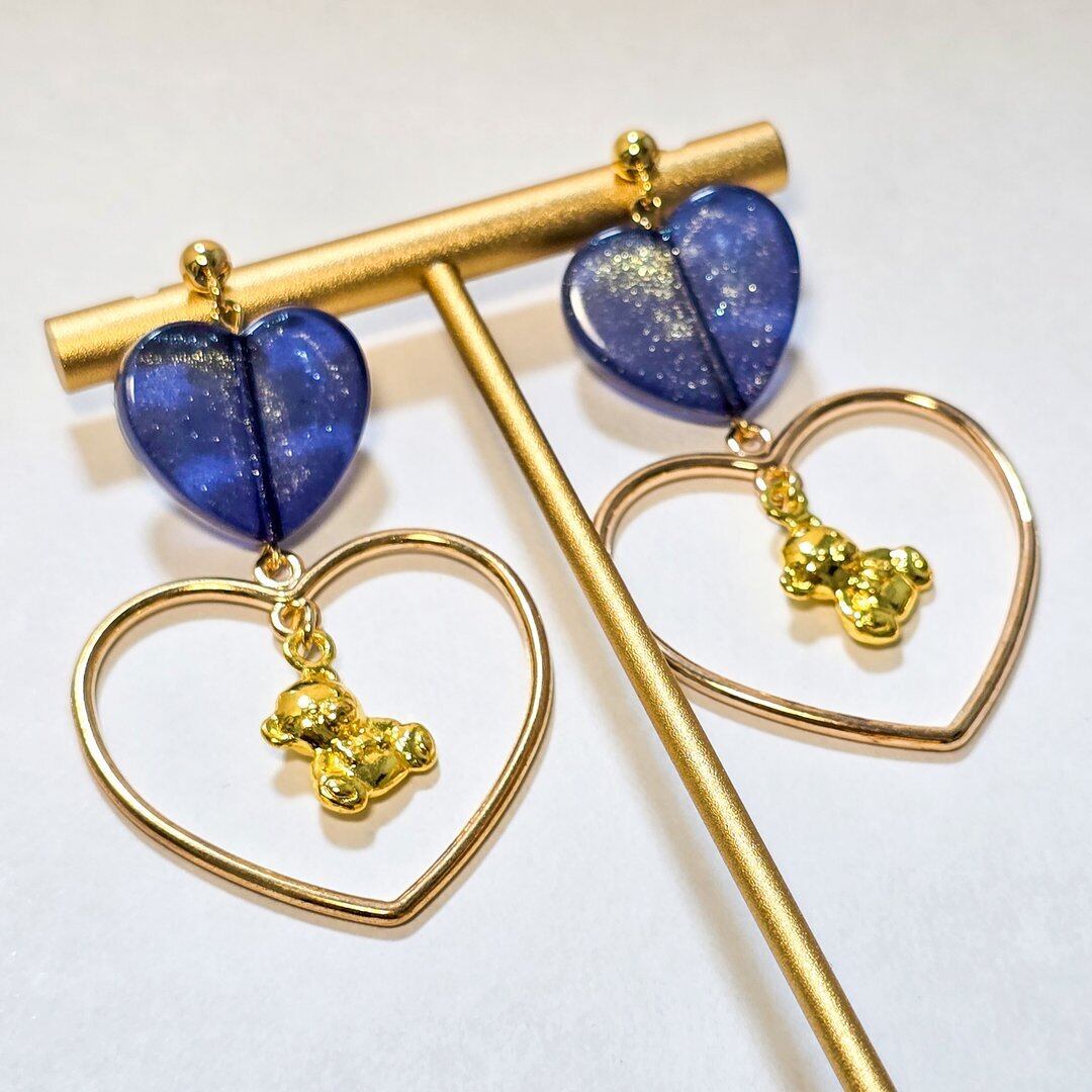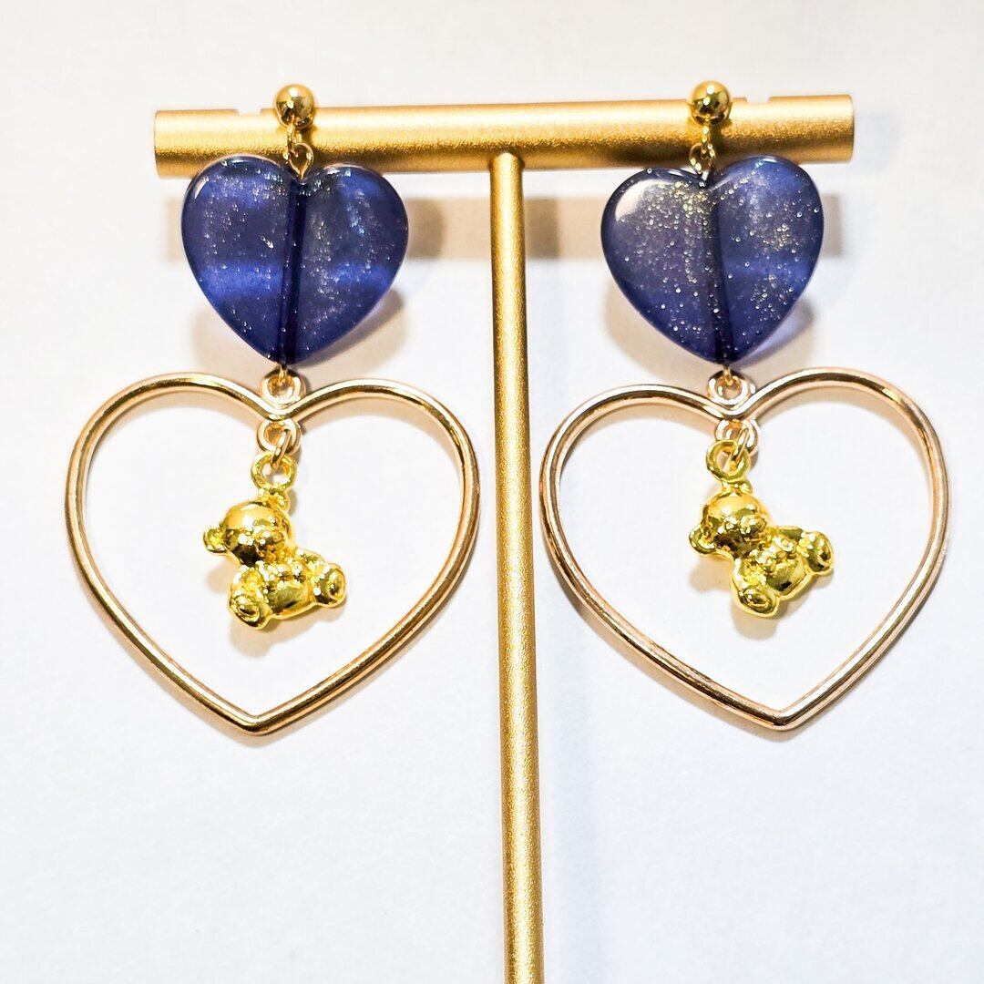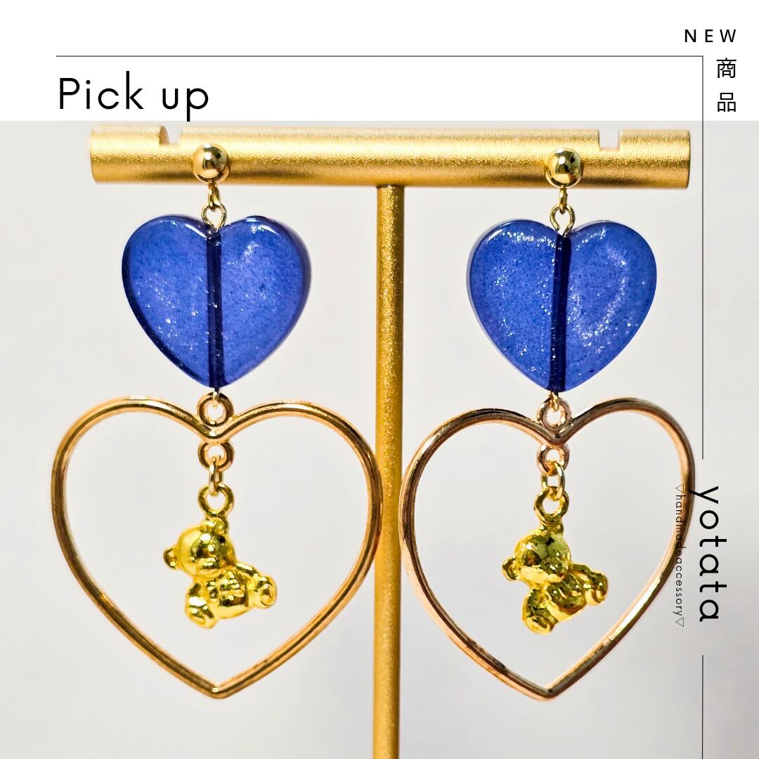 ⟬ ブルーのパール入りハートとゆらゆらくまさんのピアス&イヤリング ⟭