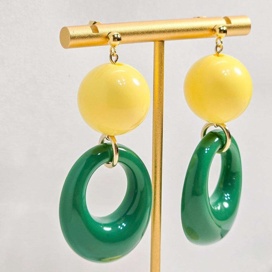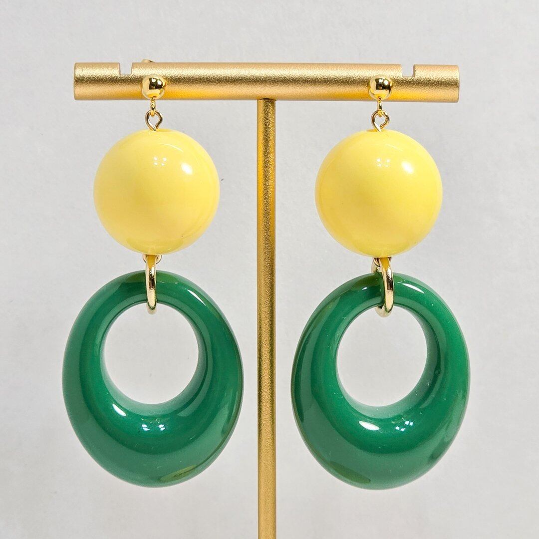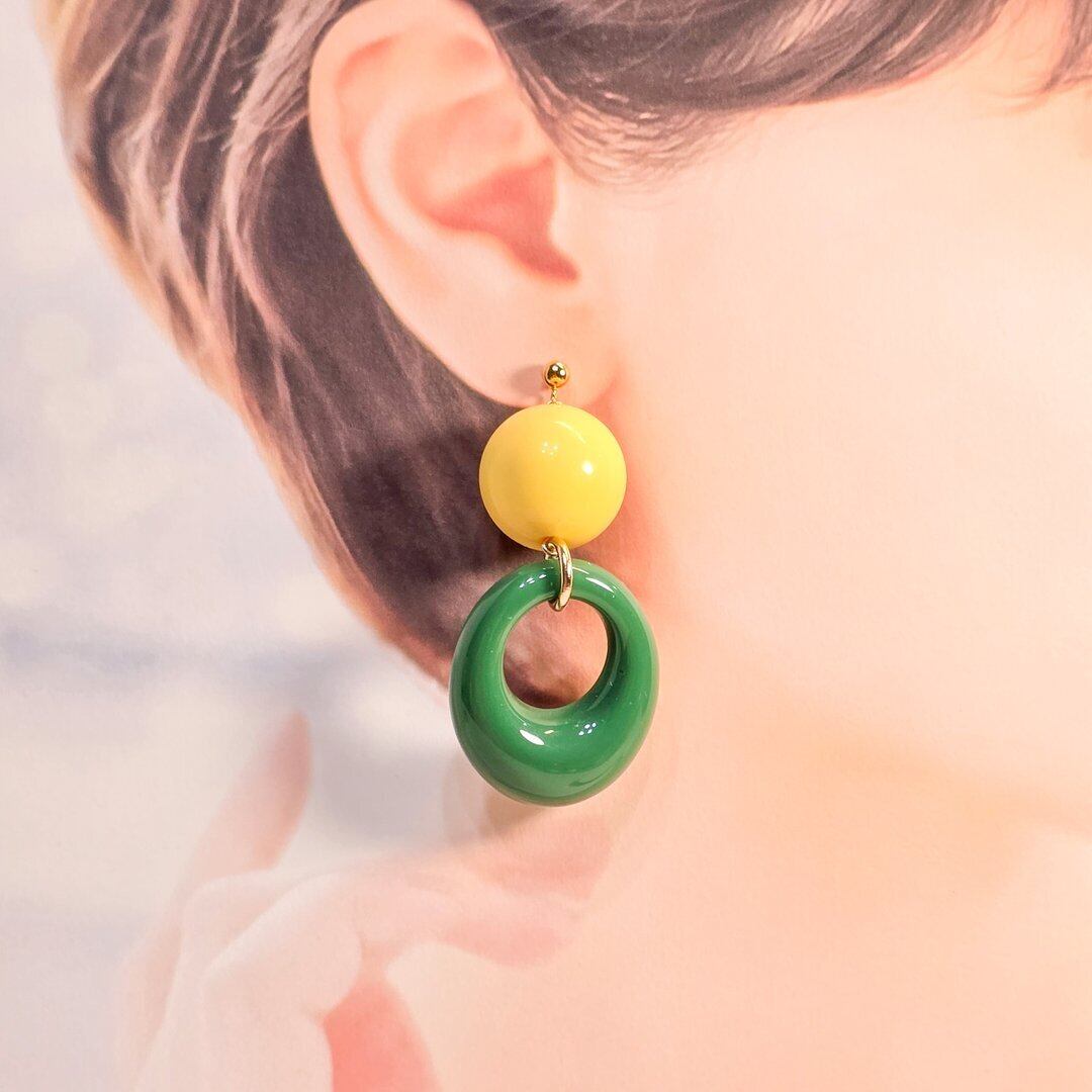 ⟬ 大ぶりレトロオーバルフープ(レモンイエロー×グリーン)ピアス&イヤリング ⟭