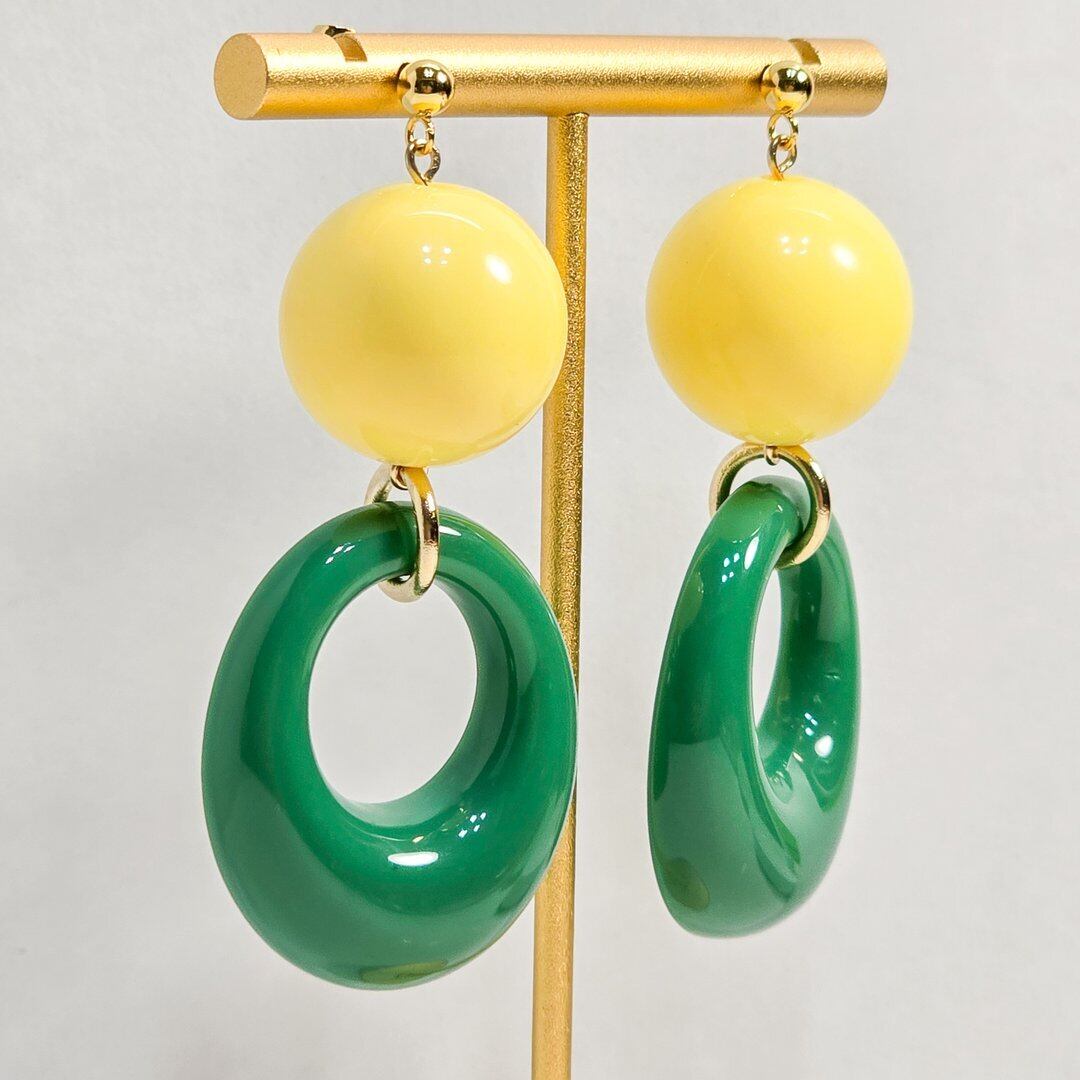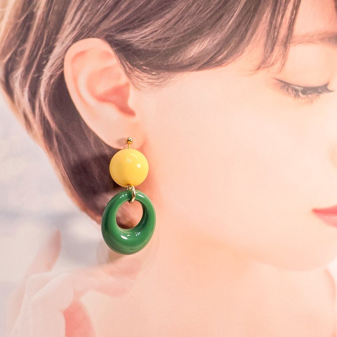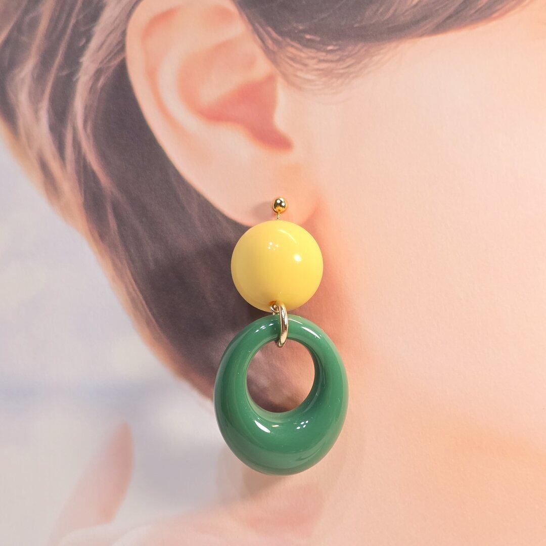 ⟬ 大ぶりレトロオーバルフープ(レモンイエロー×グリーン)ピアス&イヤリング ⟭