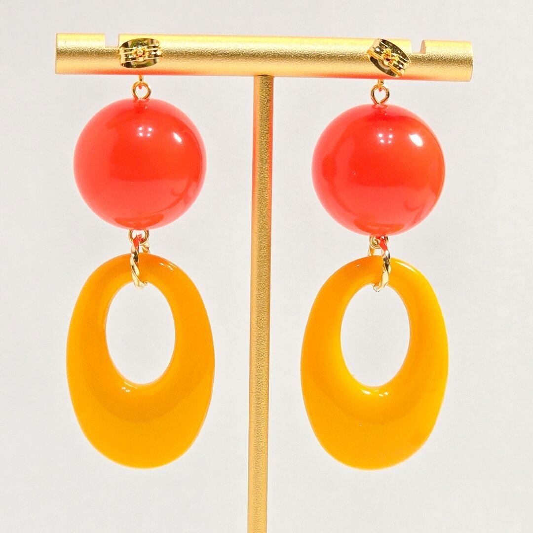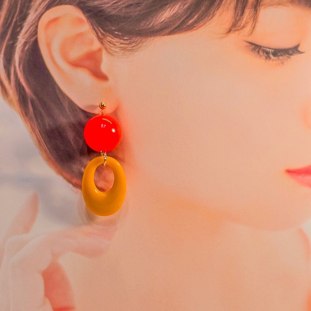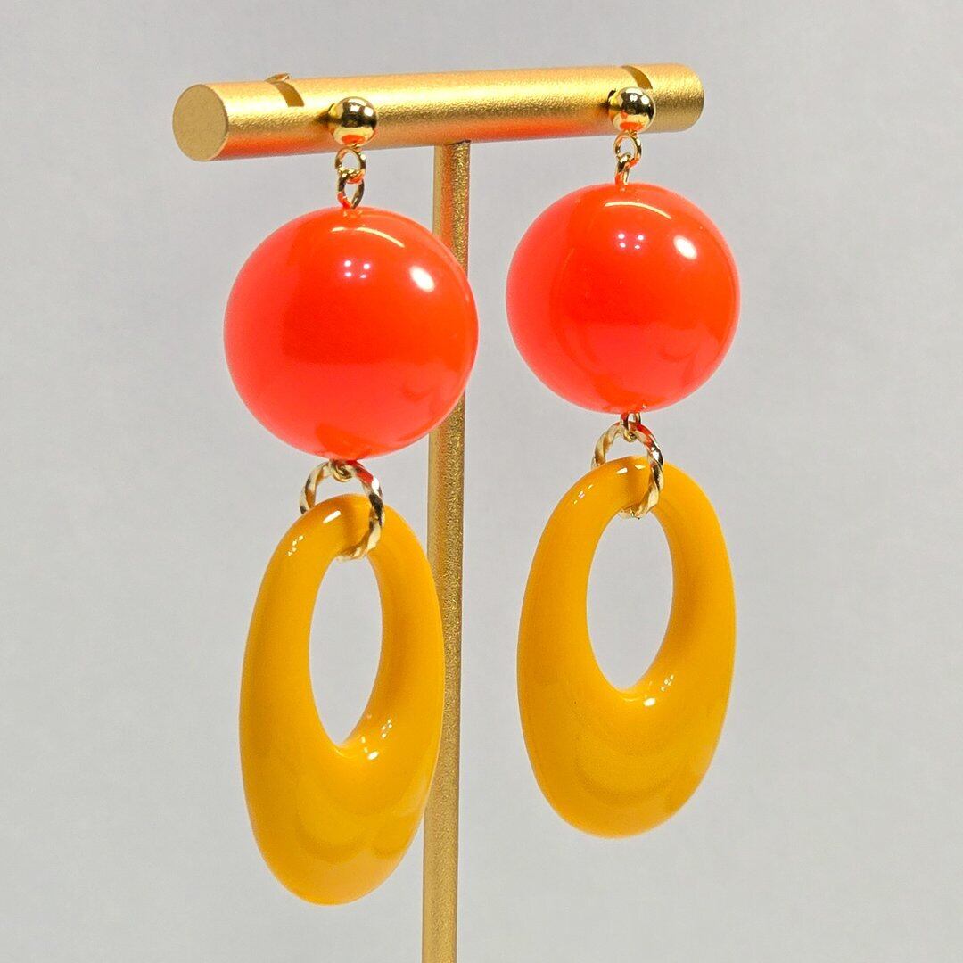 ⟬ 大ぶりレトロオーバルフープ(ビビットオレンジ×イエロー)ピアス&イヤリング ⟭
