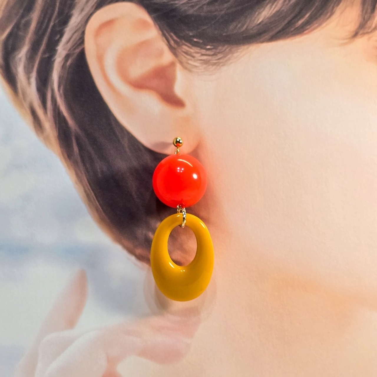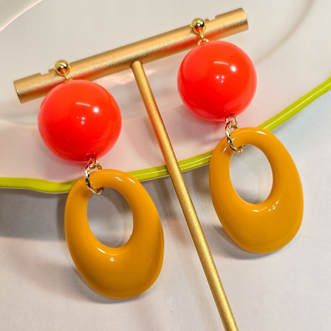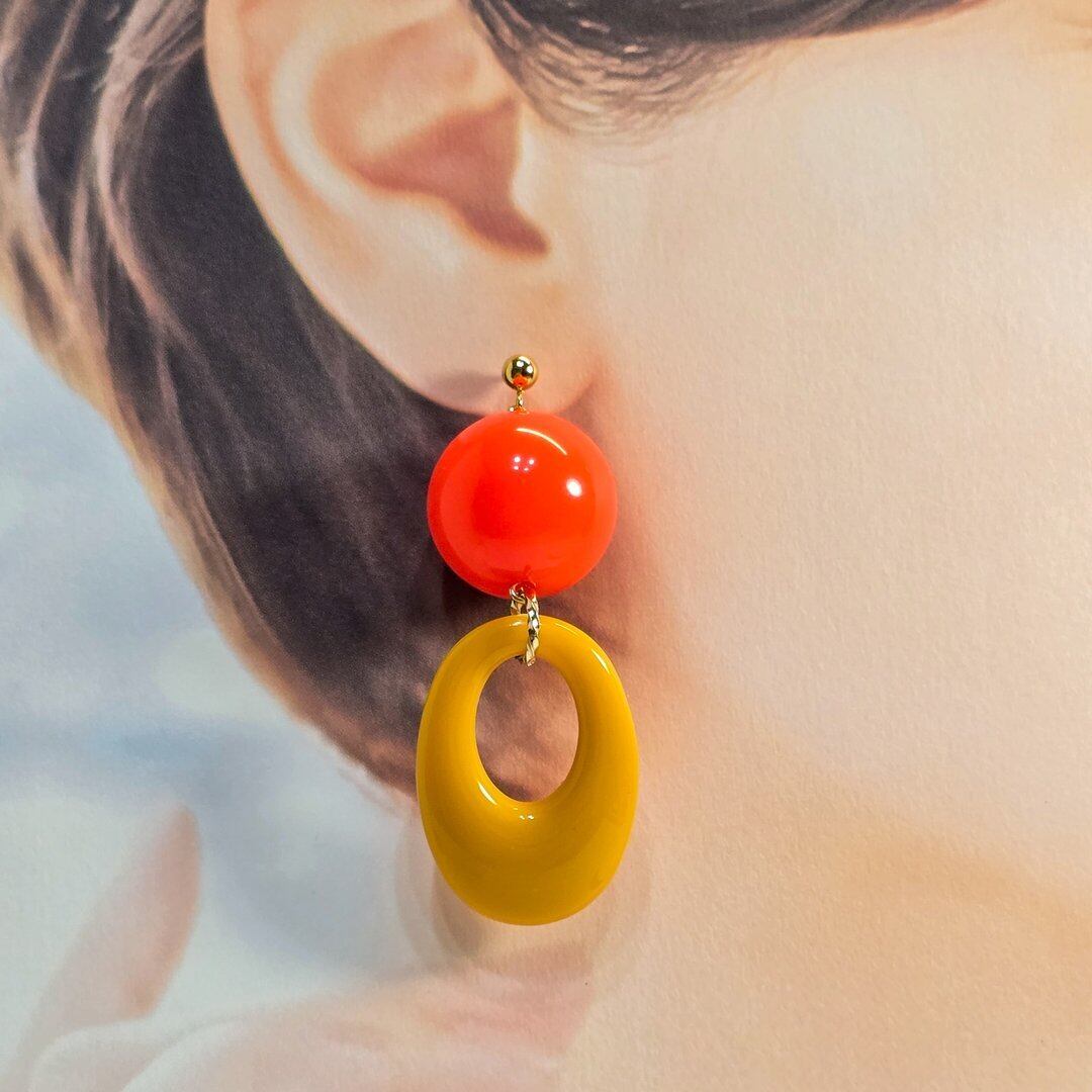 ⟬ 大ぶりレトロオーバルフープ(ビビットオレンジ×イエロー)ピアス&イヤリング ⟭