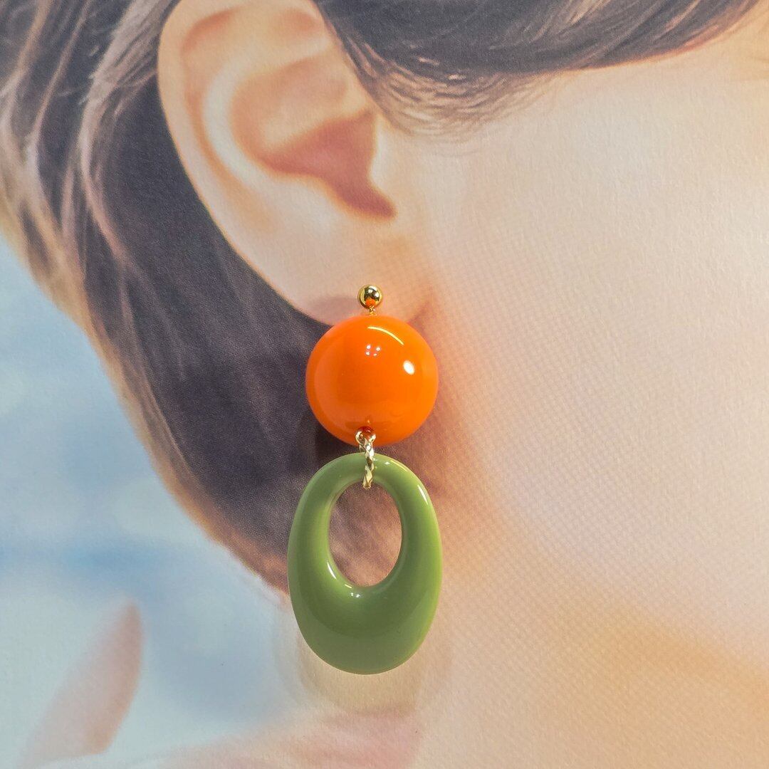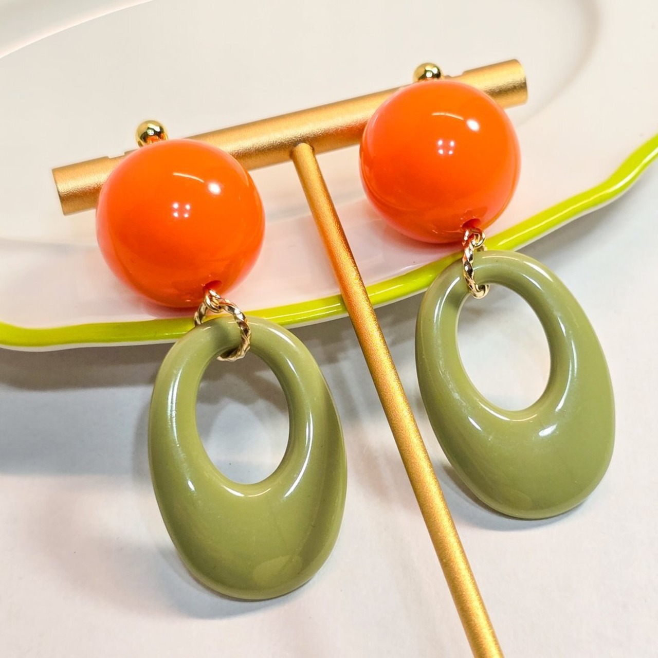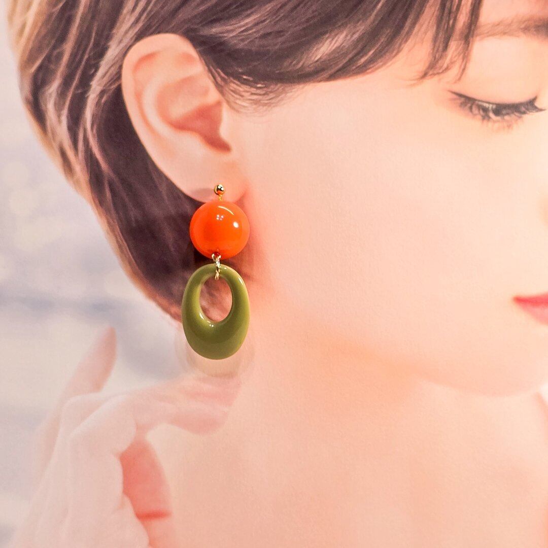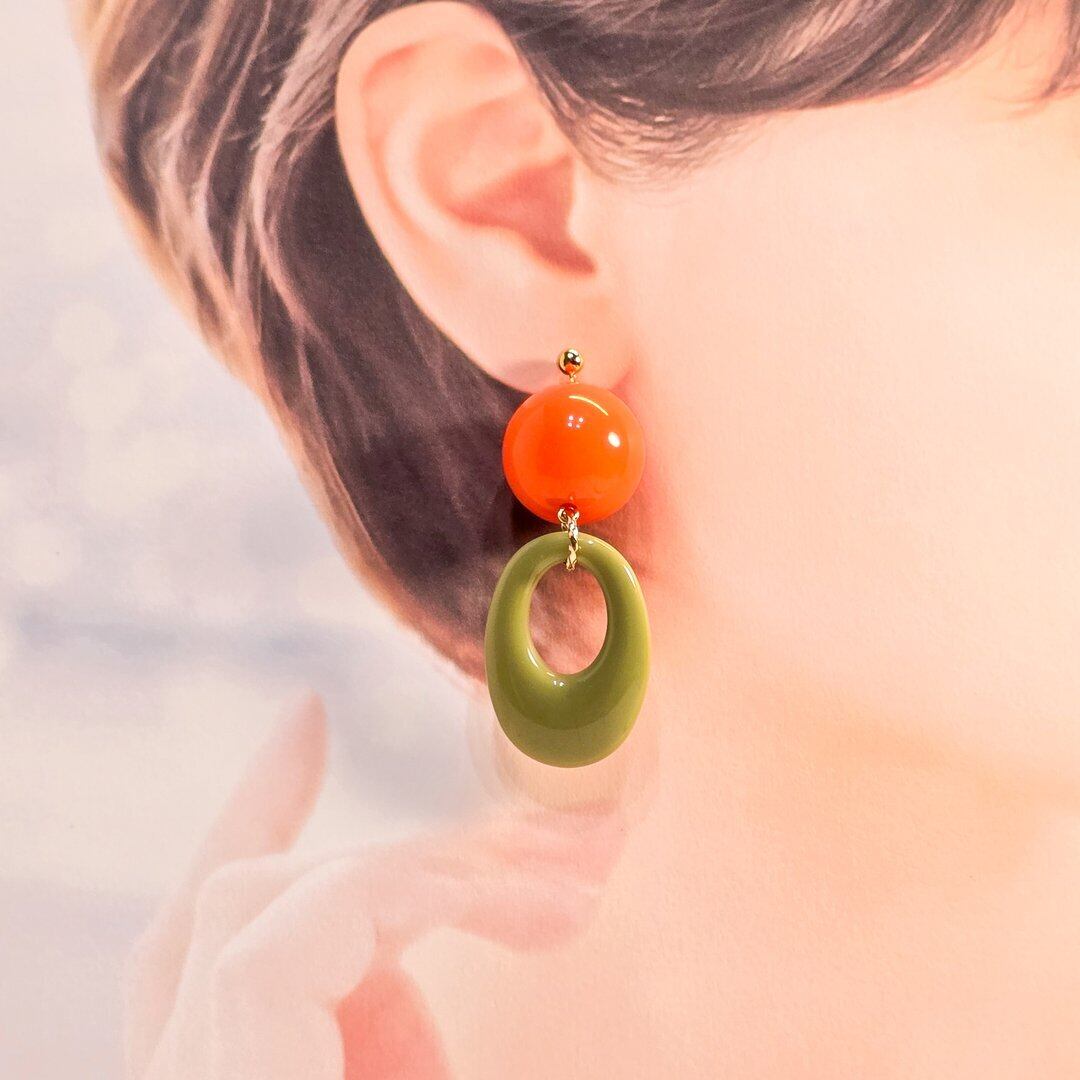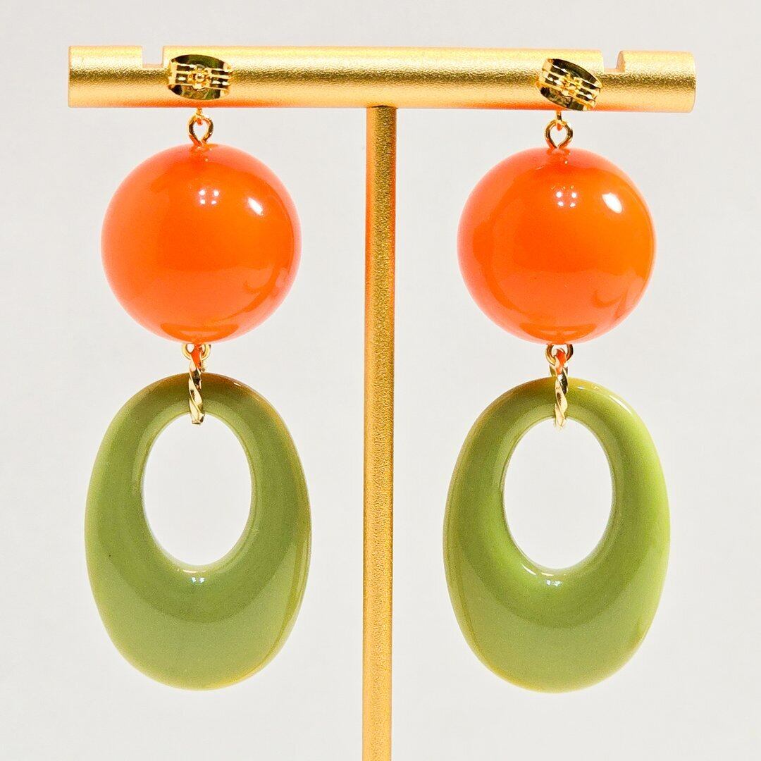 ⟬ 大ぶりレトロオーバルフープ(オレンジ×グリーン)ピアス&イヤリング ⟭