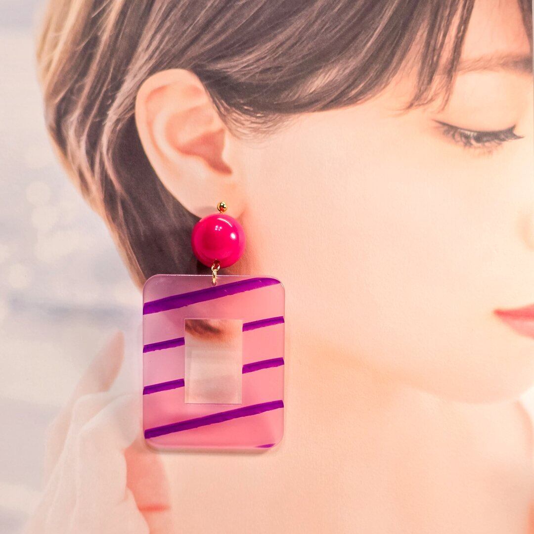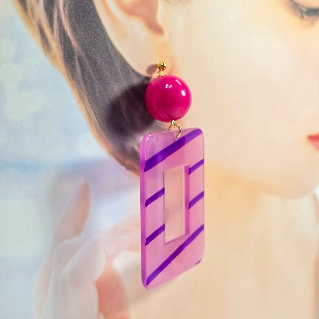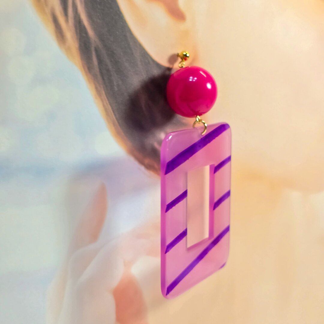 ⟬大ぶりのスクエアレトロフープ(ビビットピンク×ピンクパープル)ピアス&イヤリング ⟭