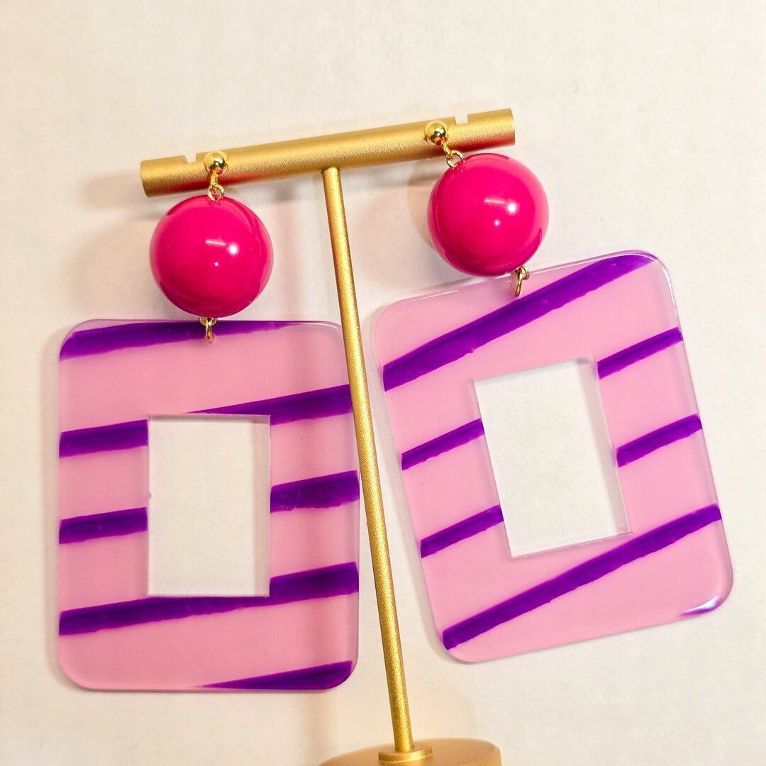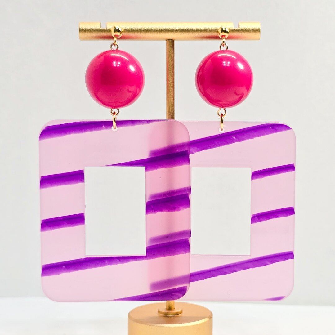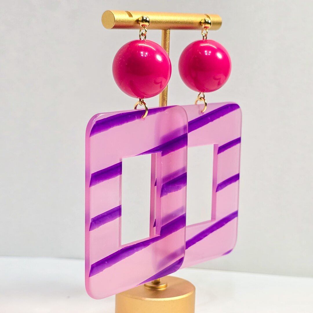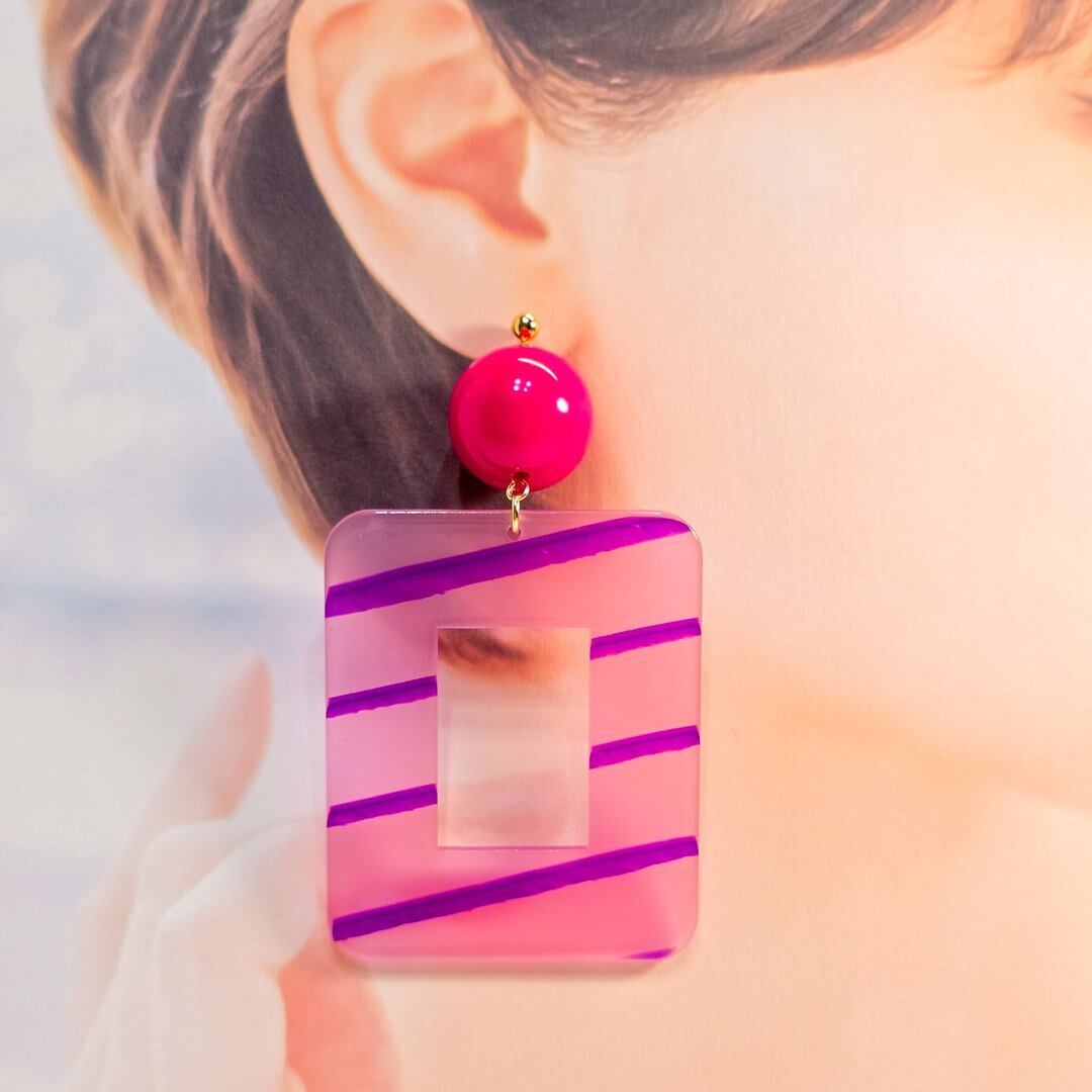 ⟬大ぶりのスクエアレトロフープ(ビビットピンク×ピンクパープル)ピアス&イヤリング ⟭
