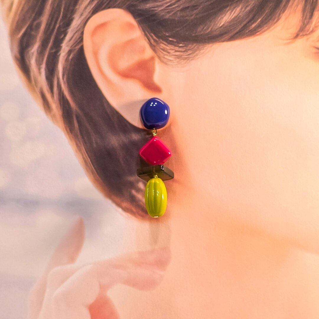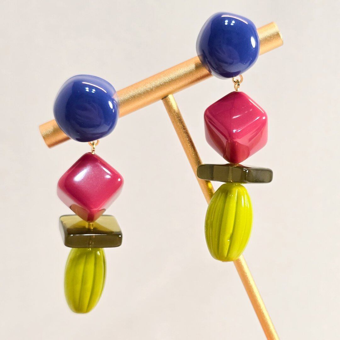 変形のカボションにキューブ型のアクリル、正方形のアクリルと筋入りガラスの様々な素材を用いたアクセサリーです!