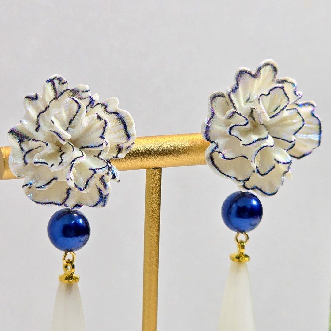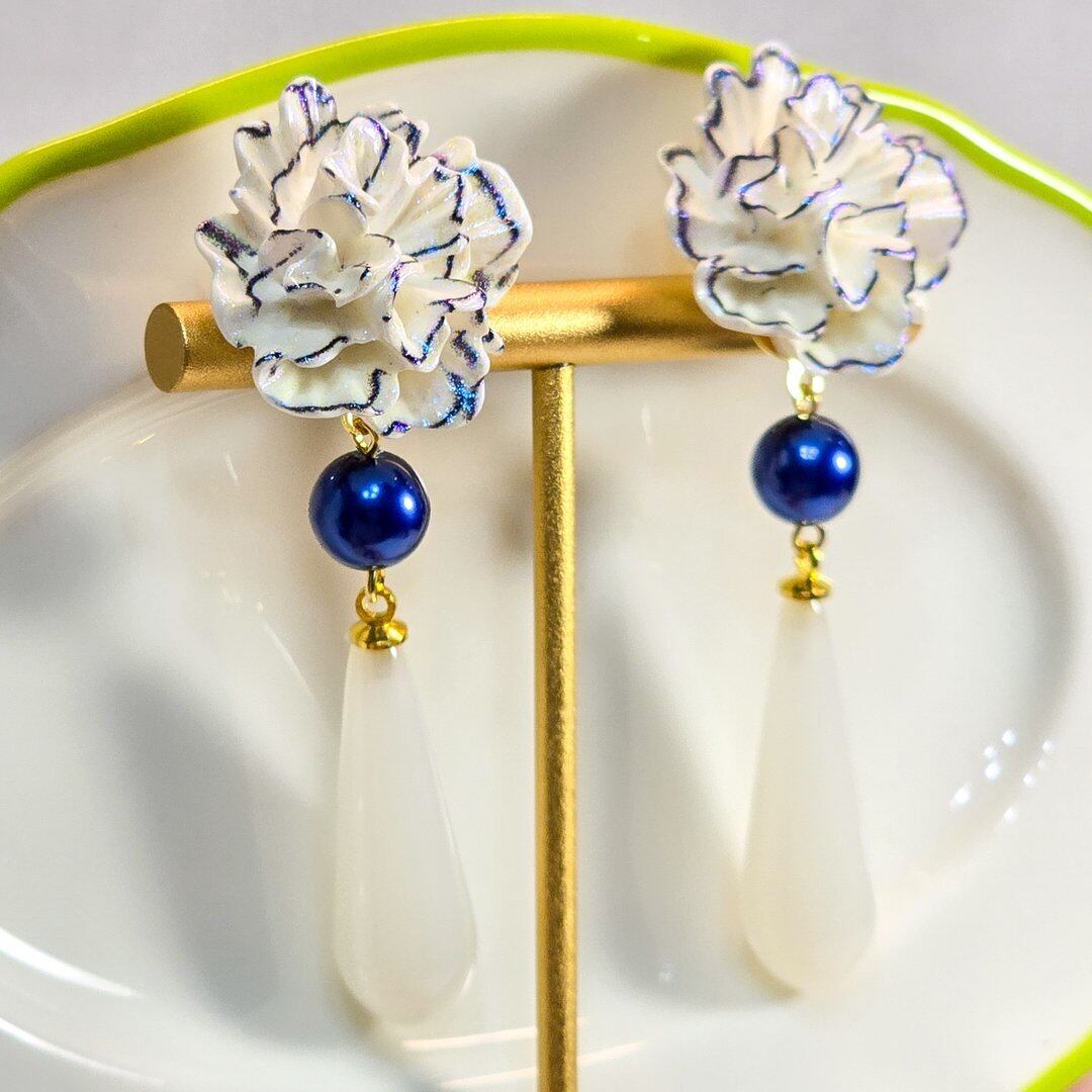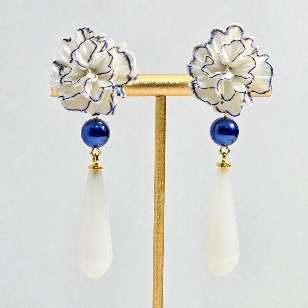 そこにネイビーのシルキーパール、ホワイトのドロップを付けた上品なデザインのピアス&イヤリング❁