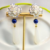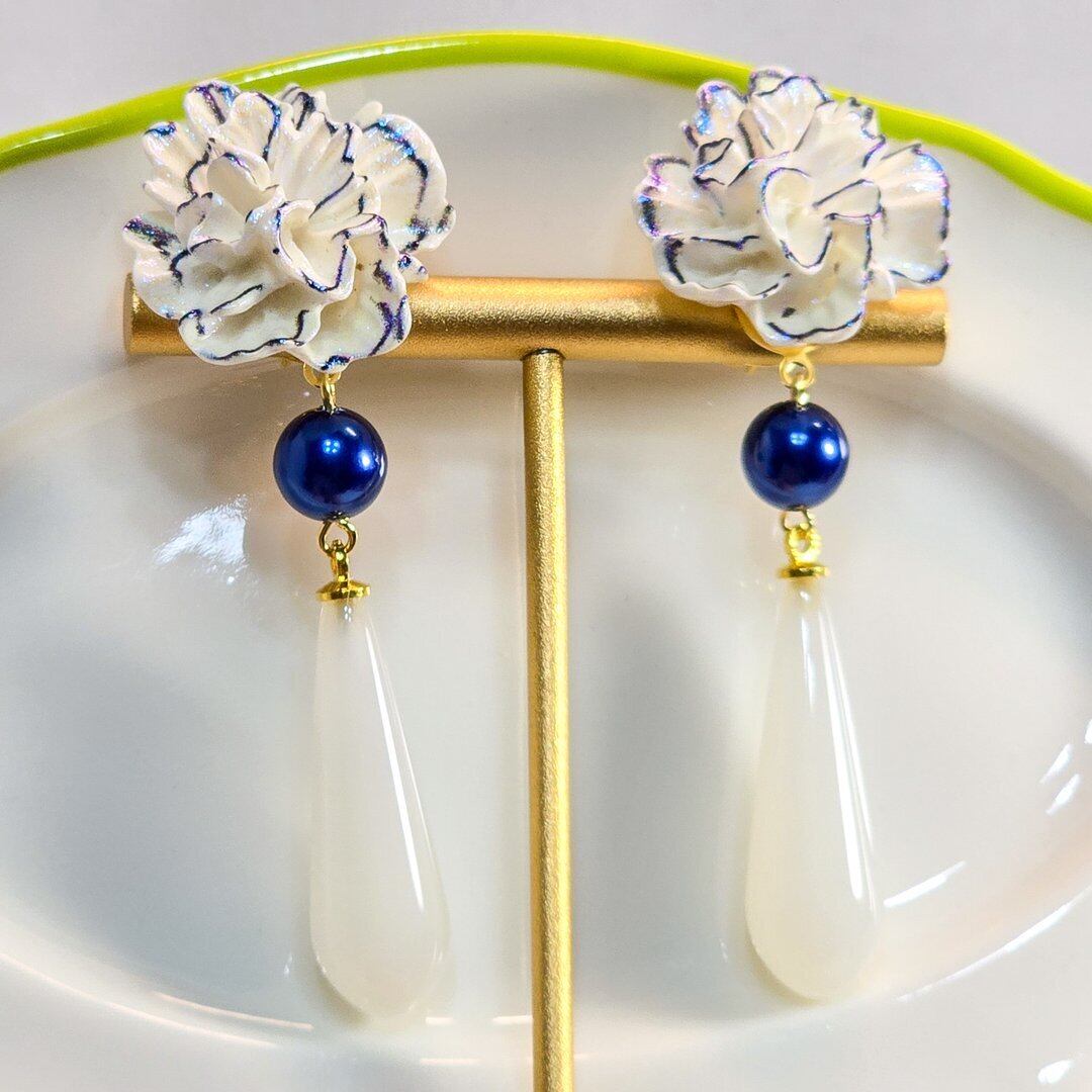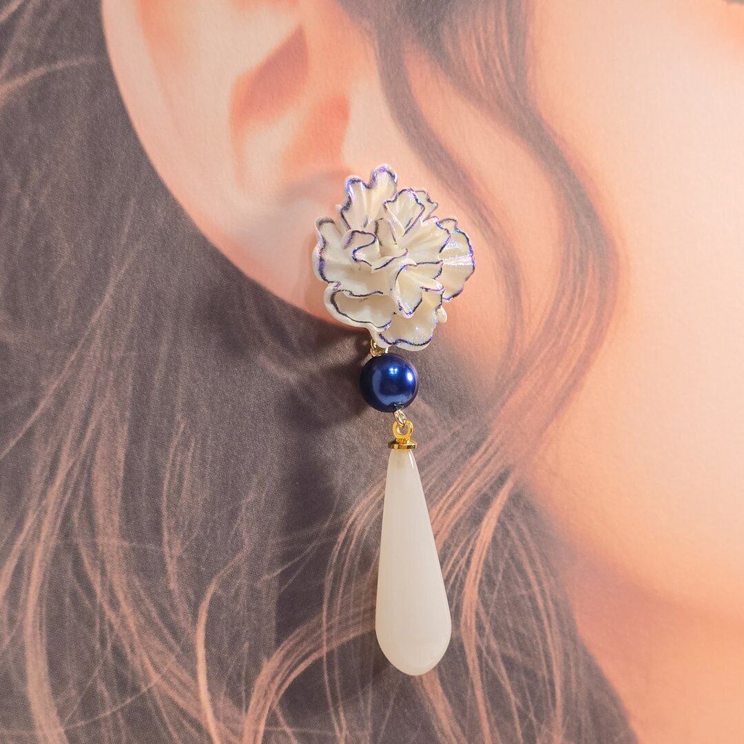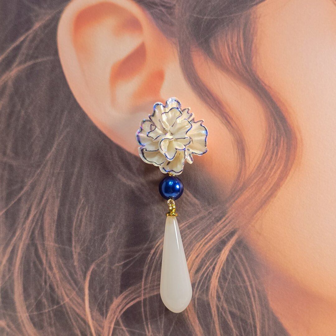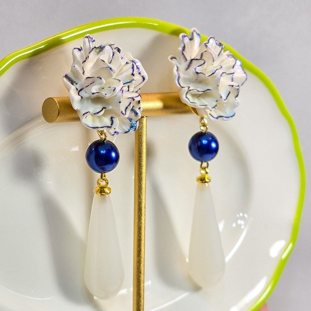 そこにネイビーのシルキーパール、ホワイトのドロップを付けた上品なデザインのピアス&イヤリング❁