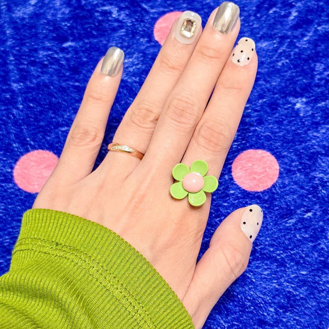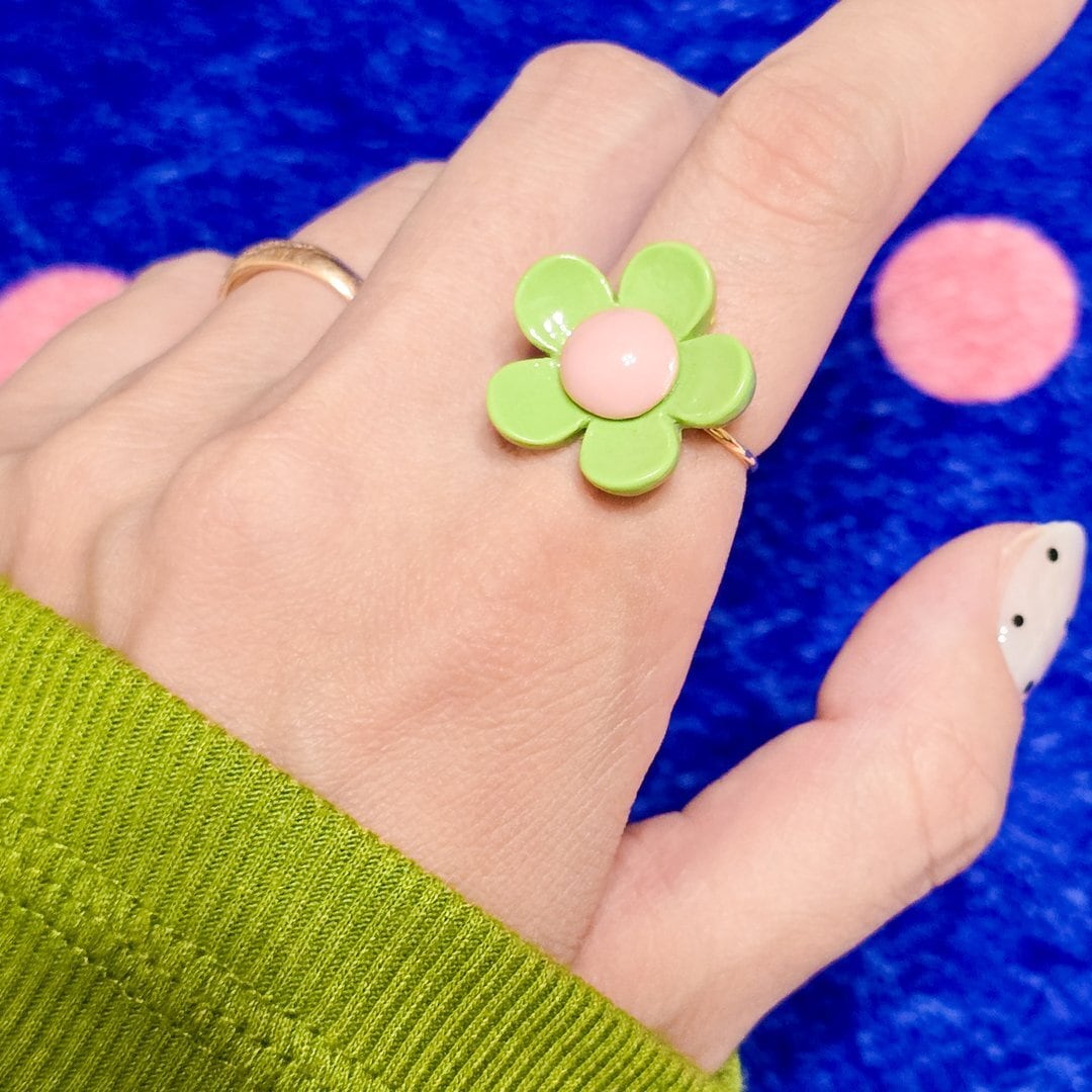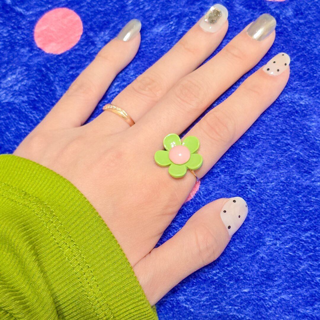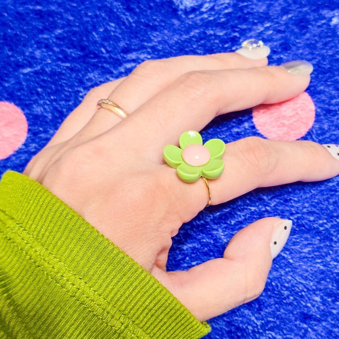 ピンクとグリーンのお花がレトロポップな雰囲気を醸し出す、かわいらしく愛らしいリングです!♡