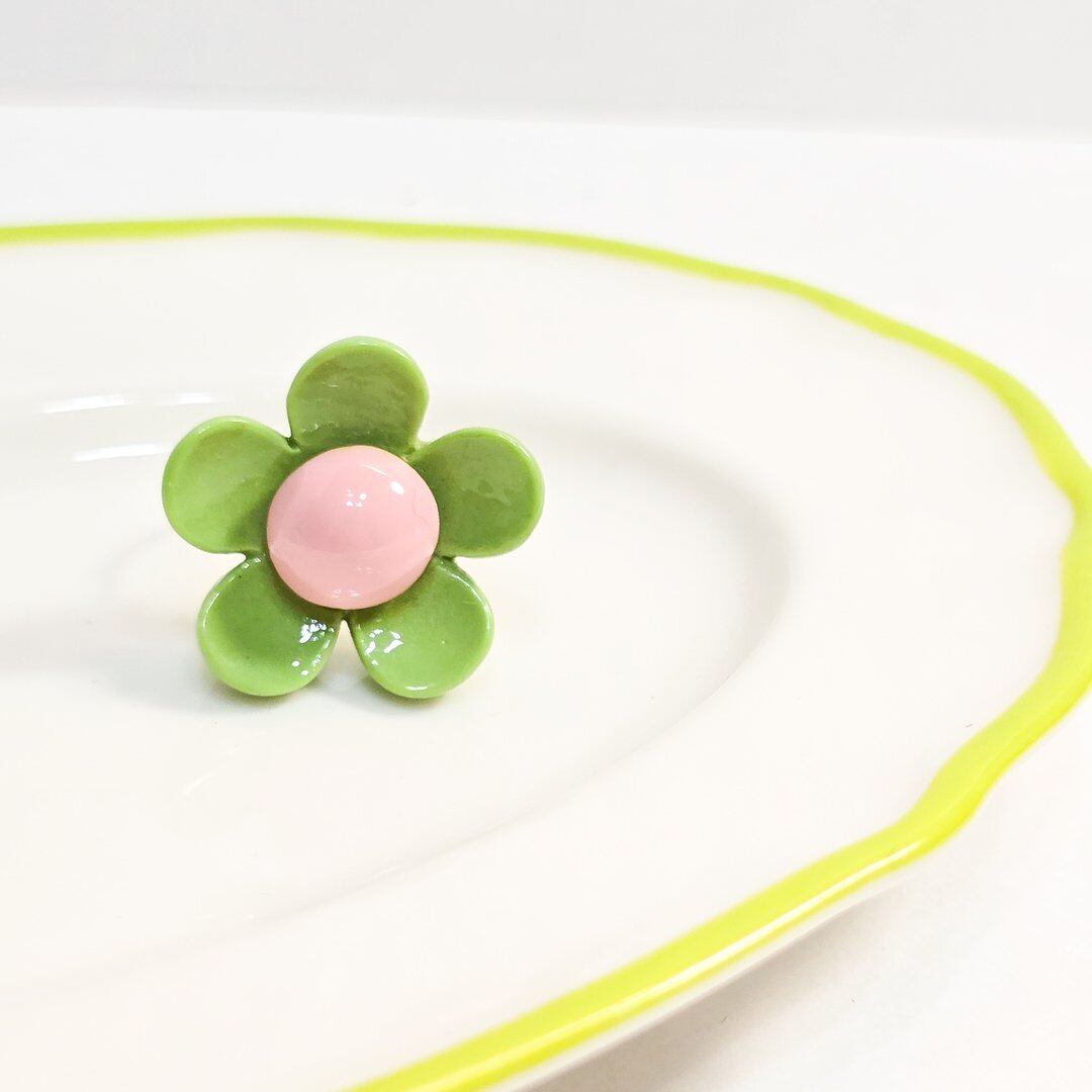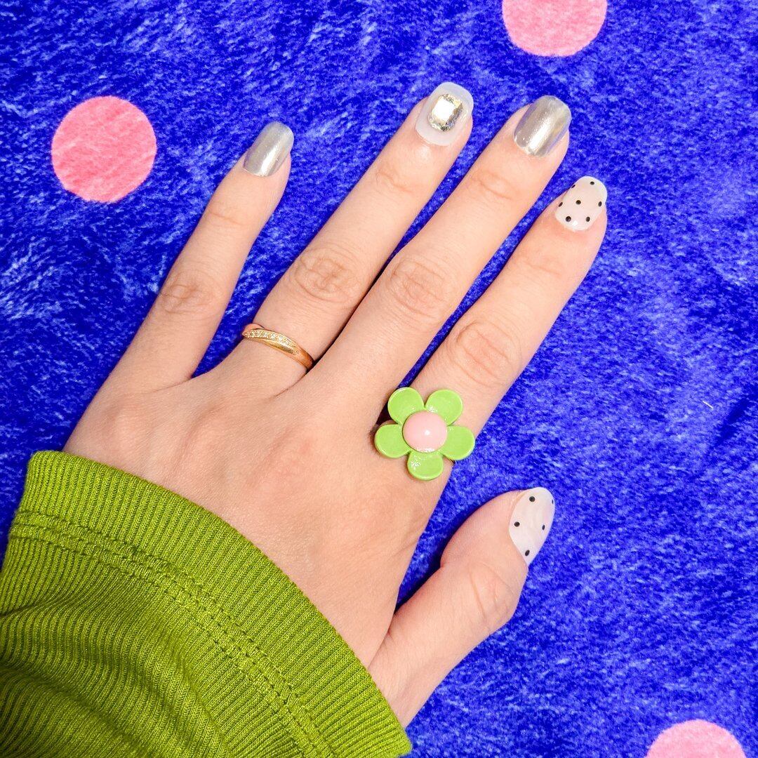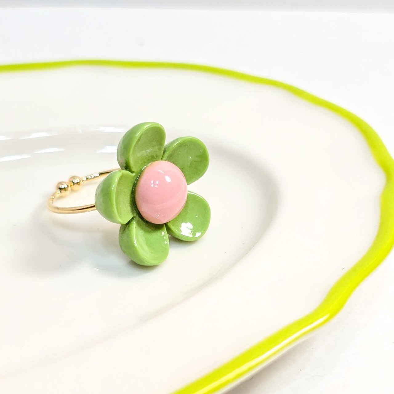 ピンクとグリーンのお花がレトロポップな雰囲気を醸し出す、かわいらしく愛らしいリングです!♡