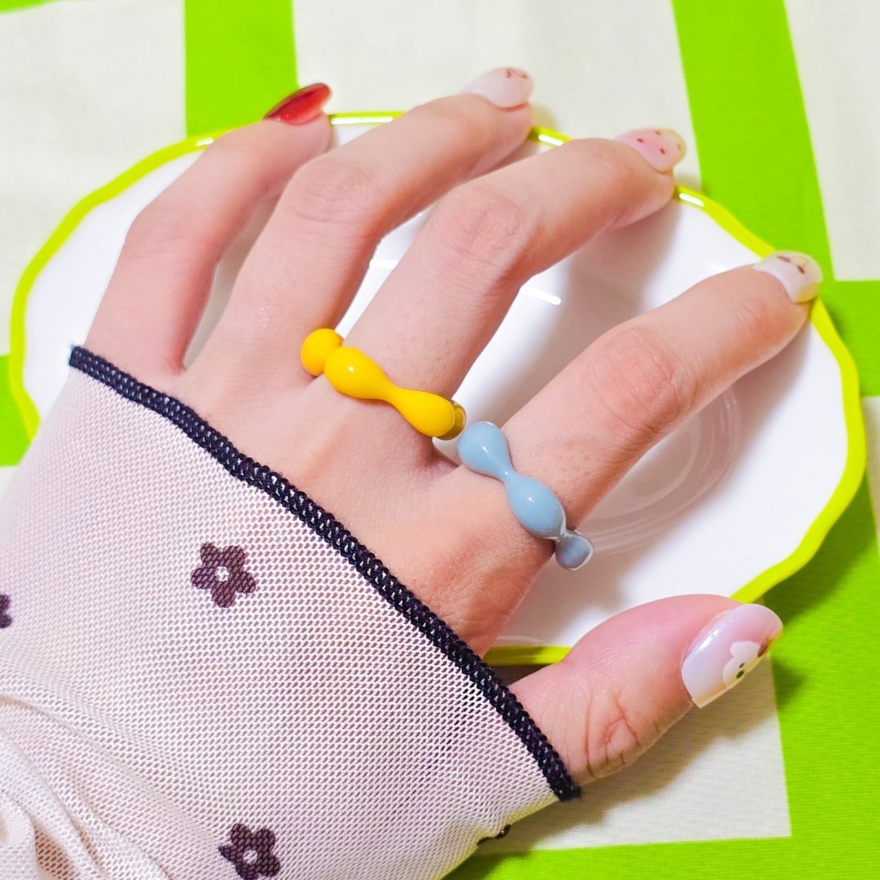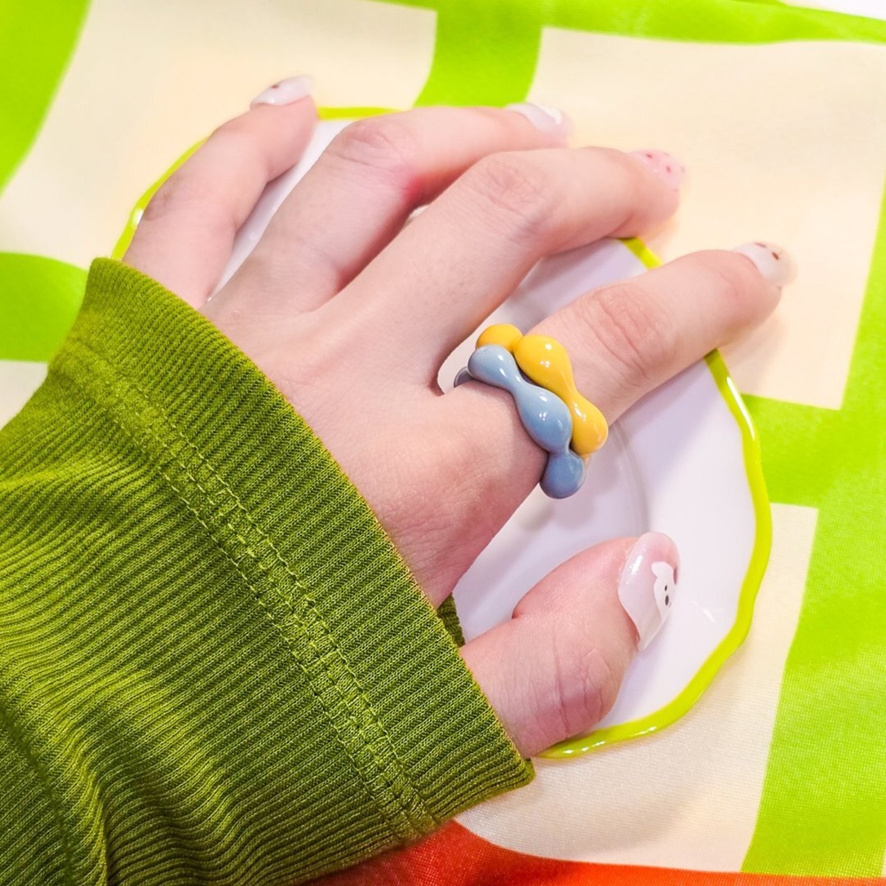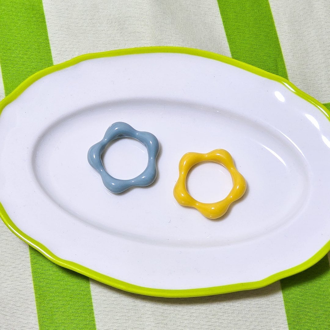 鮮やかな黄色のアクリル素材で作られたリングは、軽やかで着け心地も抜群★