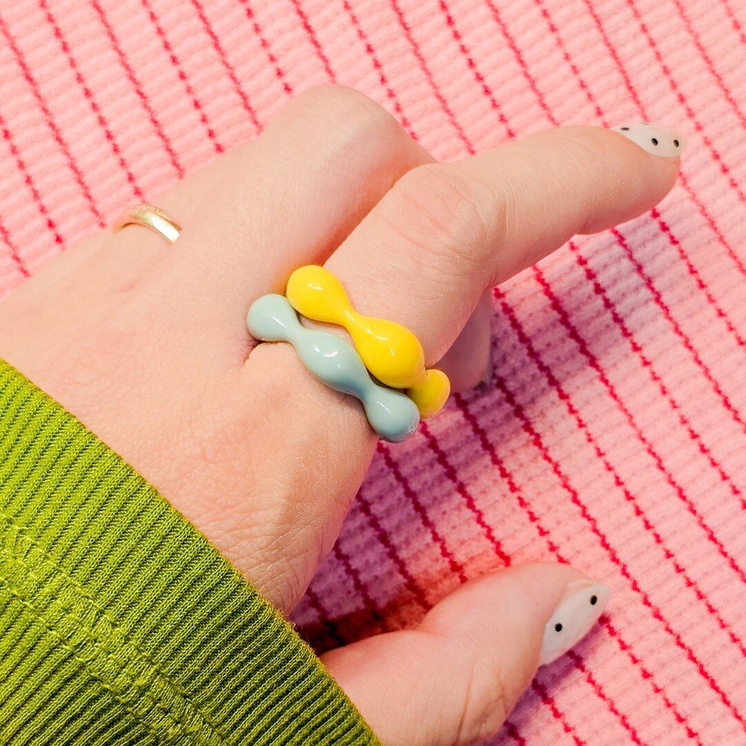 この「うねうねイエローリング」は、見る人を思わず微笑ませるレトロポップなデザインが魅力です!