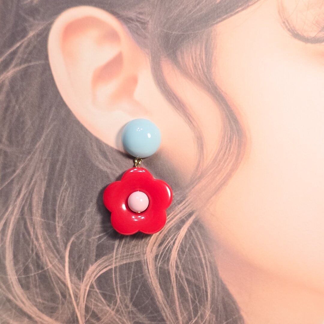 No.257レトロフラワー(レッド×ライトブルー)ピアス&イヤリングピアス&イヤリング