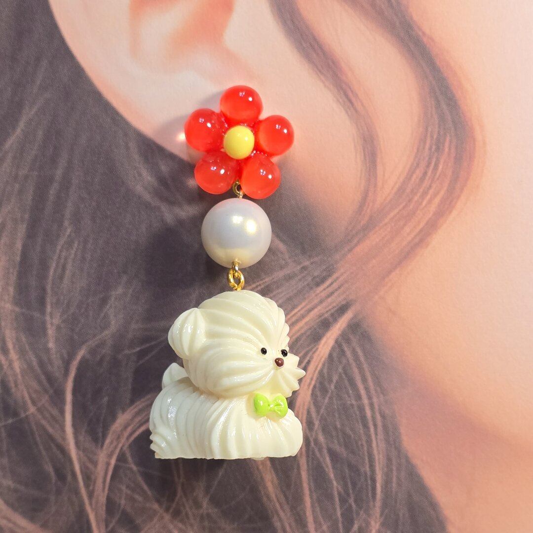 ⟬ ホイップわんちゃんのフラワーピアス&イヤリング(ピンクのわんちゃん) ⟭