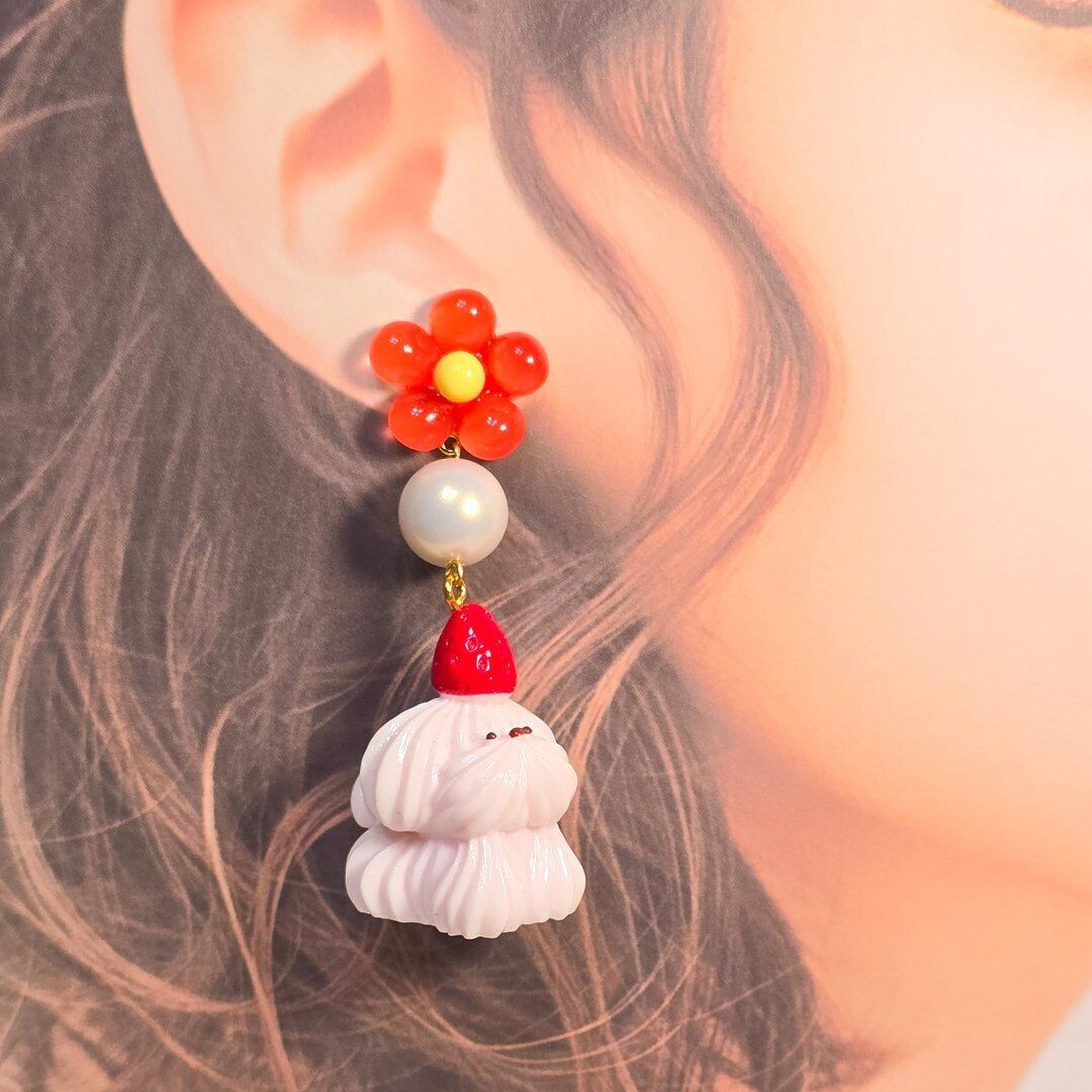 ⟬ ホイップわんちゃんのフラワーピアス&イヤリング(いちごのトッピングわんちゃん) ⟭