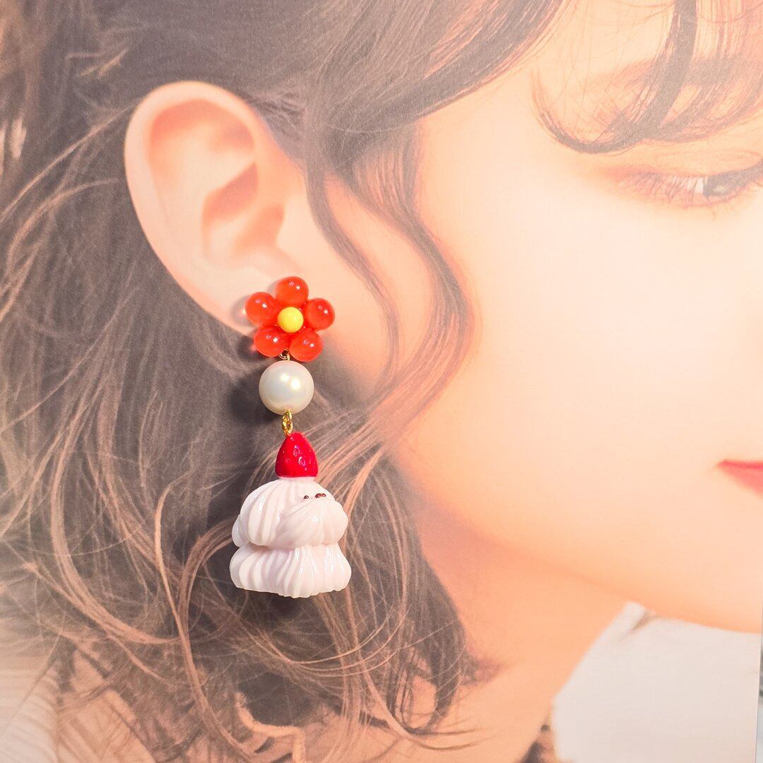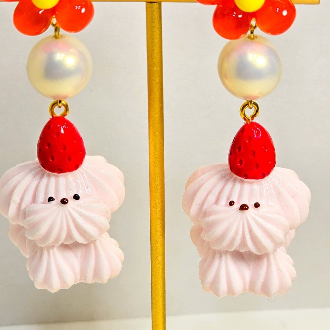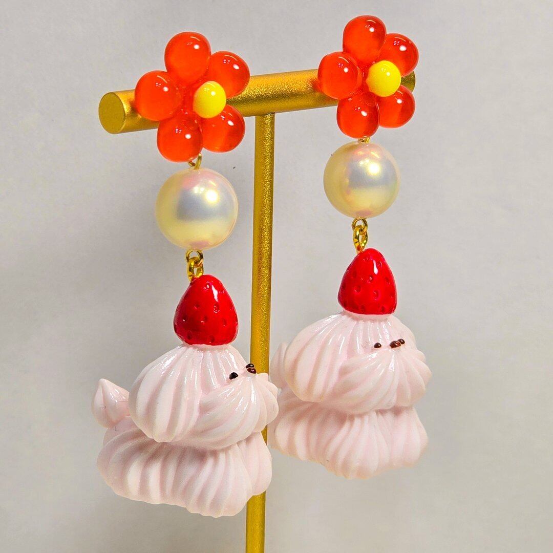 No.275 ホイップわんちゃんのフラワーピアス&イヤリング(いちごのトッピングわんちゃん)
