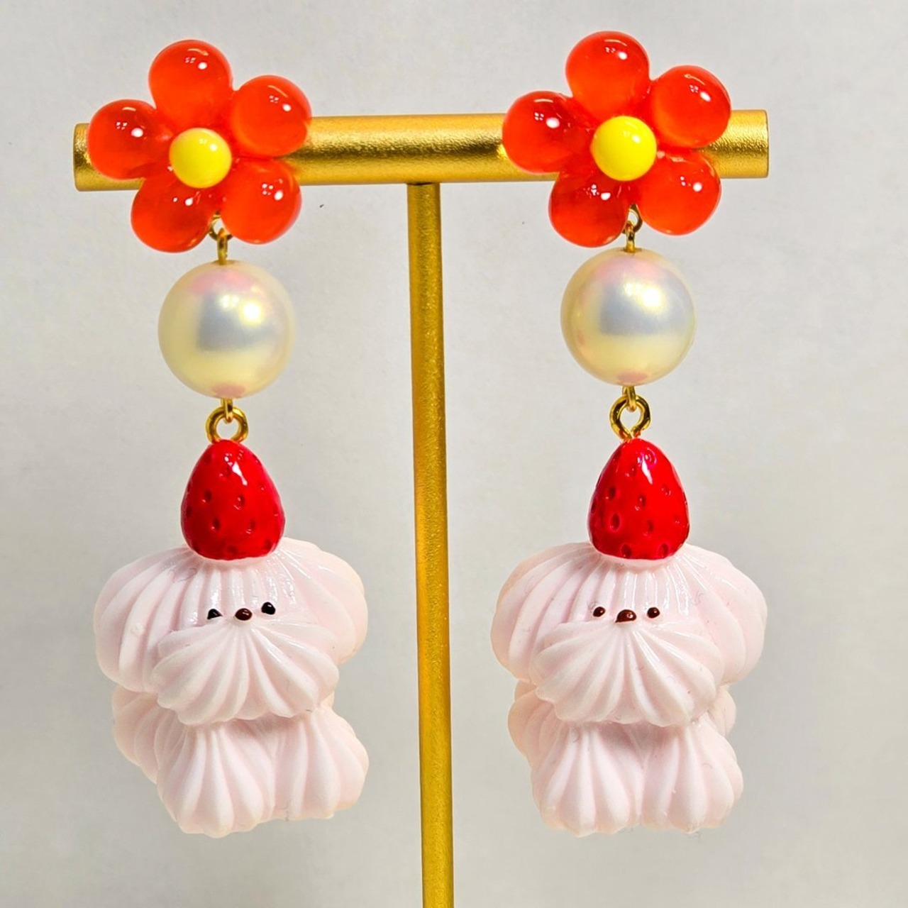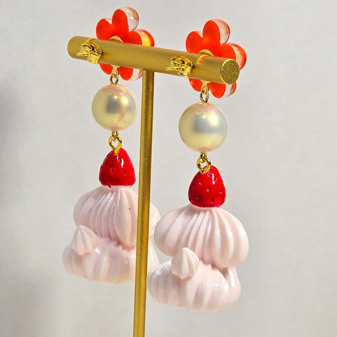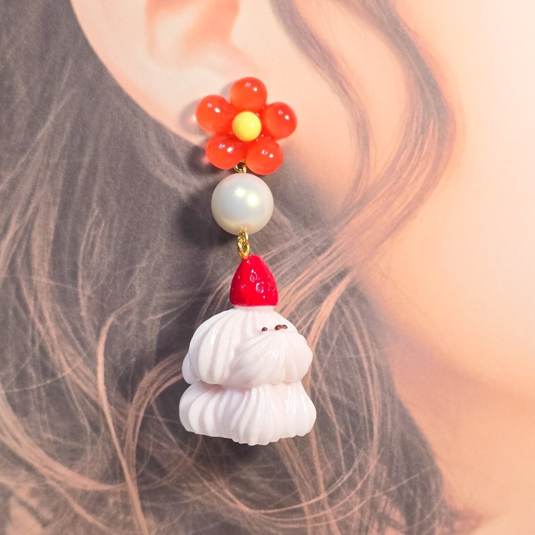 No.275 ホイップわんちゃんのフラワーピアス&イヤリング(いちごのトッピングわんちゃん)